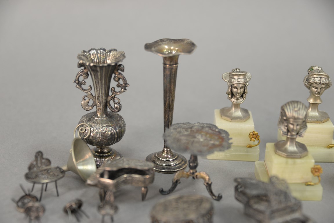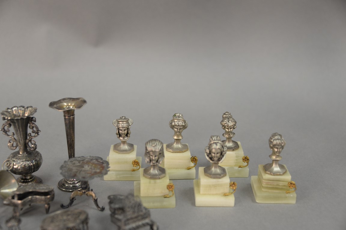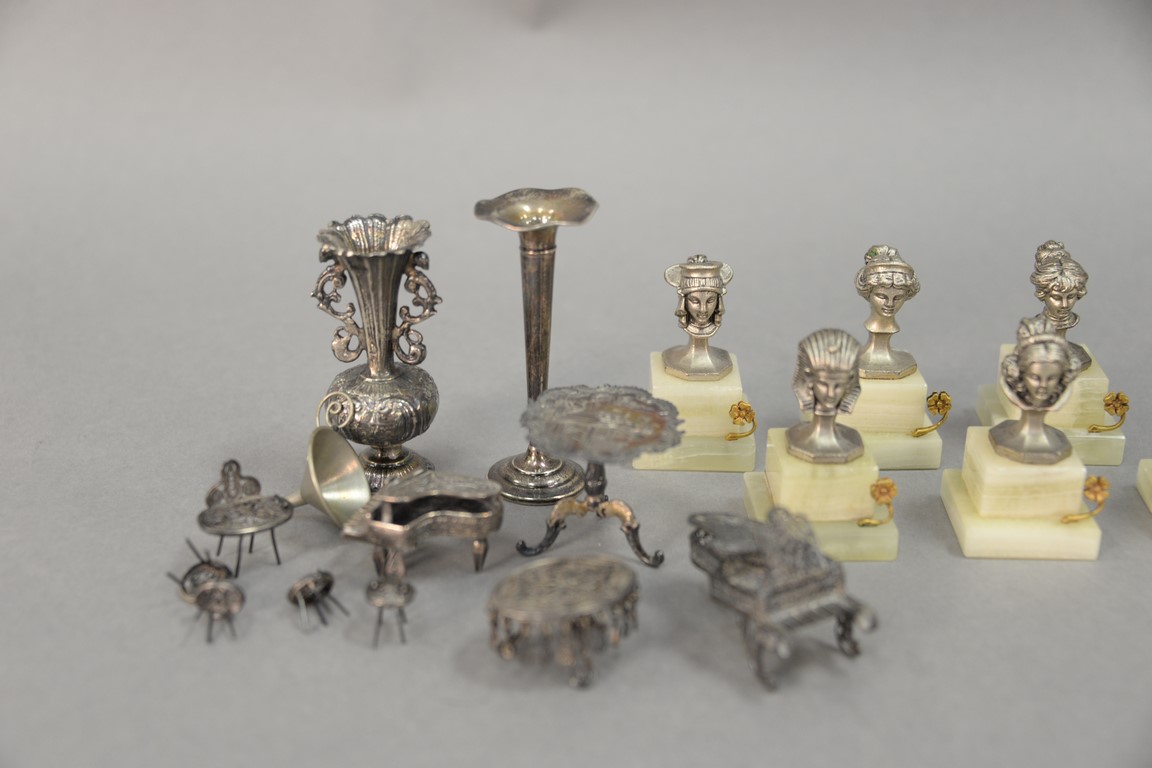 Group of silver miniature pieces including two sterling pianos, filigree silver table four chairs and a bench, sterling tall table, miniature bud vases, and eight .800 silver bust on alabaster base place card holders.