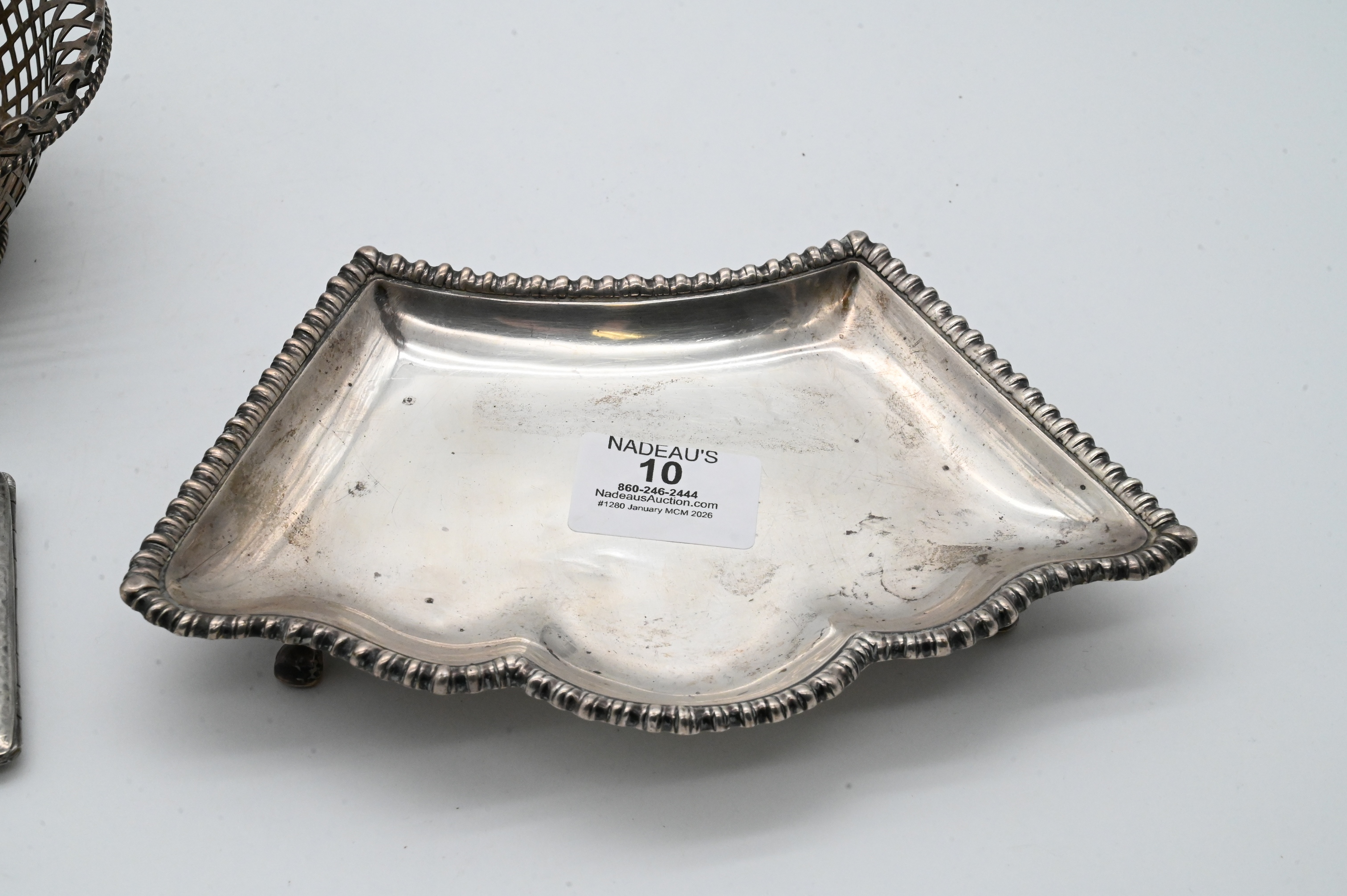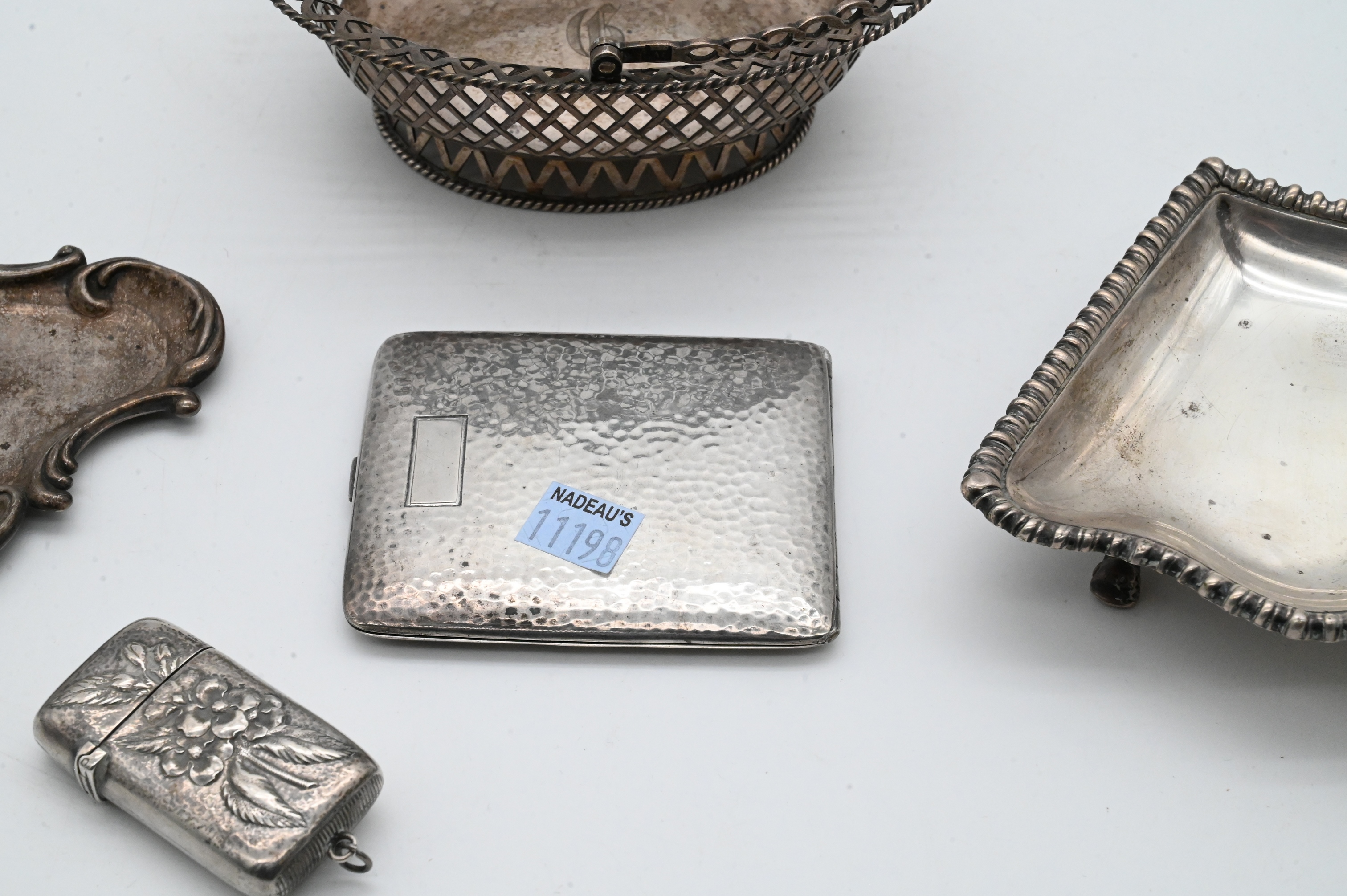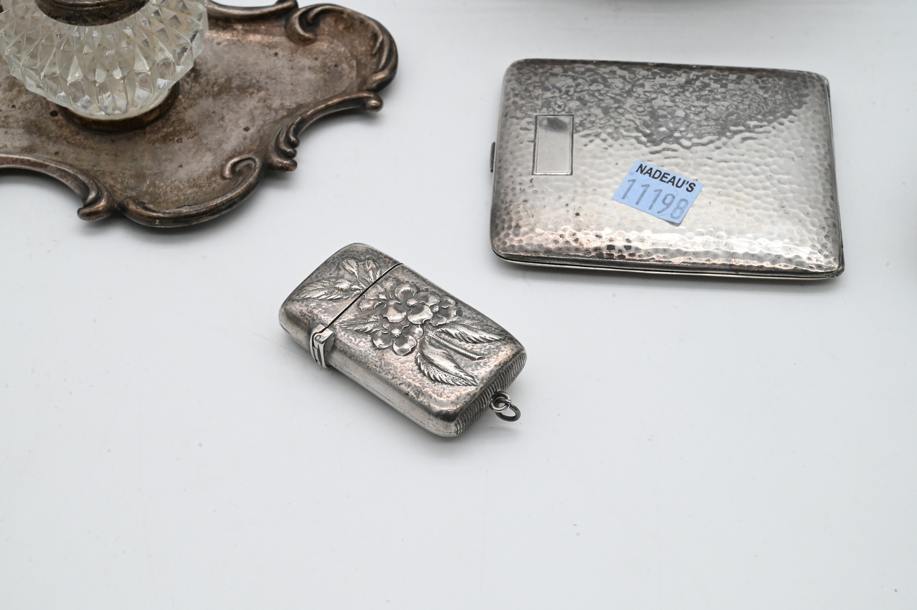 to include inkwell and tray, match safe, card case, pierced basket, and English footed tray