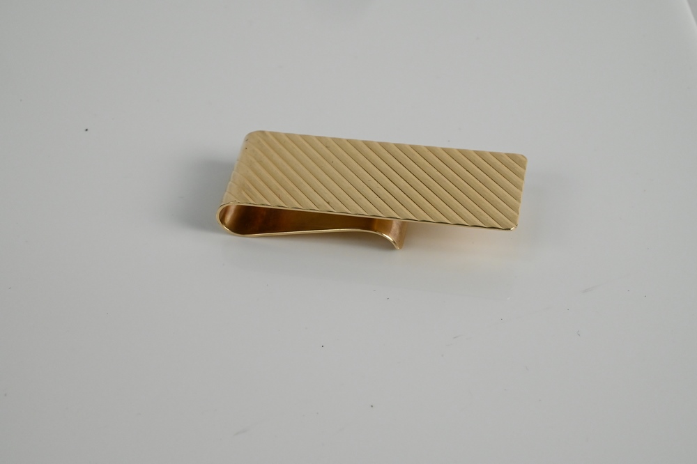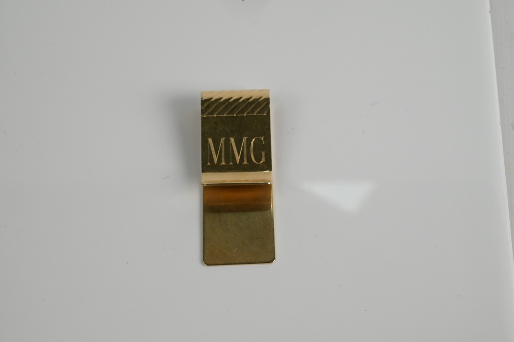 Lot 10: Lindsay 14 Karat Gold Money Clip, monogrammed MMG, marked Lindsay 14K, 13.7 grams, height 2 inches.