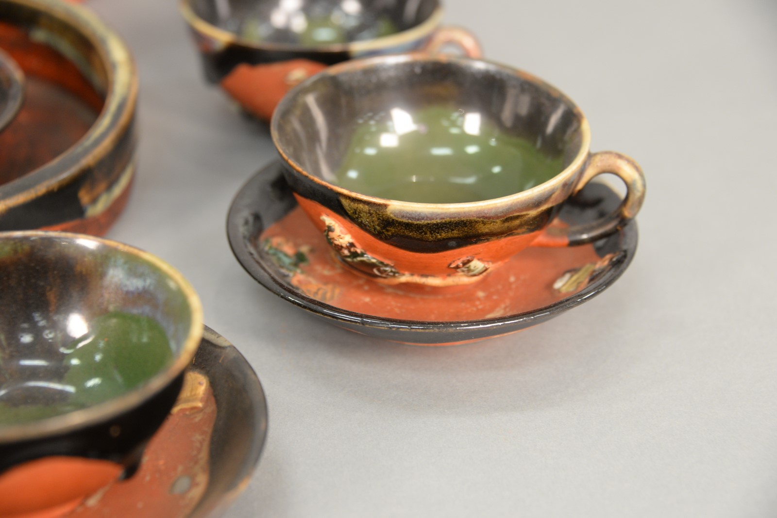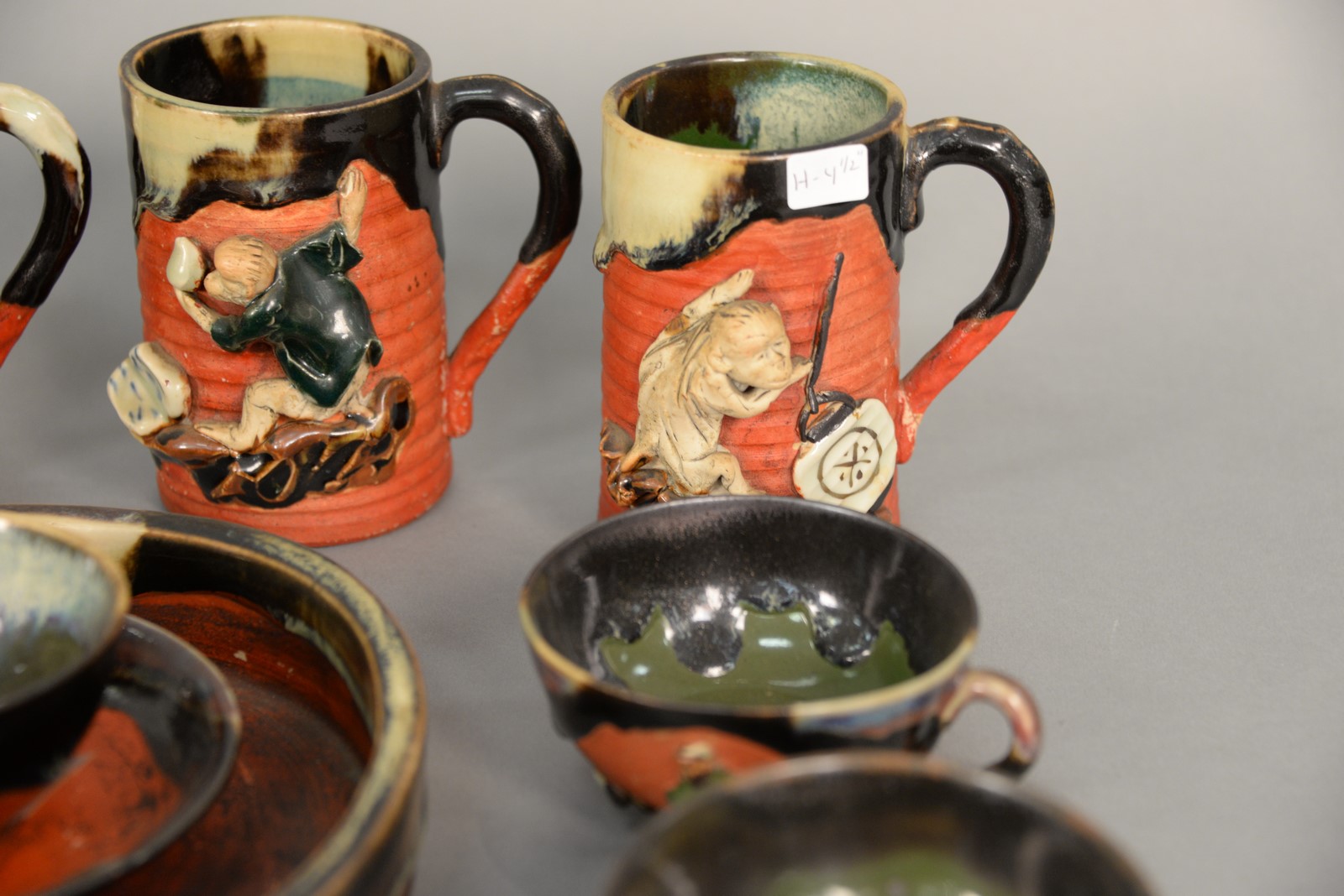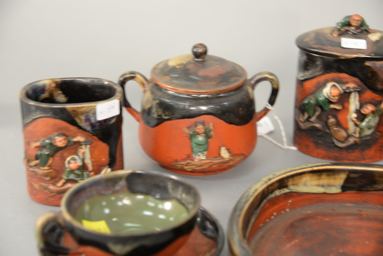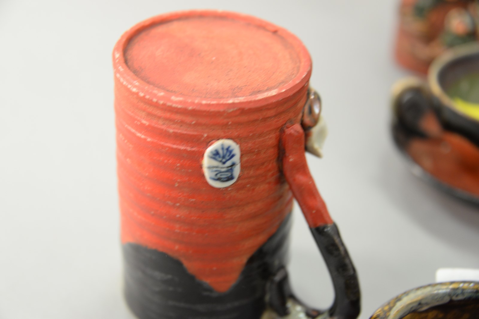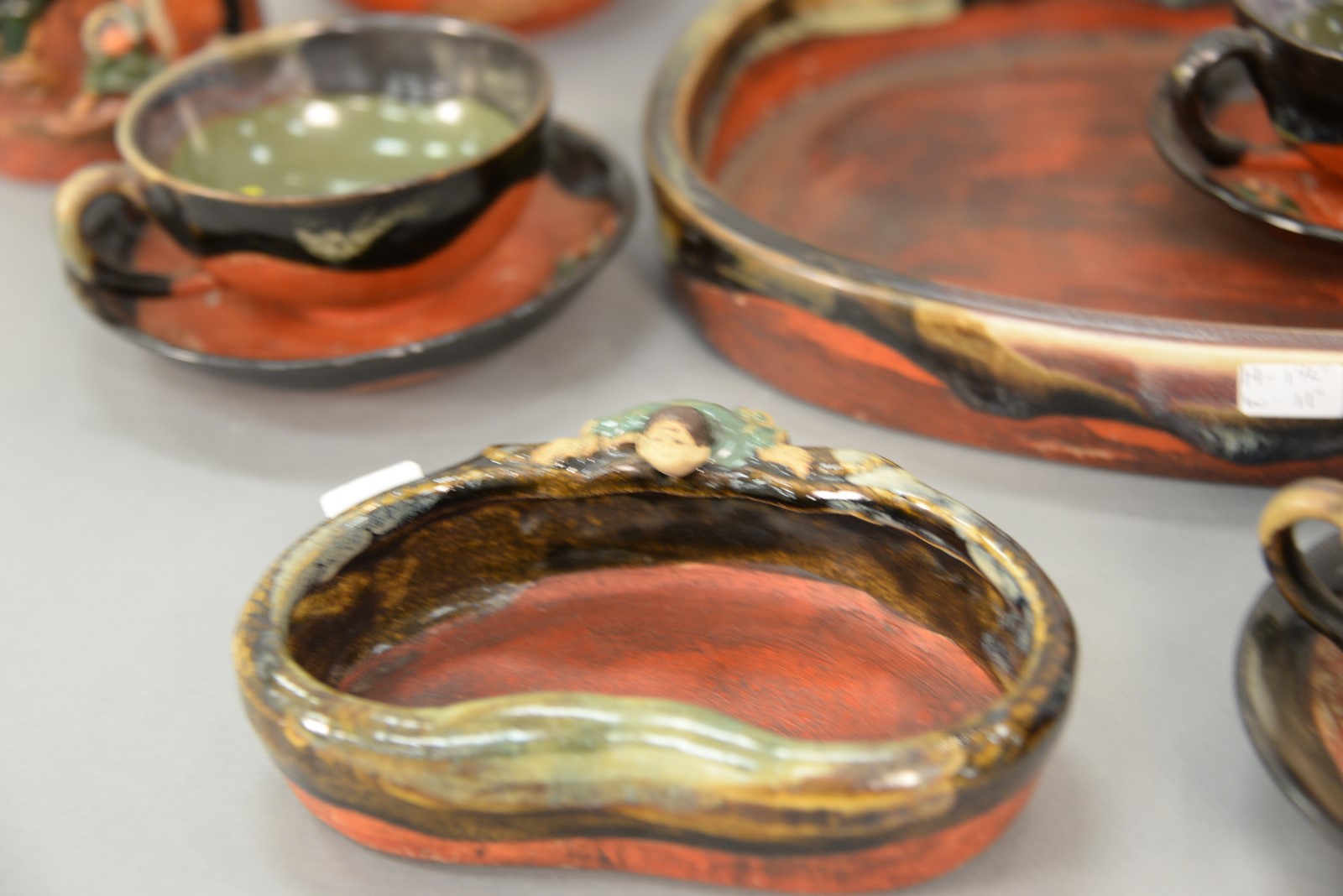 Seventeen piece lot Sumida Gawa pottery Japanese Studio Pottery including tray, five cups, three mugs, four saucers, covered sugar, humidor, small dish, and small vase. tray: 8 1/2 x 11