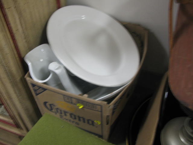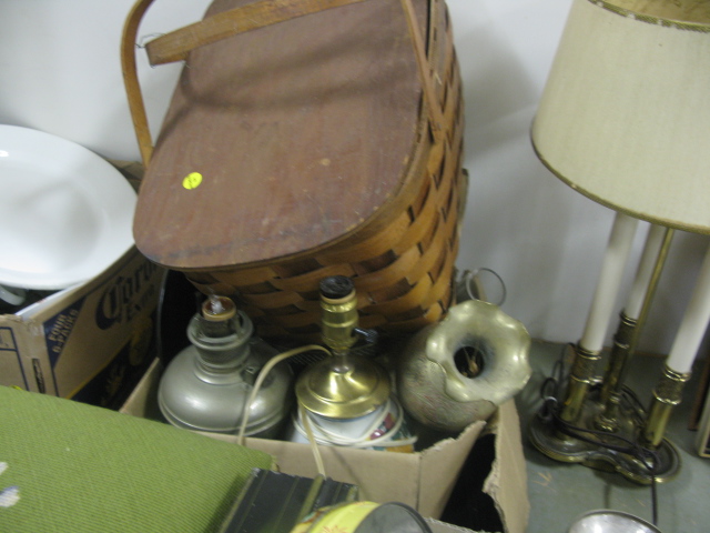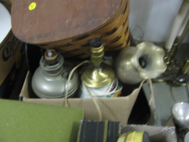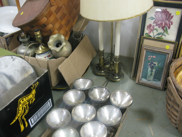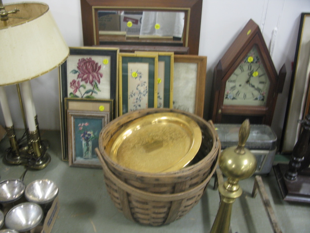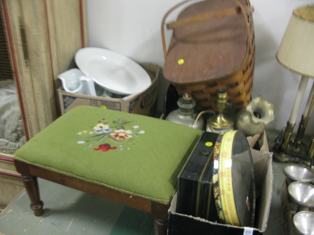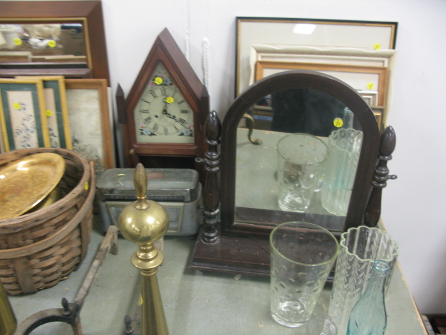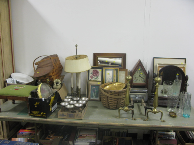 Table lot to include French stool, desk lamp, andirons, shaving mirror, pictures, prints, clock, glassware, basket and a silver plate