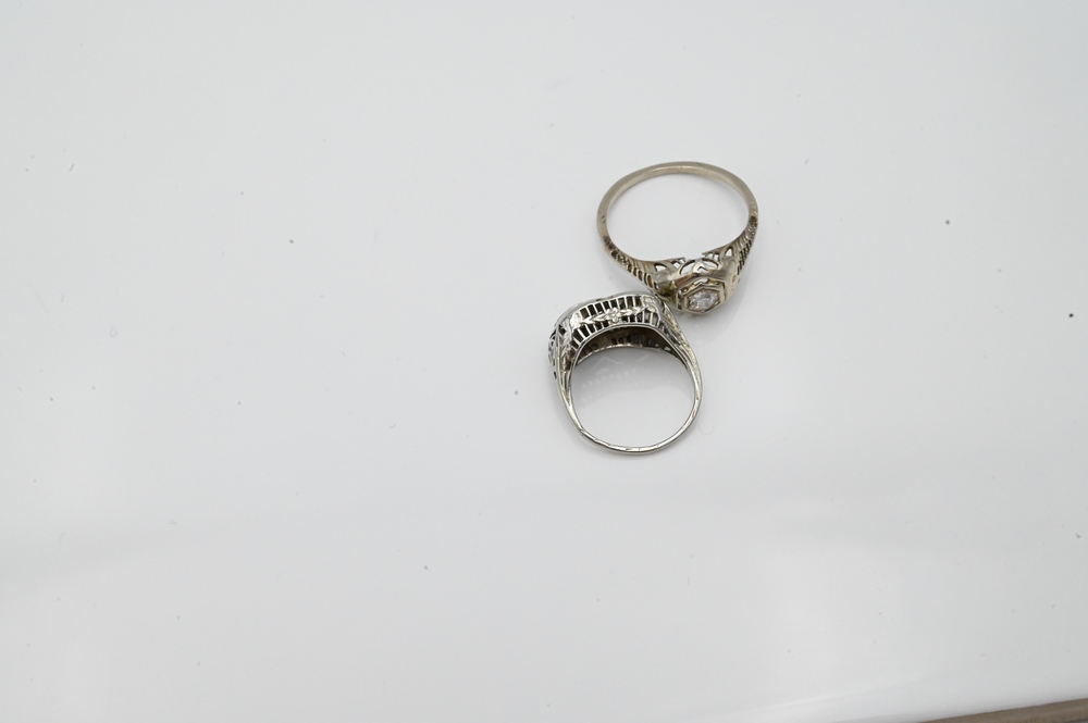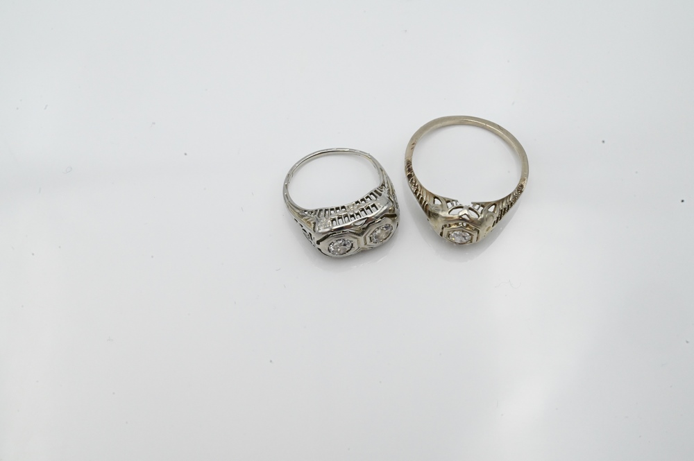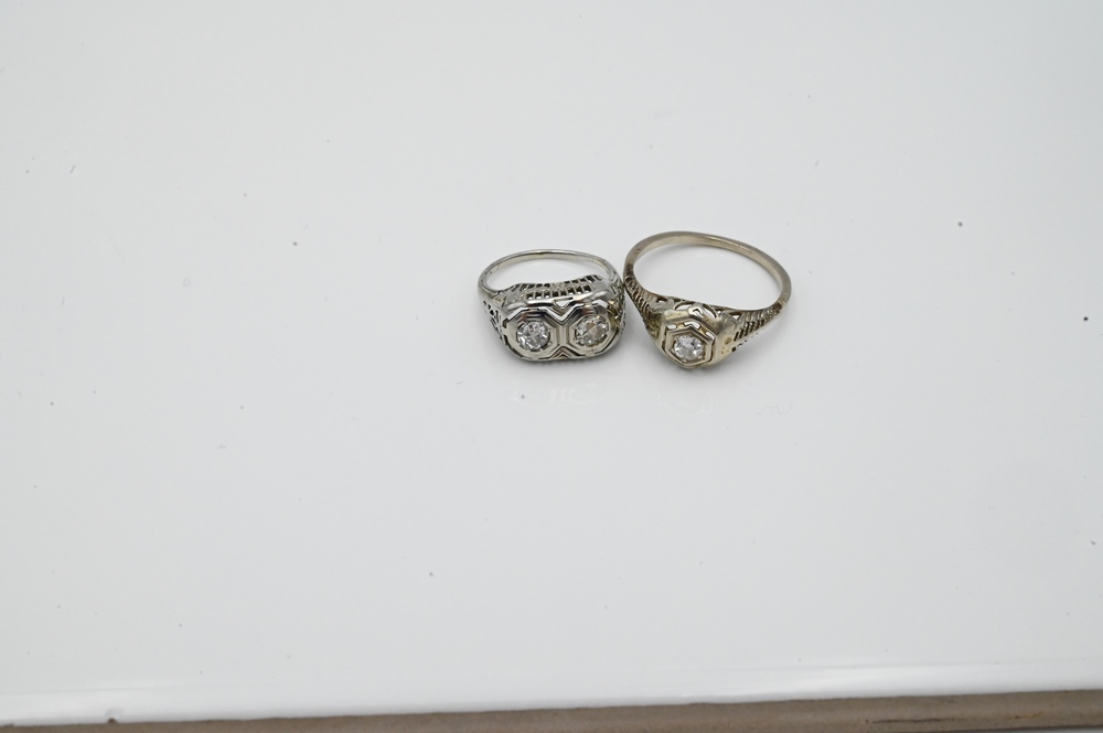 Two 14 Karat White Gold Filigree Rings, to include one set with two round diamonds, each 4.3 millimeters, size 2 1/2; along with one set with single diamond, size 7.