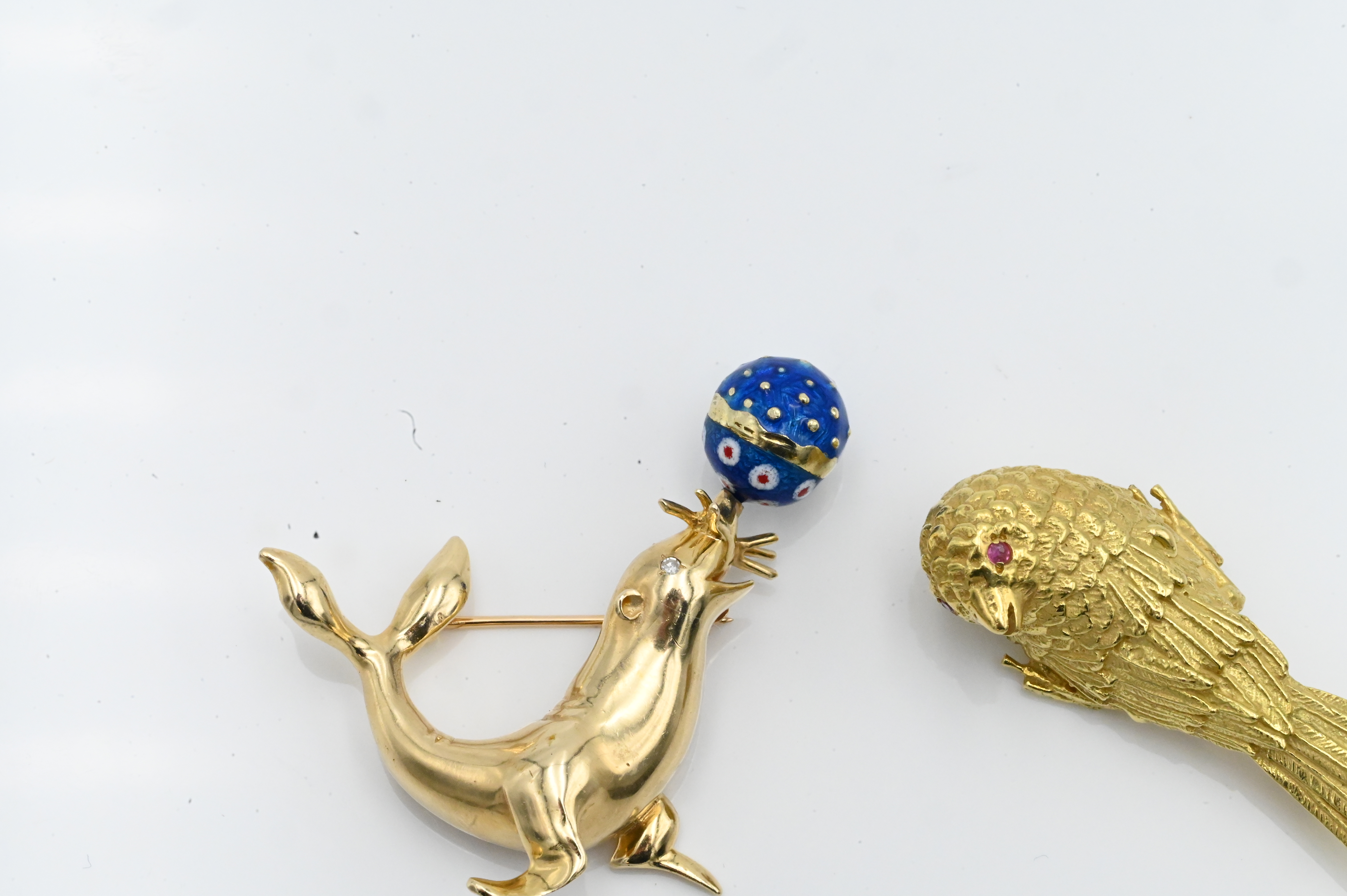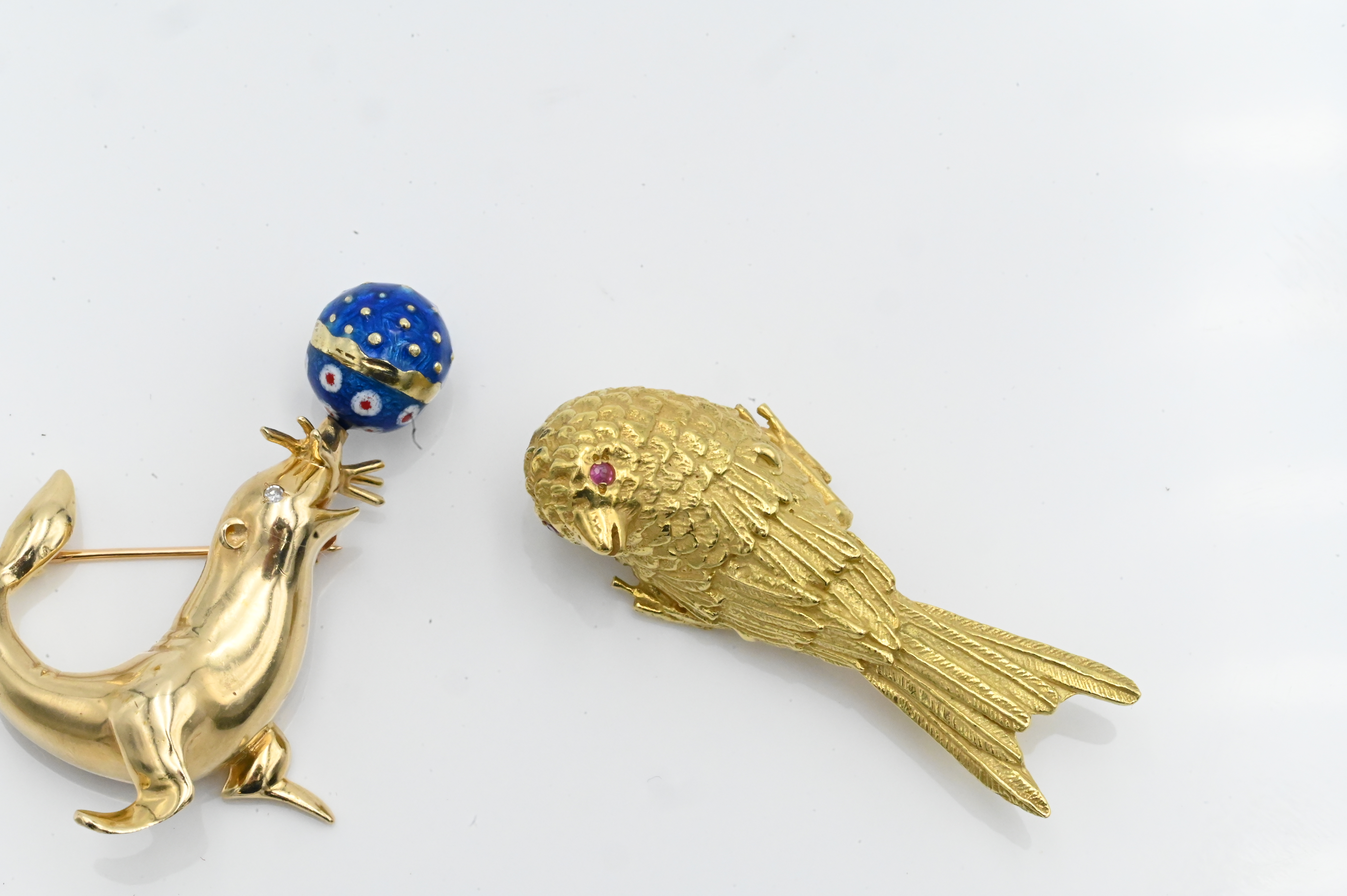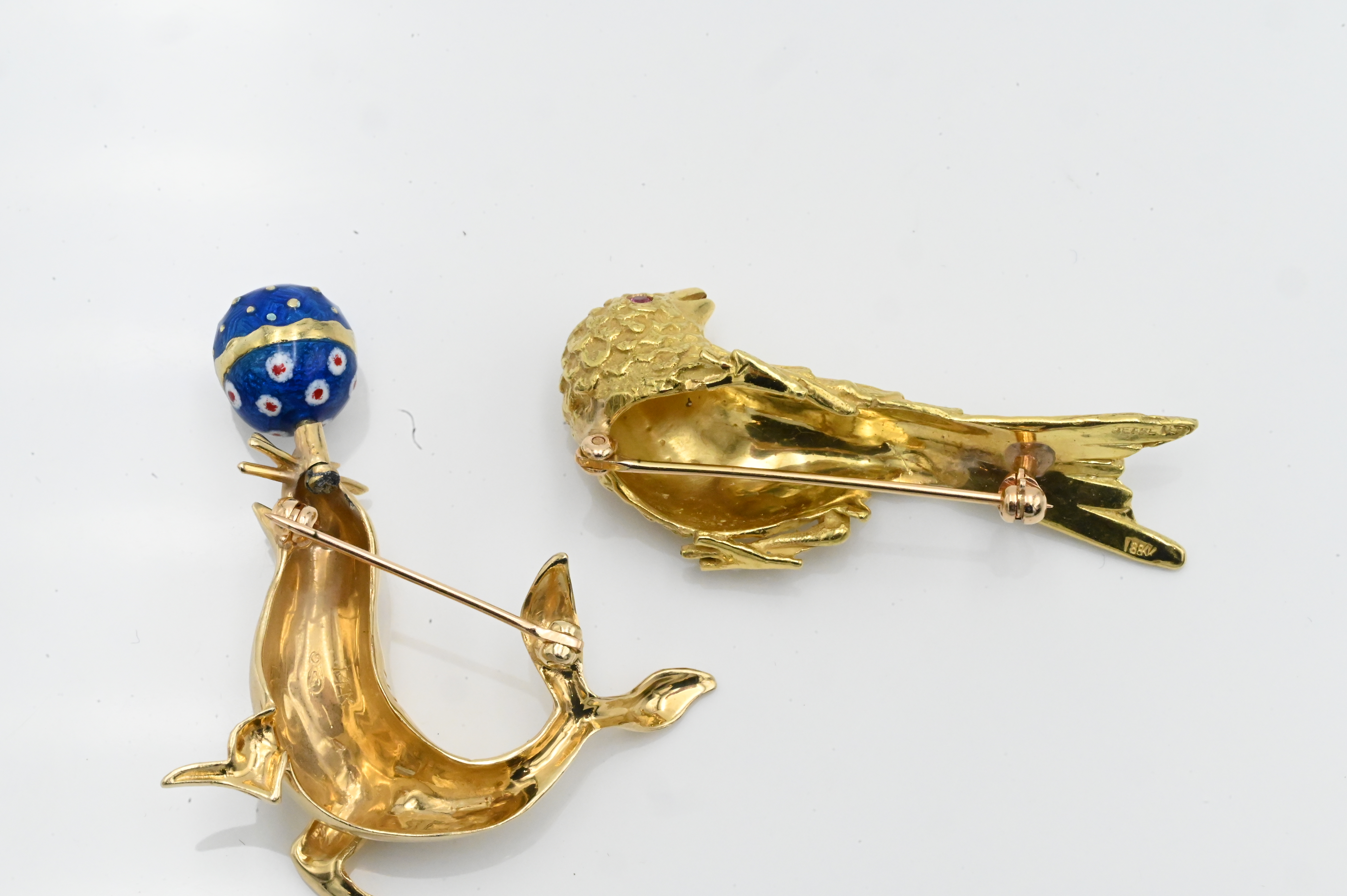 Two 14 Karat Yellow Gold Brooches, to include one bird along with one seal with enameled revolving ball, 22.7 grams.
