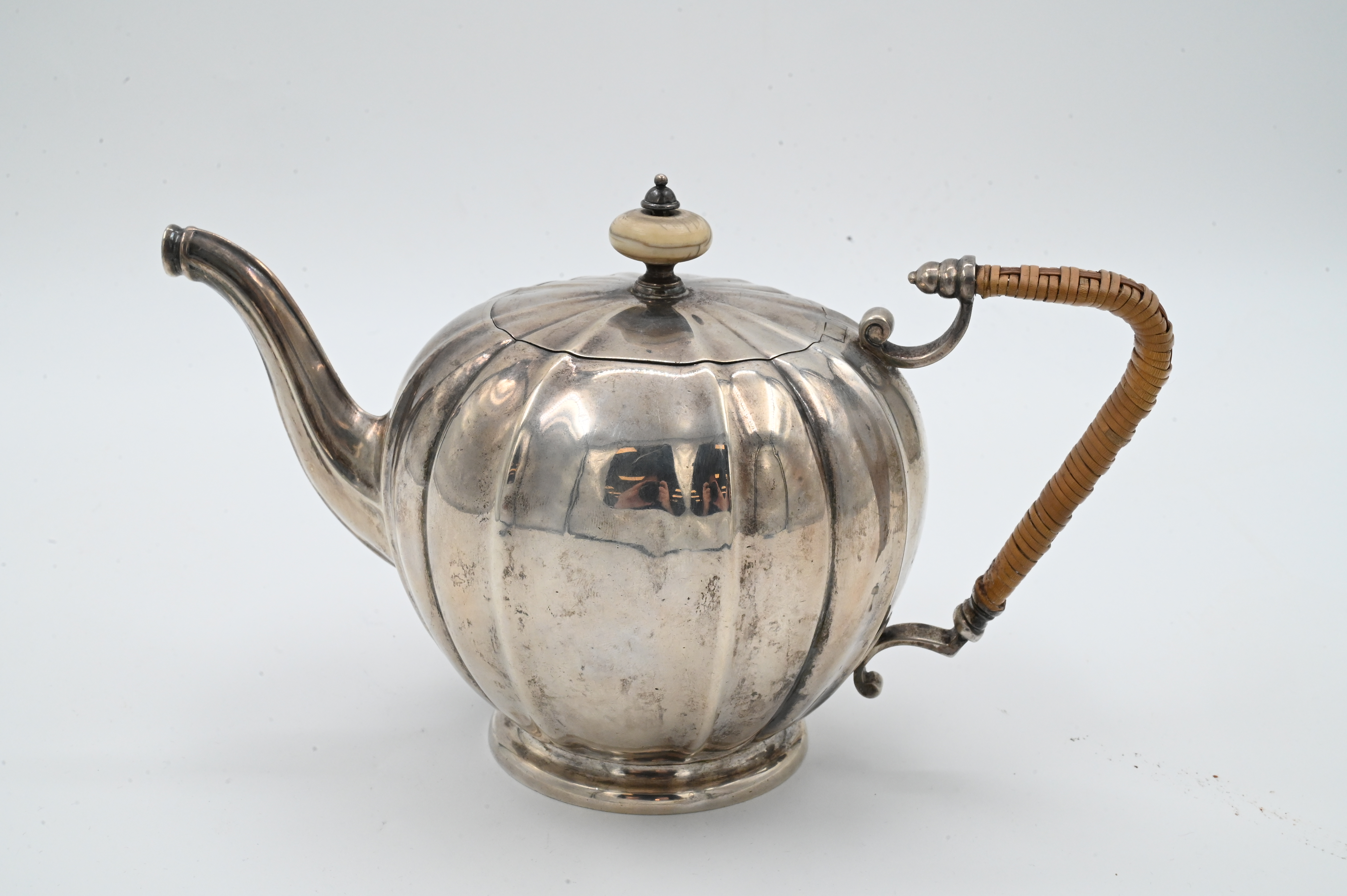 with burner and tea pot, both having rattan wrapped handles, kettle on four shell form padded feet with