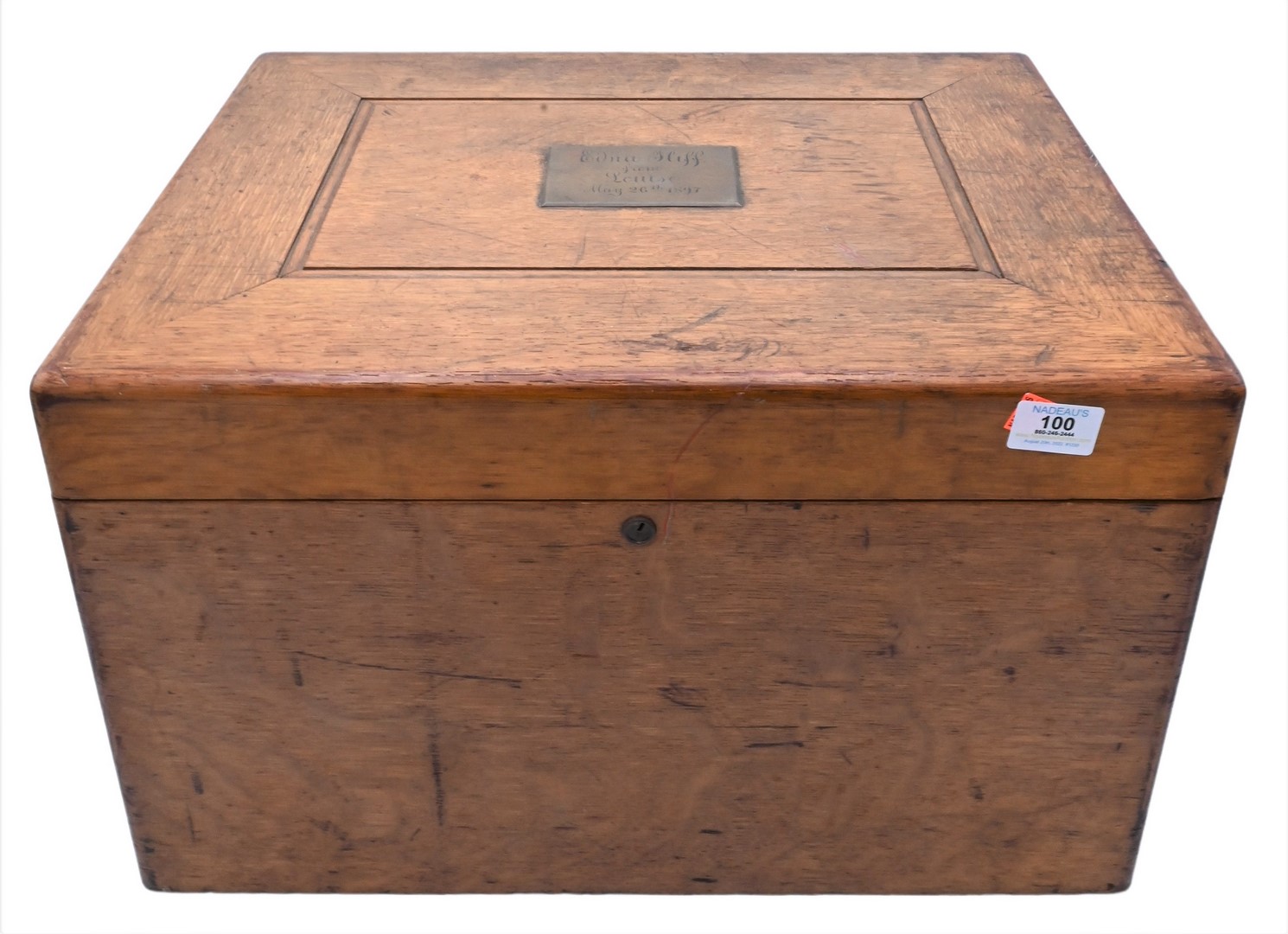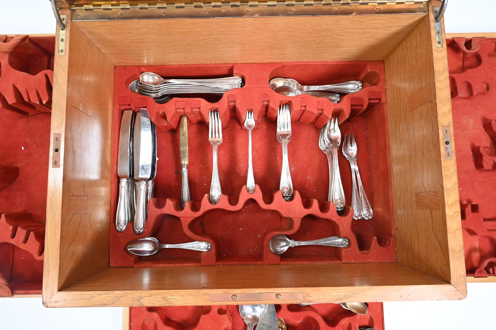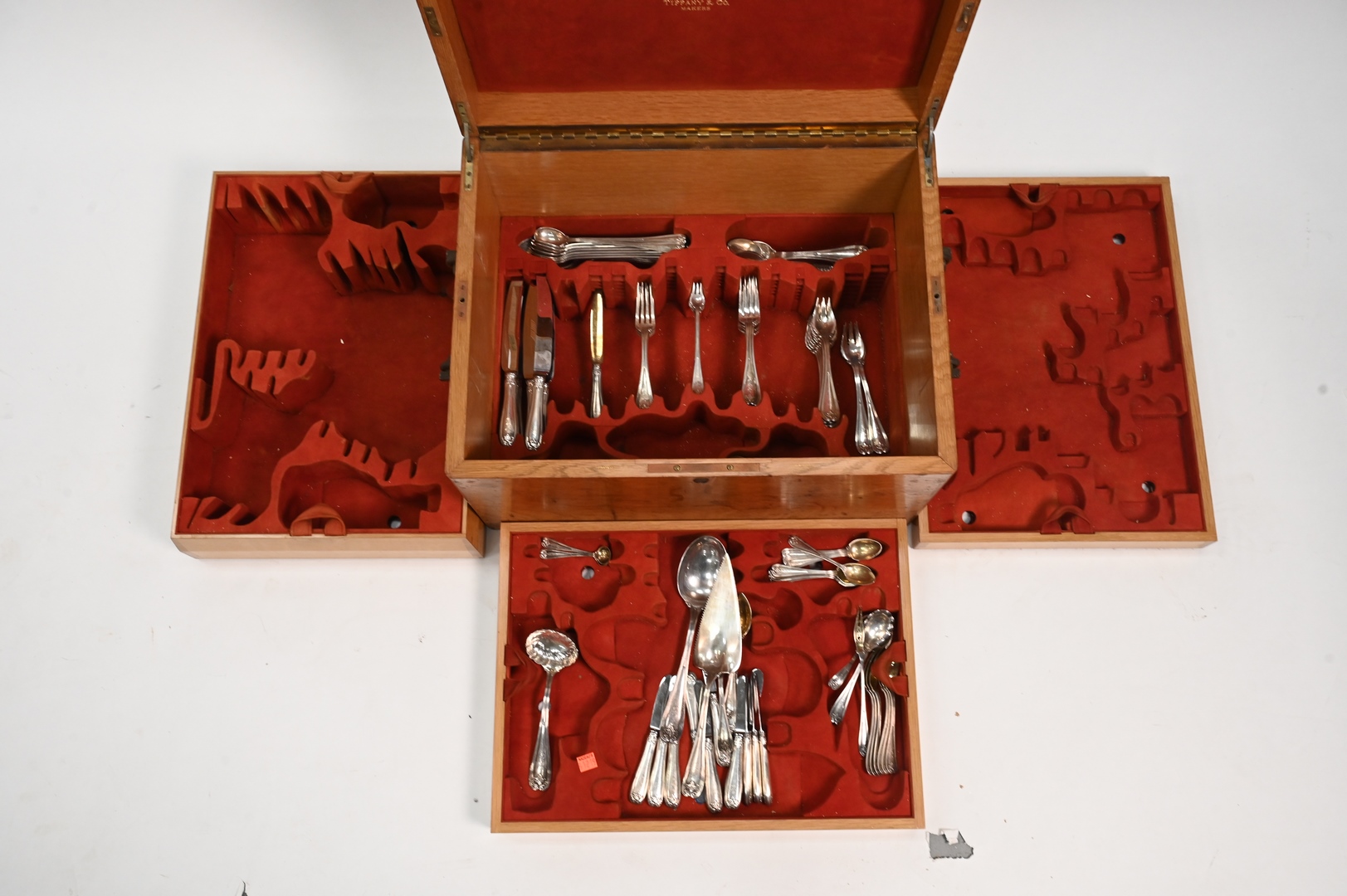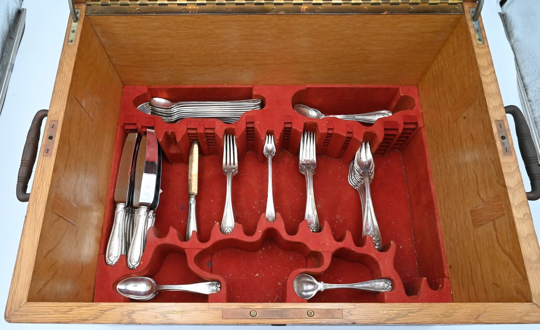 118 Piece Tiffany and Company Partial Sterling Silver Flatware Set, Kloud 9 Colonial pattern, in fitted oak silver chest, having four tier shelves with felt interior, sterling marked Tiffany and Company, sterling monogrammed with dates 1897 and 1956, oak box marked for Tiffany and Company, “Edna Hill from Louise, May 26, 1897”, to include 12 luncheon forks, 12 fish forks, 2 tablespoons, 11 teaspoons, 8 iced tea spoons, 2 salt spoons, 8 soup spoons, 6 cocktail forks, 12 demitasse spoons, 7 sherbet spoons, 1 olive forks, 1 Reed and Barton, 12 dinner knives, 1 steak knife, 12 butter knives, 6 place spoons, 6 serving pieces, along with 13 handles, 130 t.oz.