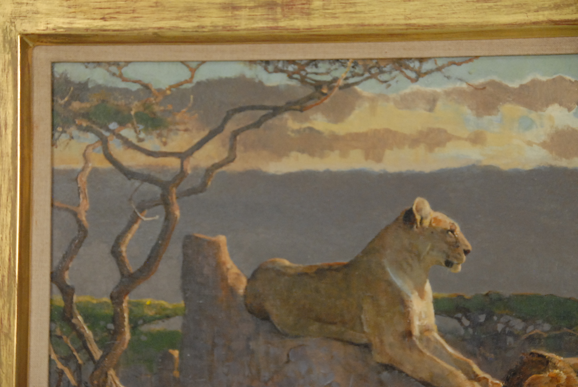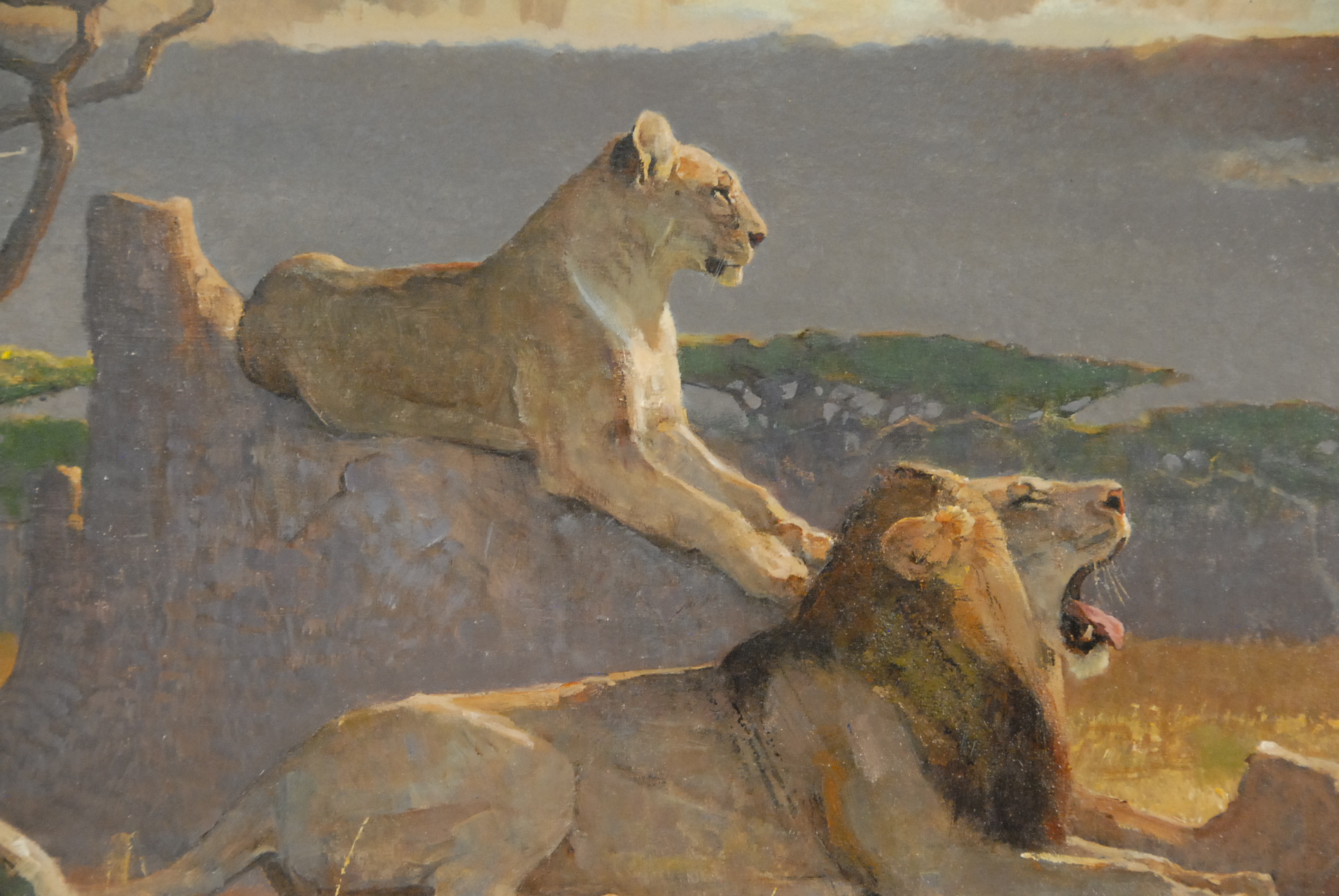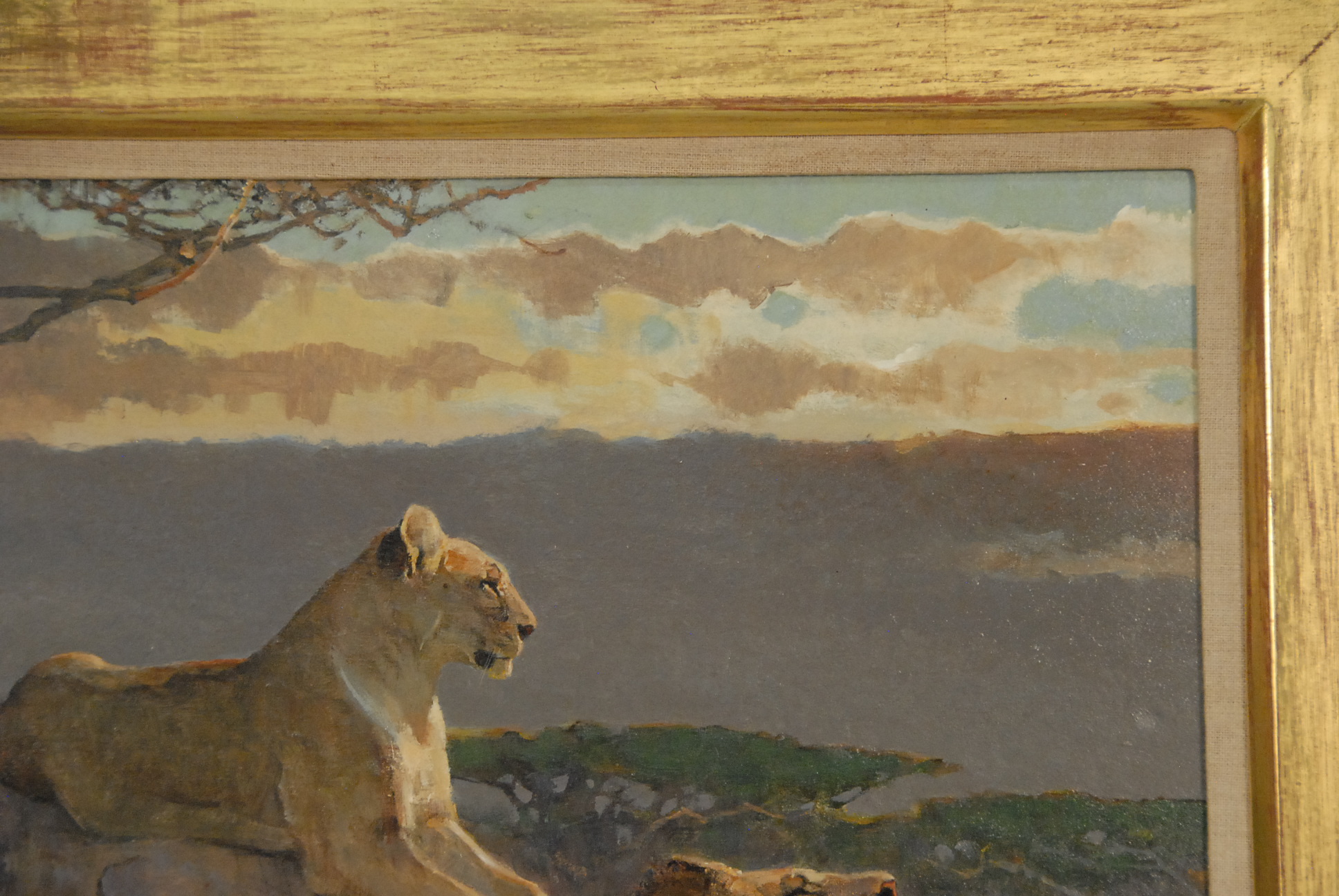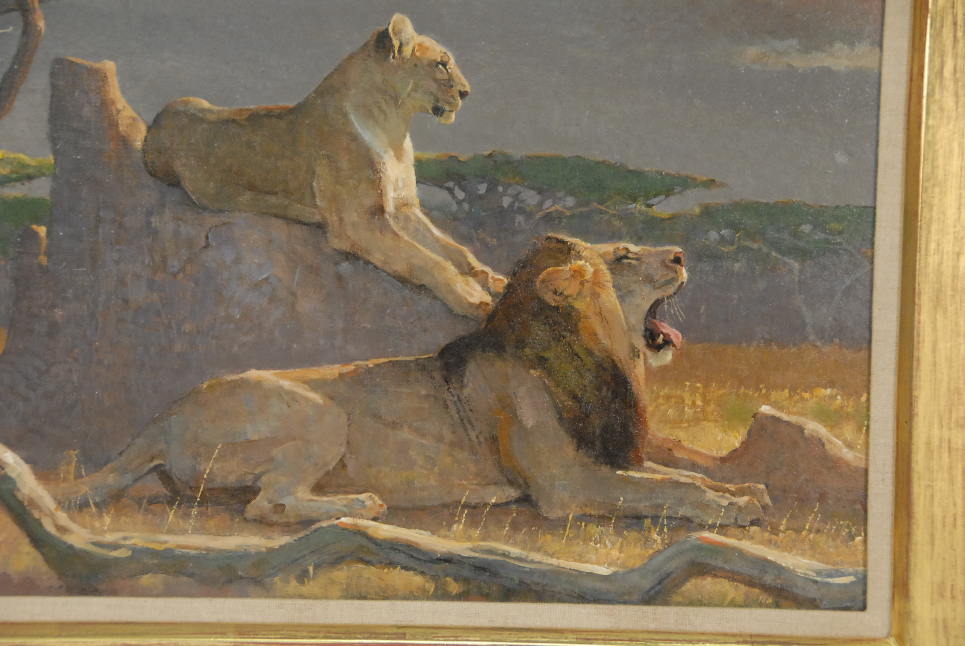 Lot 100: Bob Kuhn LION AND LIONESS oil on board signed lower left Kuhn marked on reverse: All reproduction rights are reserved by the artist Bob Kuhn 1989 Marked on reverse on tape: Mara Evening painted for Leonie and Ge