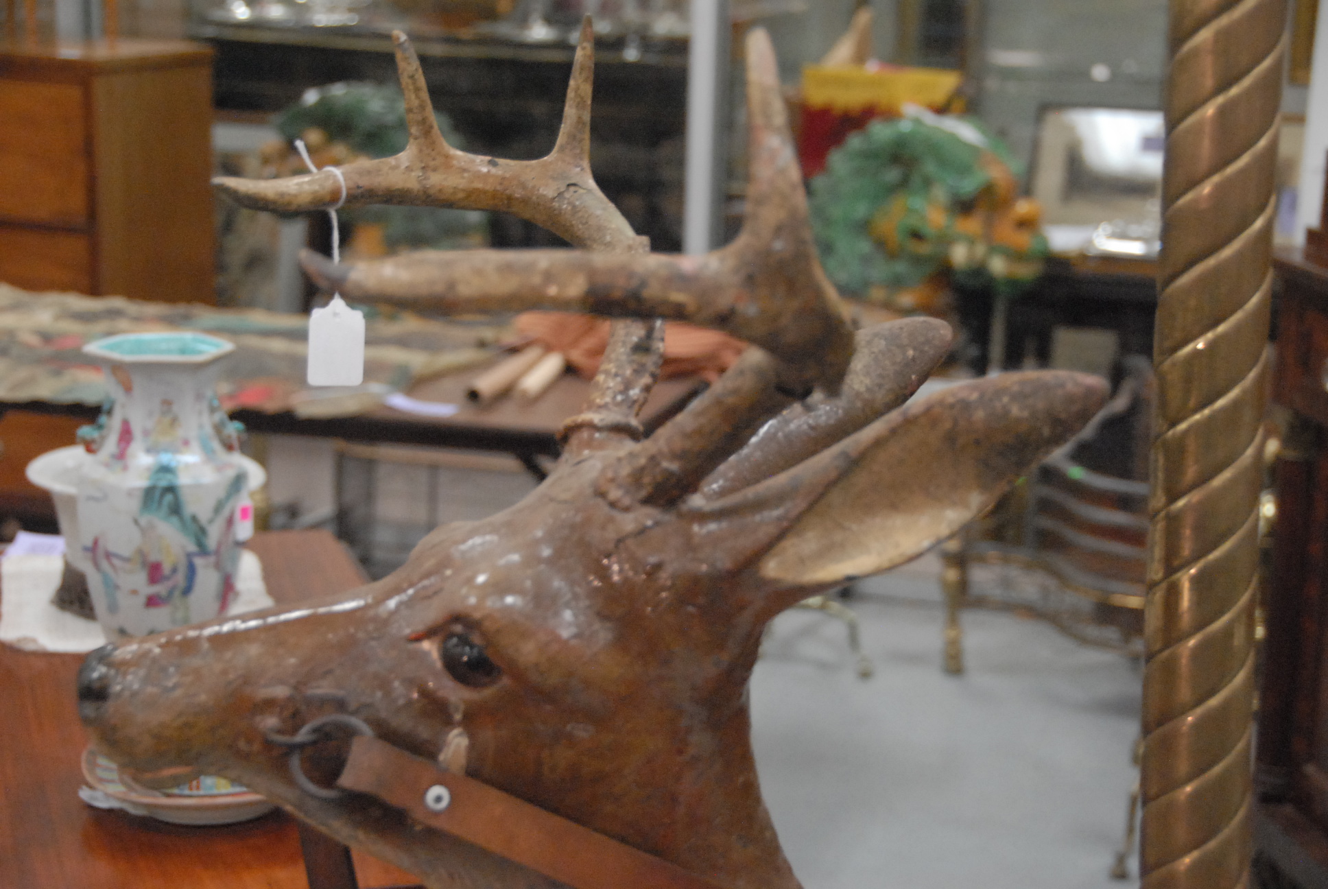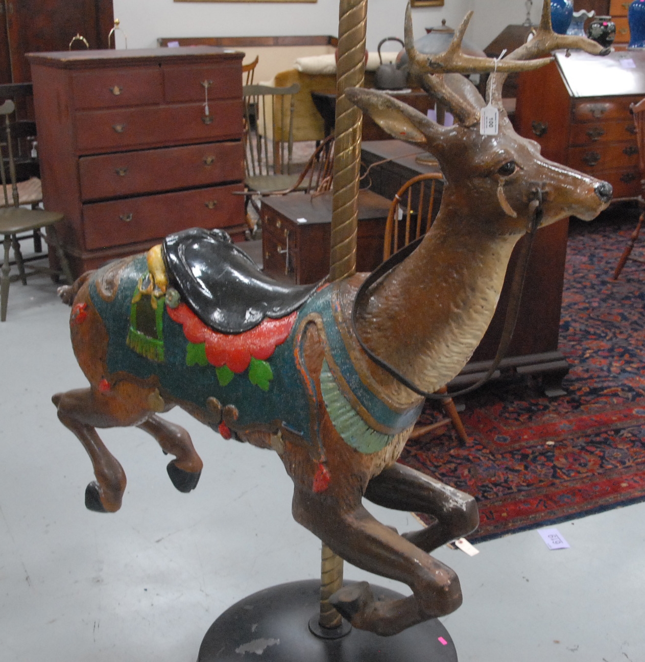 Lot 100: Carousel deer from E. Joy Morris in old park paint. Provenance: Carousel from Quassy Amusement Park, Middlebury, CT, Oct. 21st 1989, Lot #19 with catalog and article of 1989 auction. deer only: ht. 50 in. lg. 54 in.