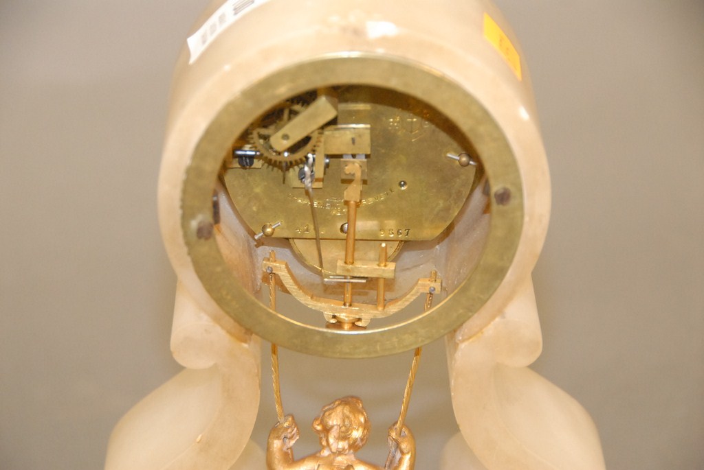 Chappement Breuete French swing clock with alabaster case, ht. 11.