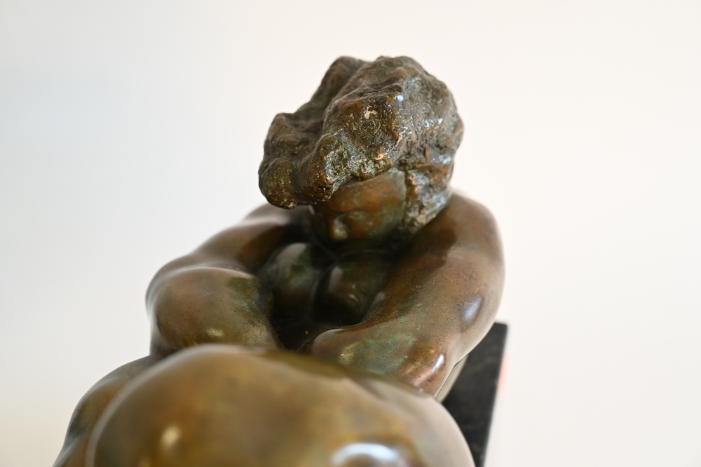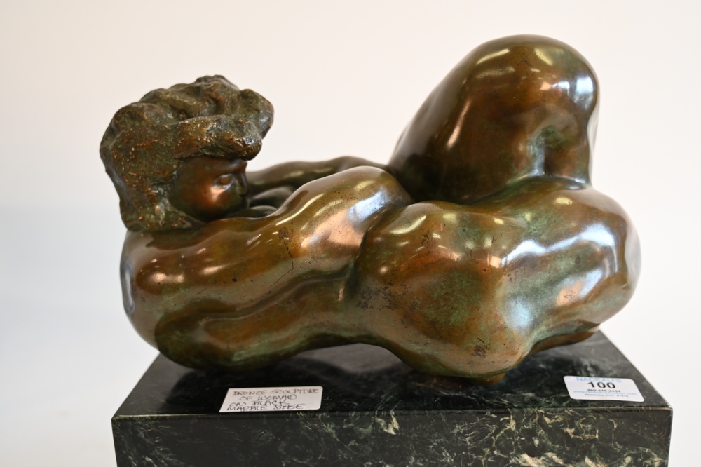 Lot 100: Contemporary Bronze of Nude Woman, unsigned, mounted green marble base, overall height 13 1/2 inches.