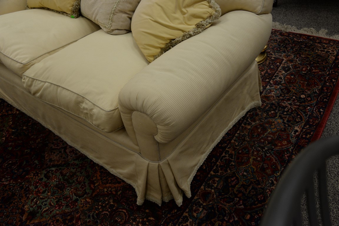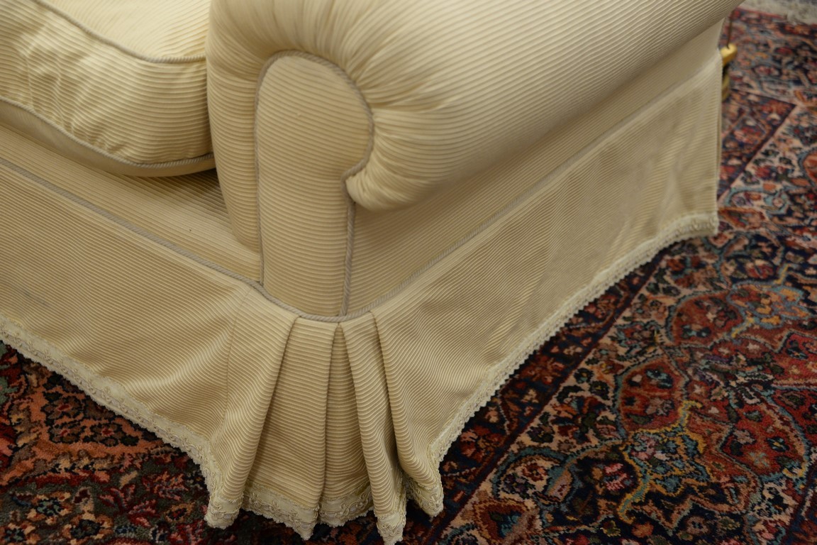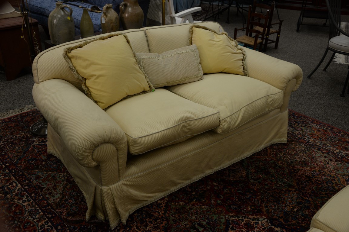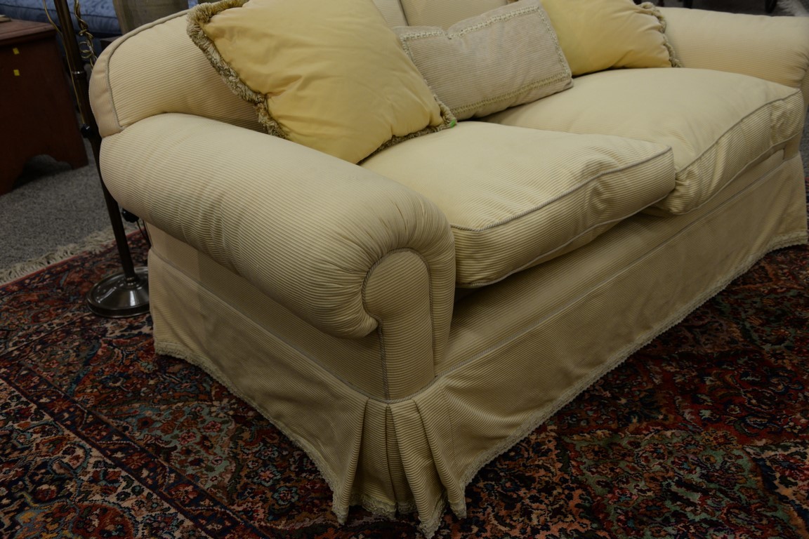 Lot 100: Custom upholstered loveseat having two down filled cushions. lg. 67in. Provenance: From an apartment on Park Avenue, New York.
