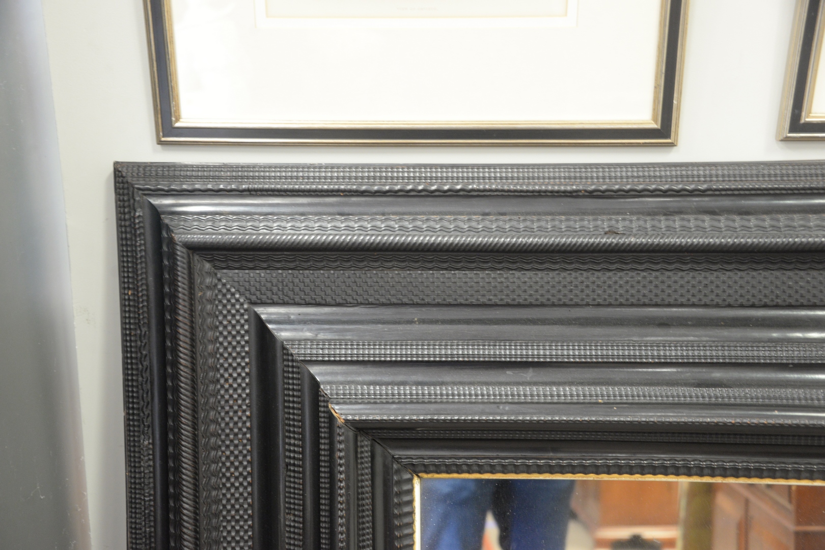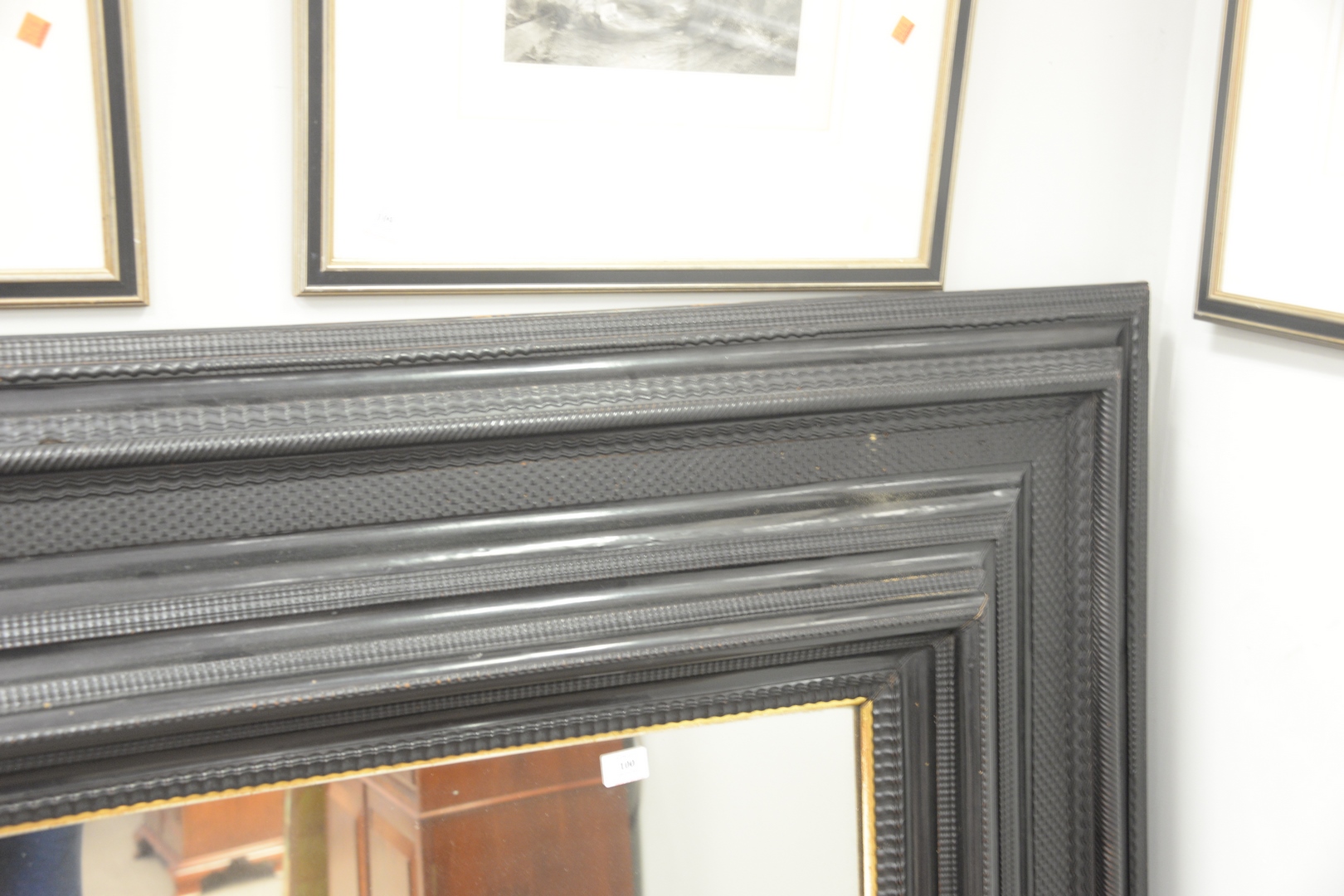 Lot 100: Flemish Ebony Mirror, having 13 inch wide rippled, moulded, ebonized frame, 18th/19th Century, top 53 x 60.
