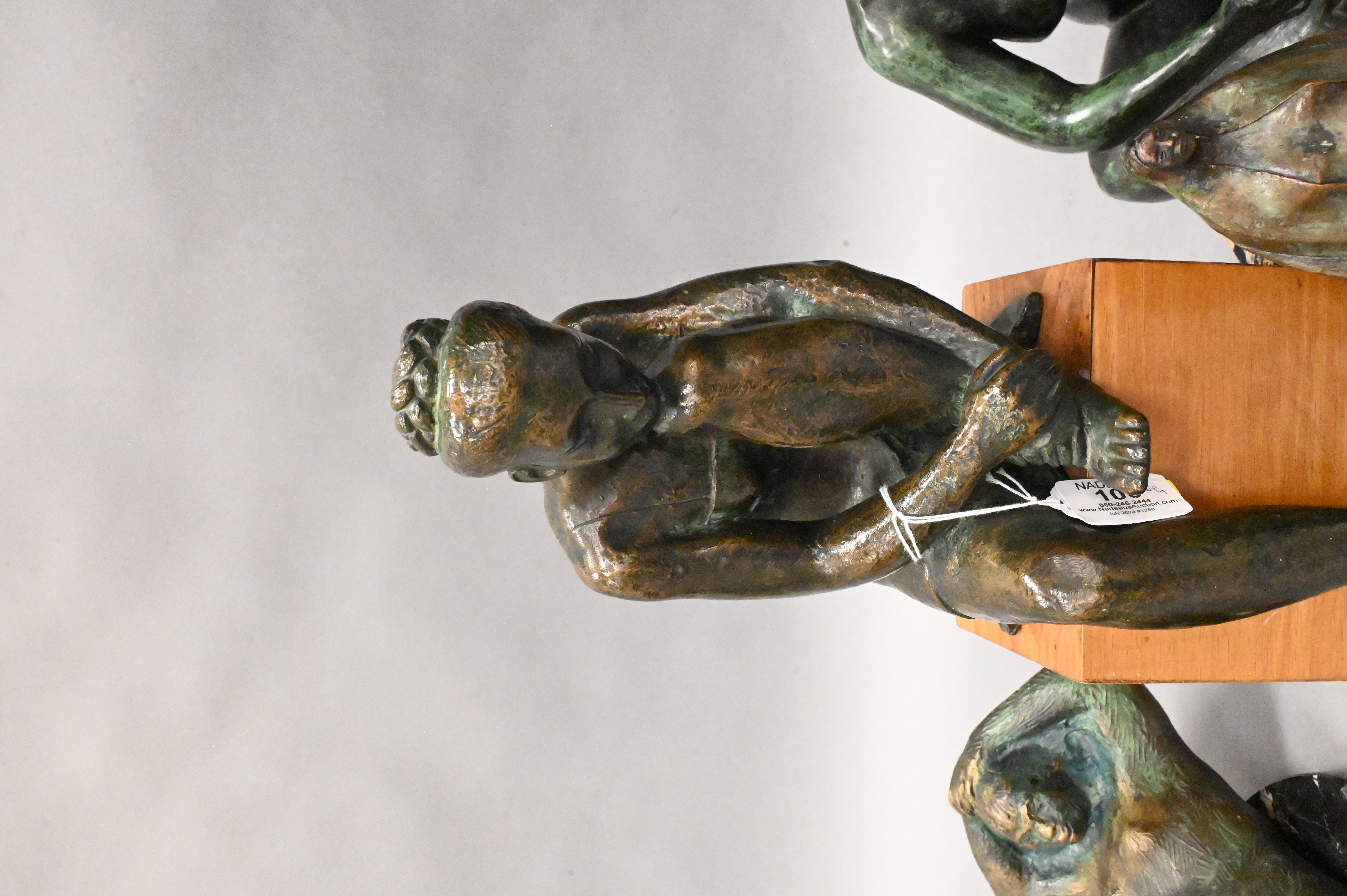 Bronze on wood base of figure with chin on knee