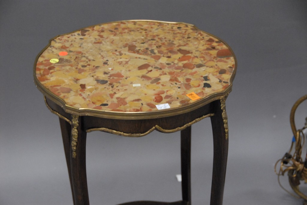 French marble top table with inset marble and brass mounts.