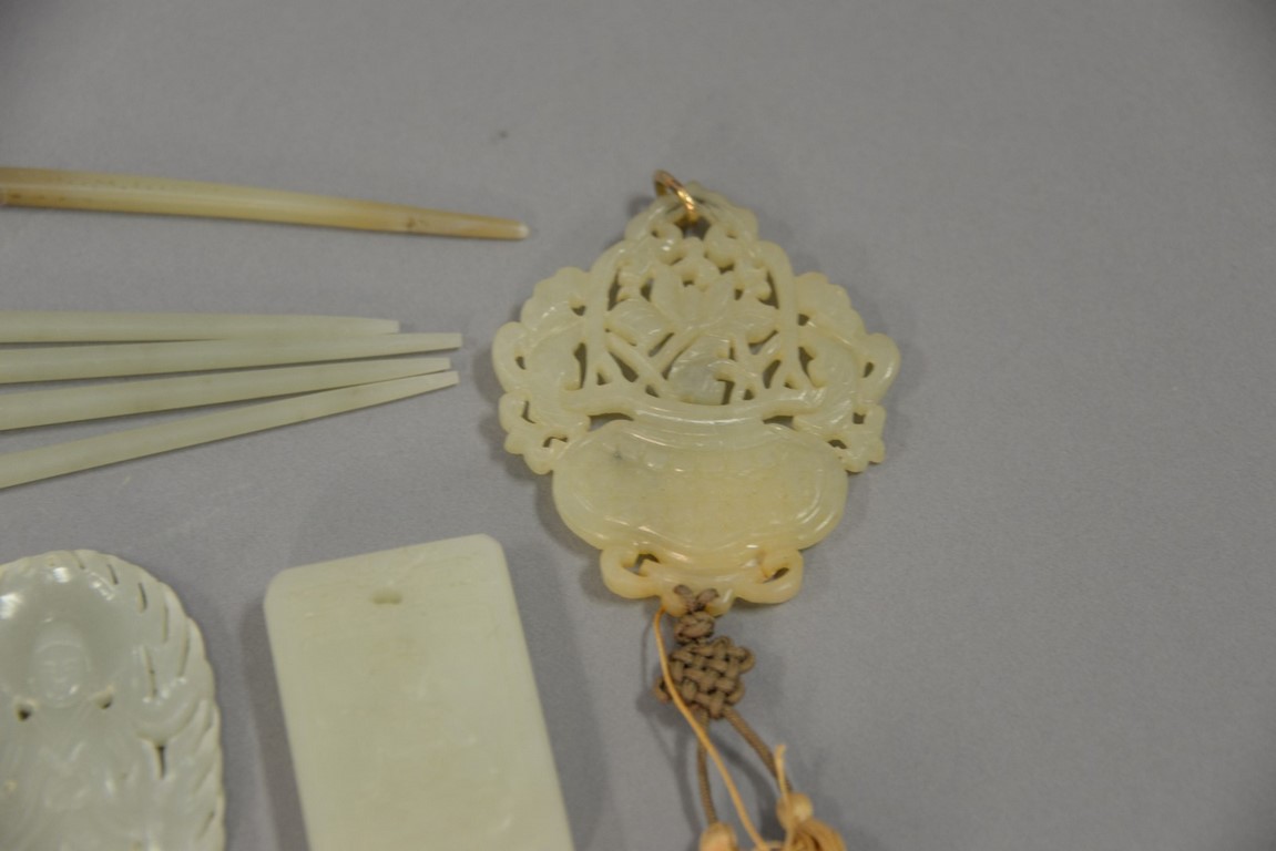 Lot 100: Group of white jade items to include a carved fish, a carved double gourde, five pendants, five picks, etc. pendants: ht. 2 in. wd….