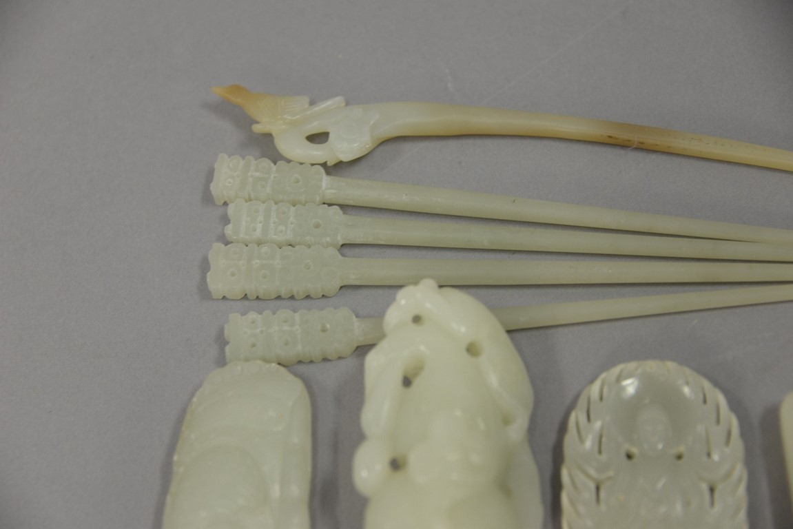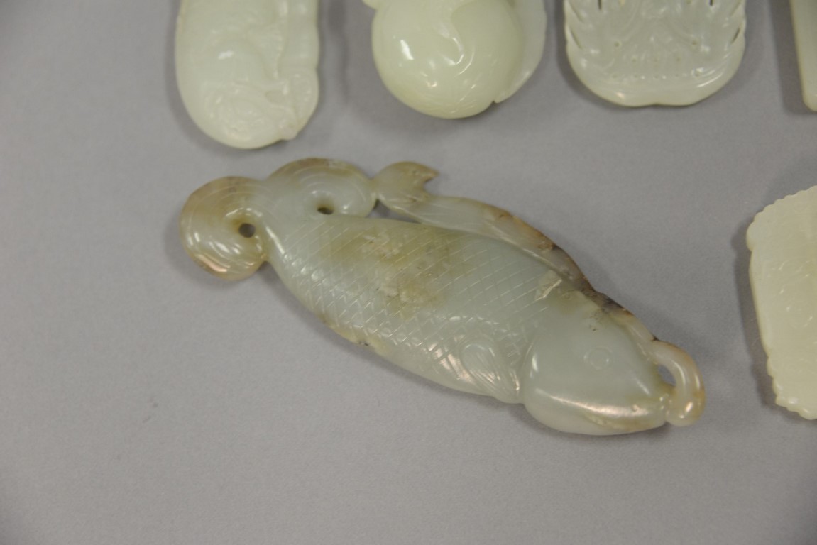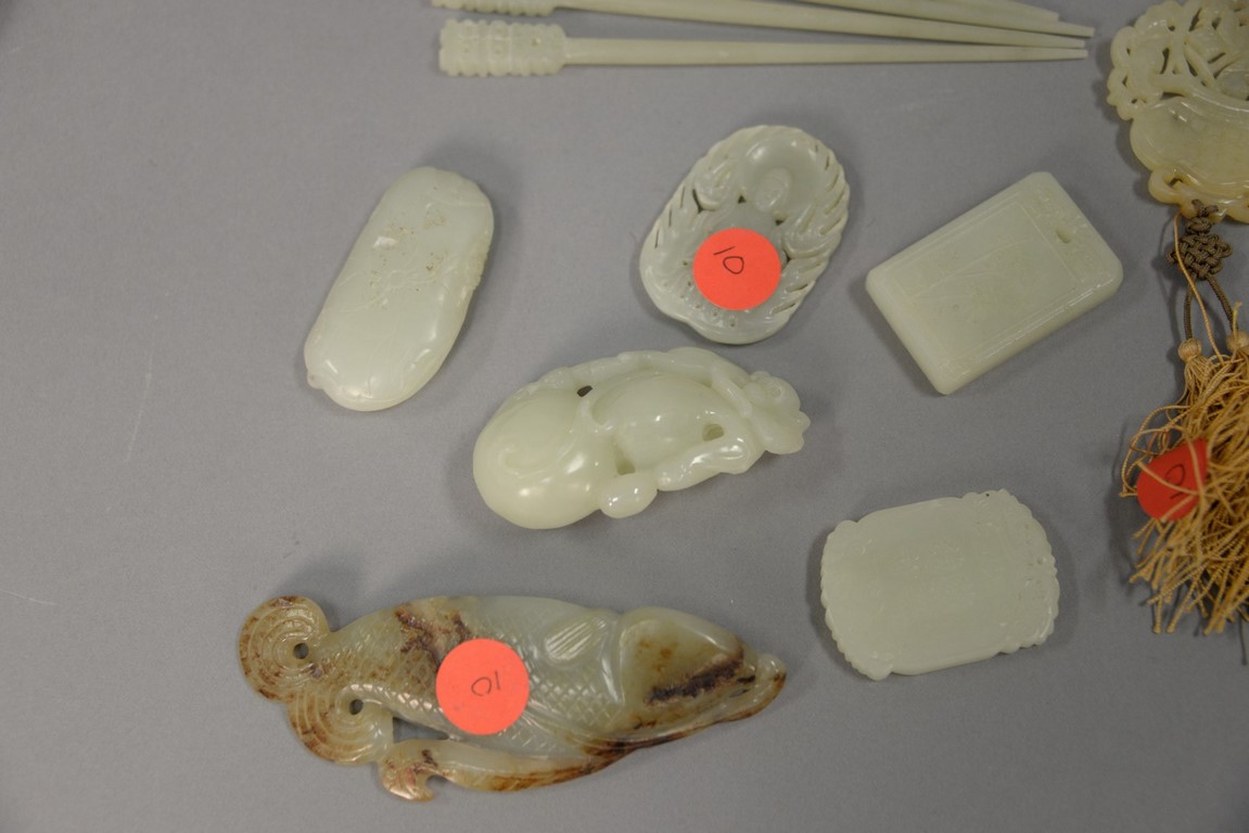 Group of white jade items to include a carved fish, a carved double gourde, five pendants, five picks, etc. pendants: ht. 2 in. wd. 1 1/4 in. fish: 4 1/4 in.