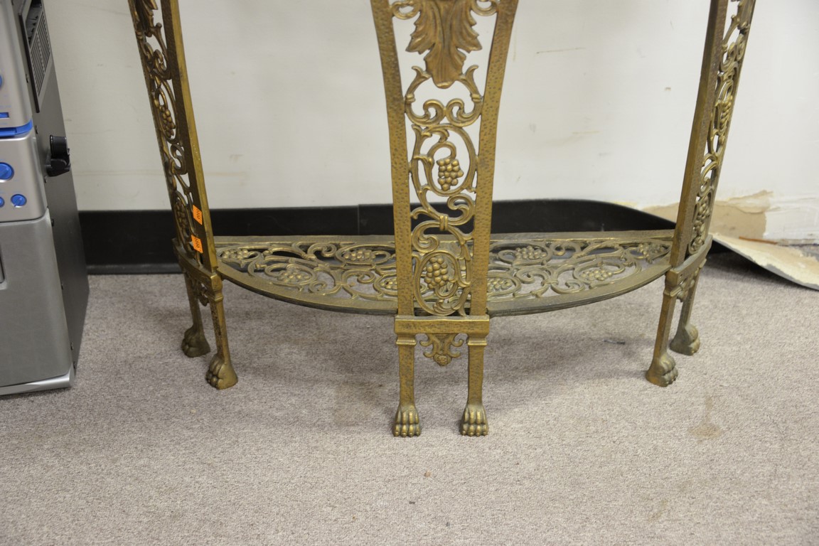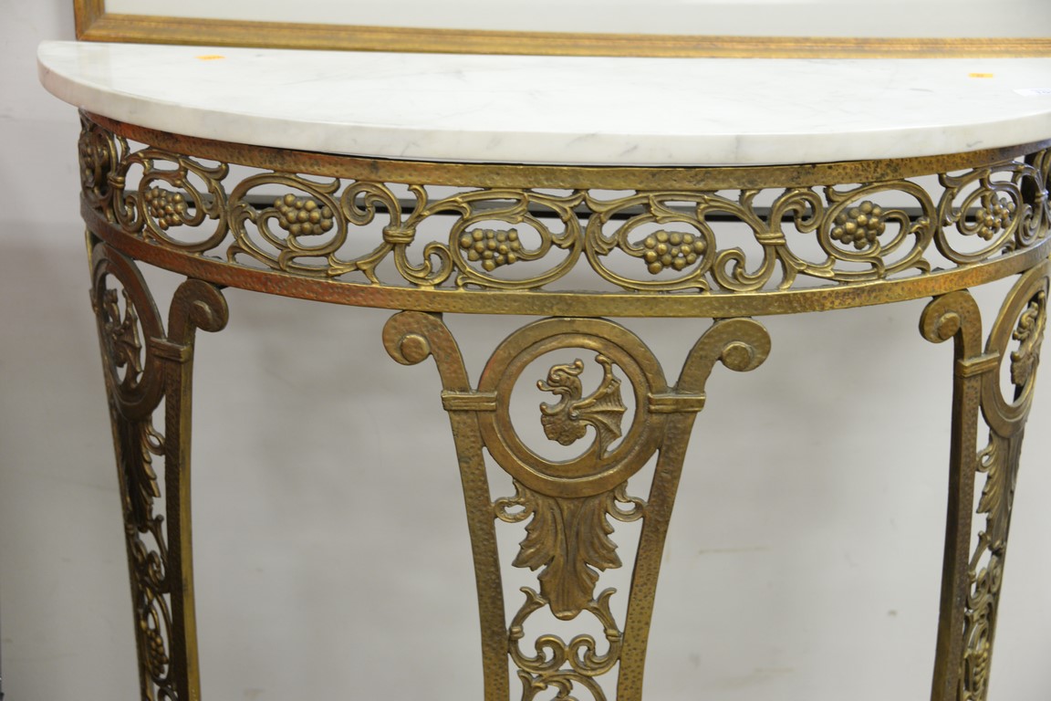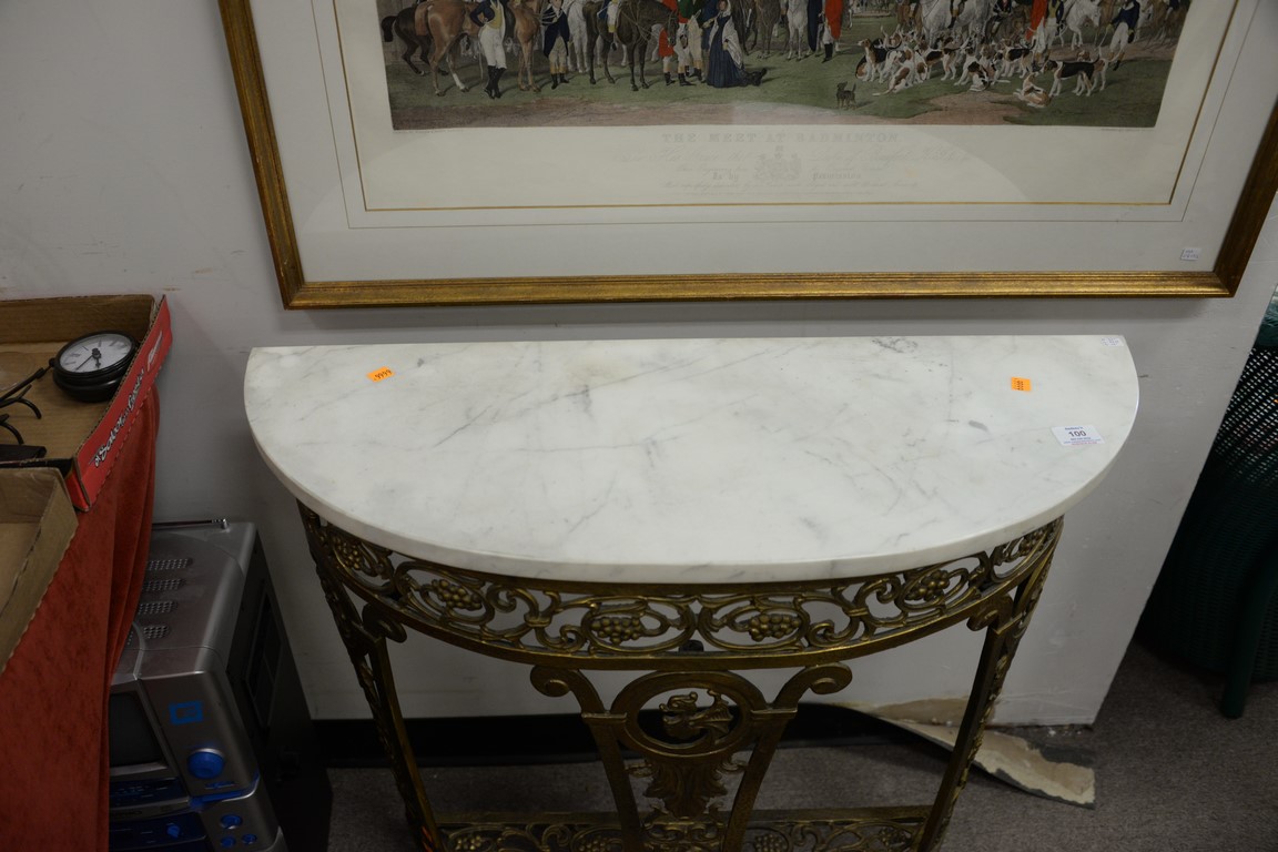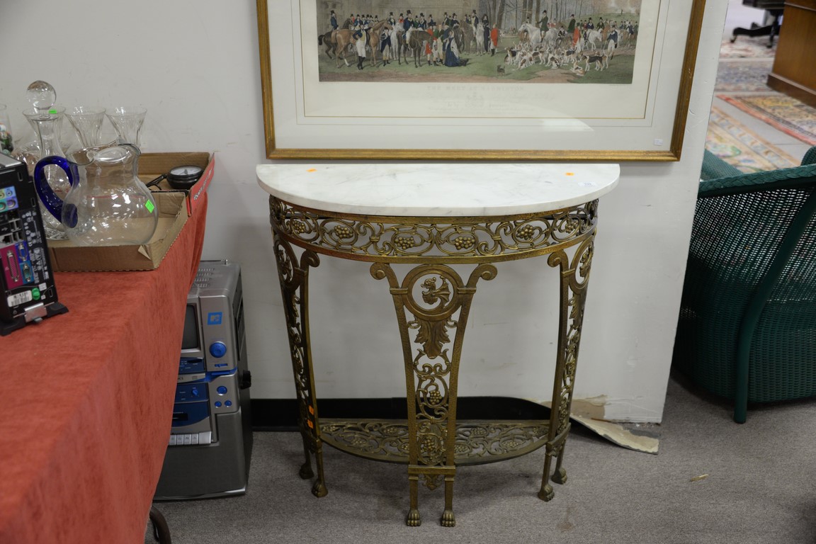 Iron marble top demilune table. ht. 32in., wd. 32 1/2in., dp. 12in.
