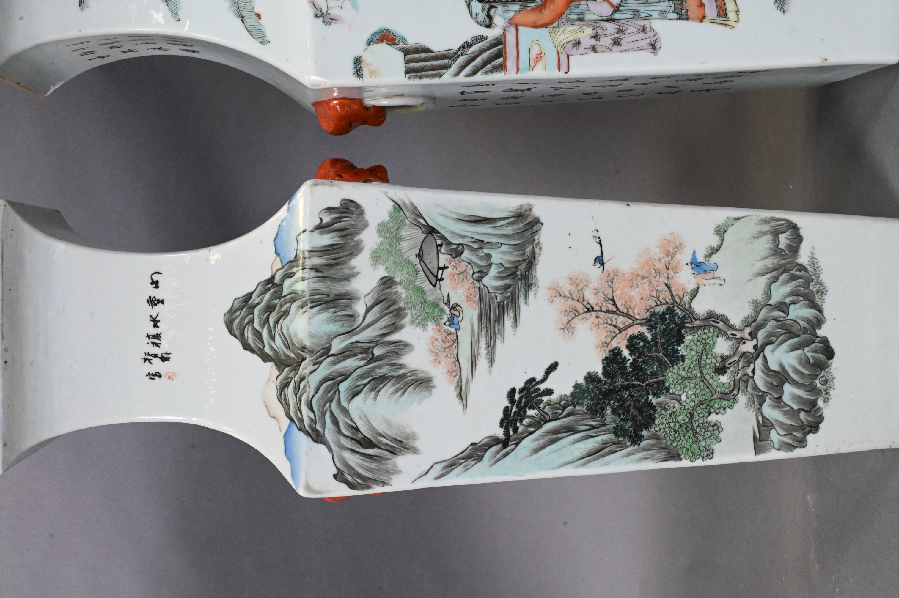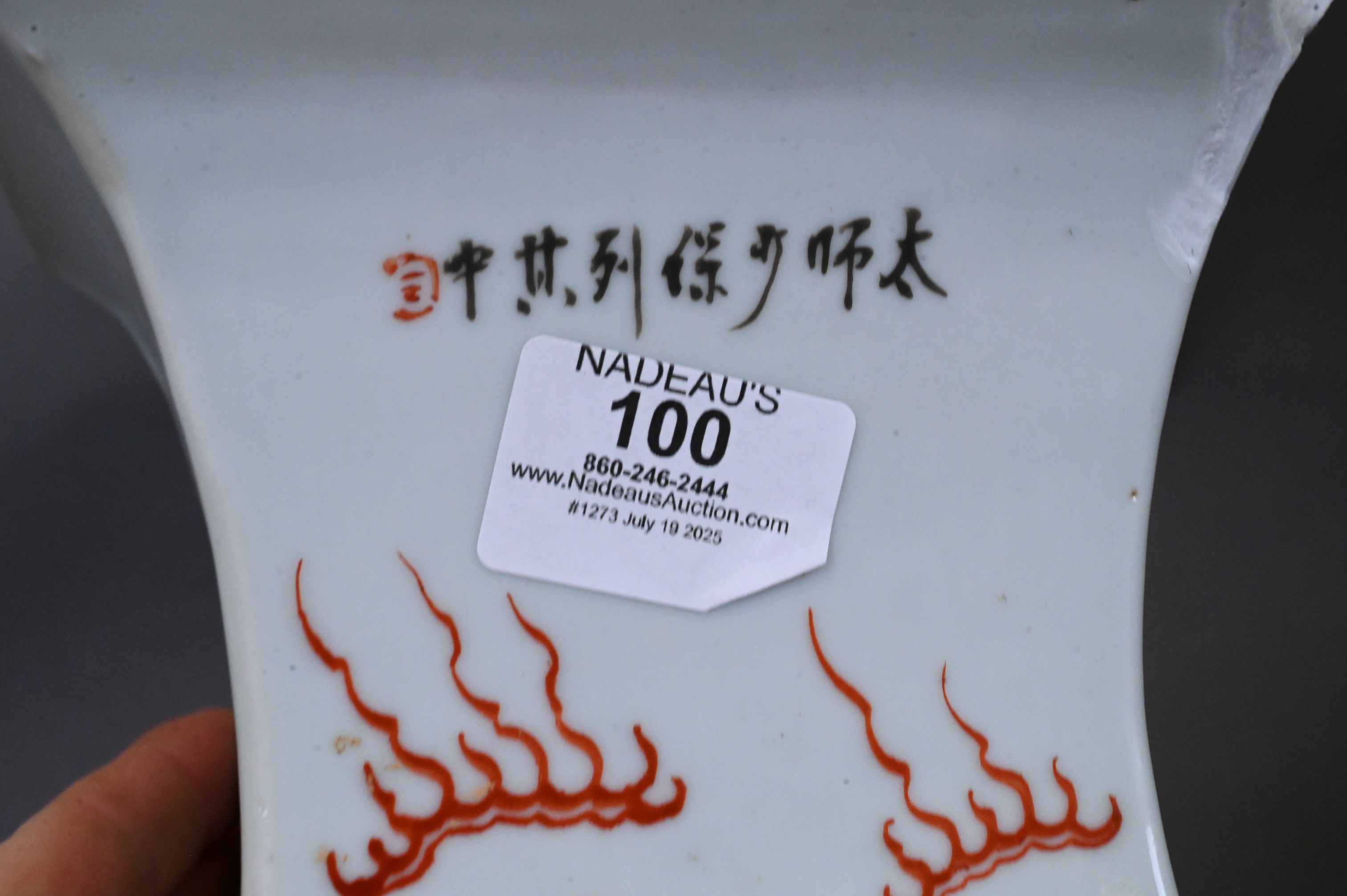 of square form having double foo dog handle knockers featuring enamel motifs of Geishas, red foo lions, bird of paradise / peacocks, and mountain landscapes