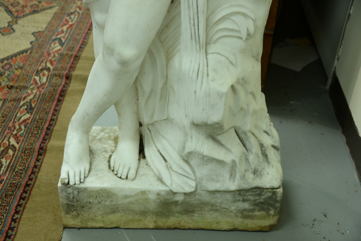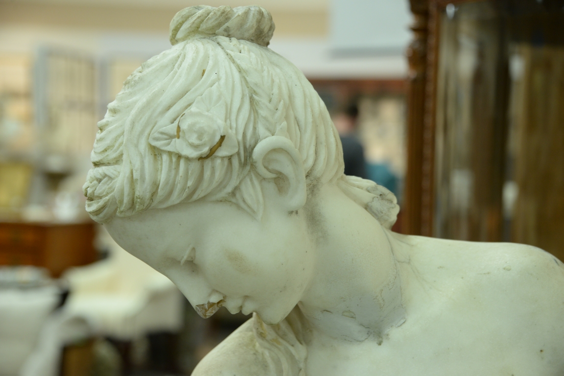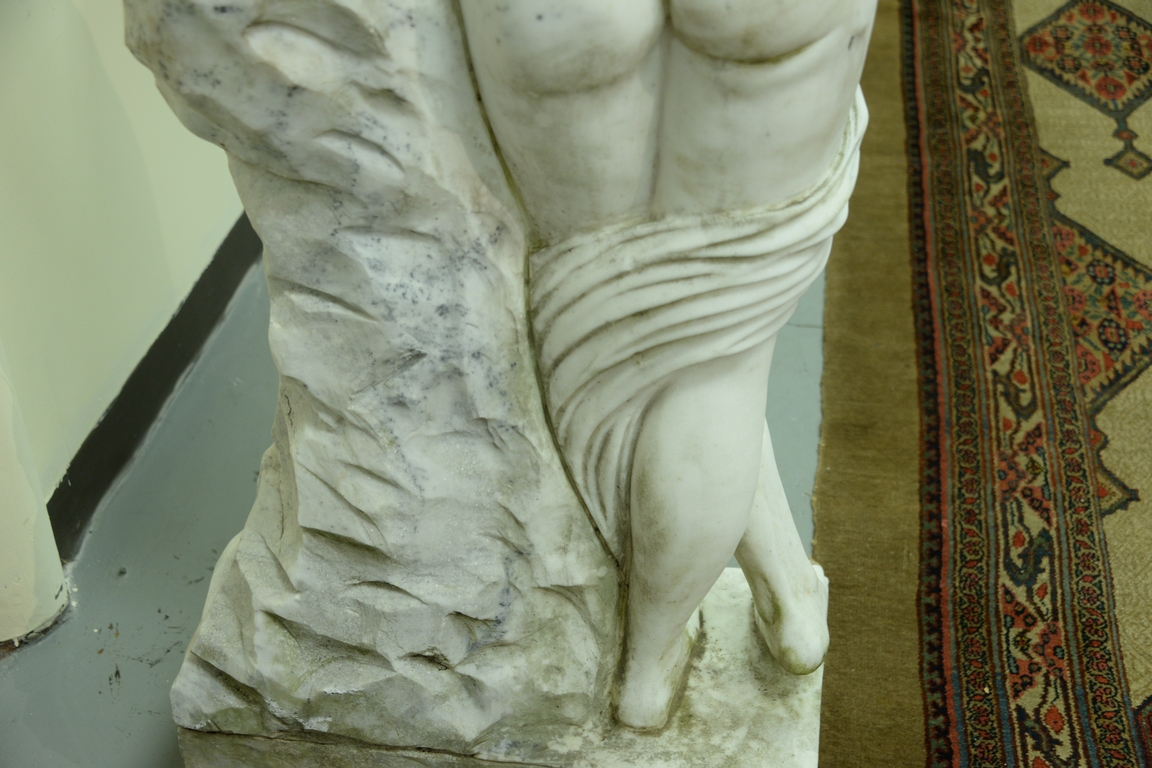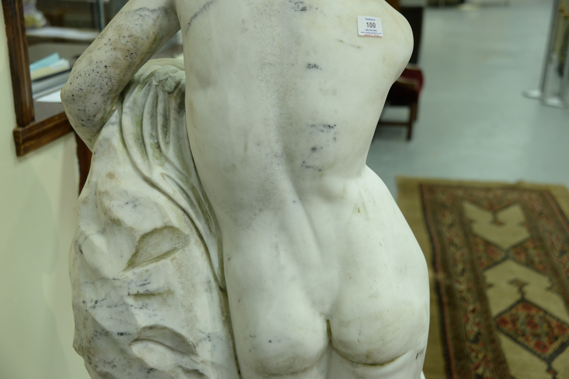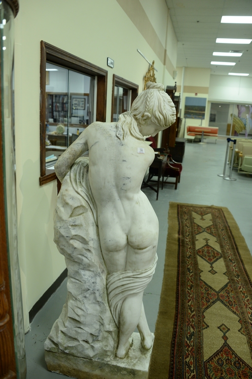 Lot 100: Life size white marble figure of a partial nude woman with hair in a bun standing legs crossed with partially draped robe pouring a…