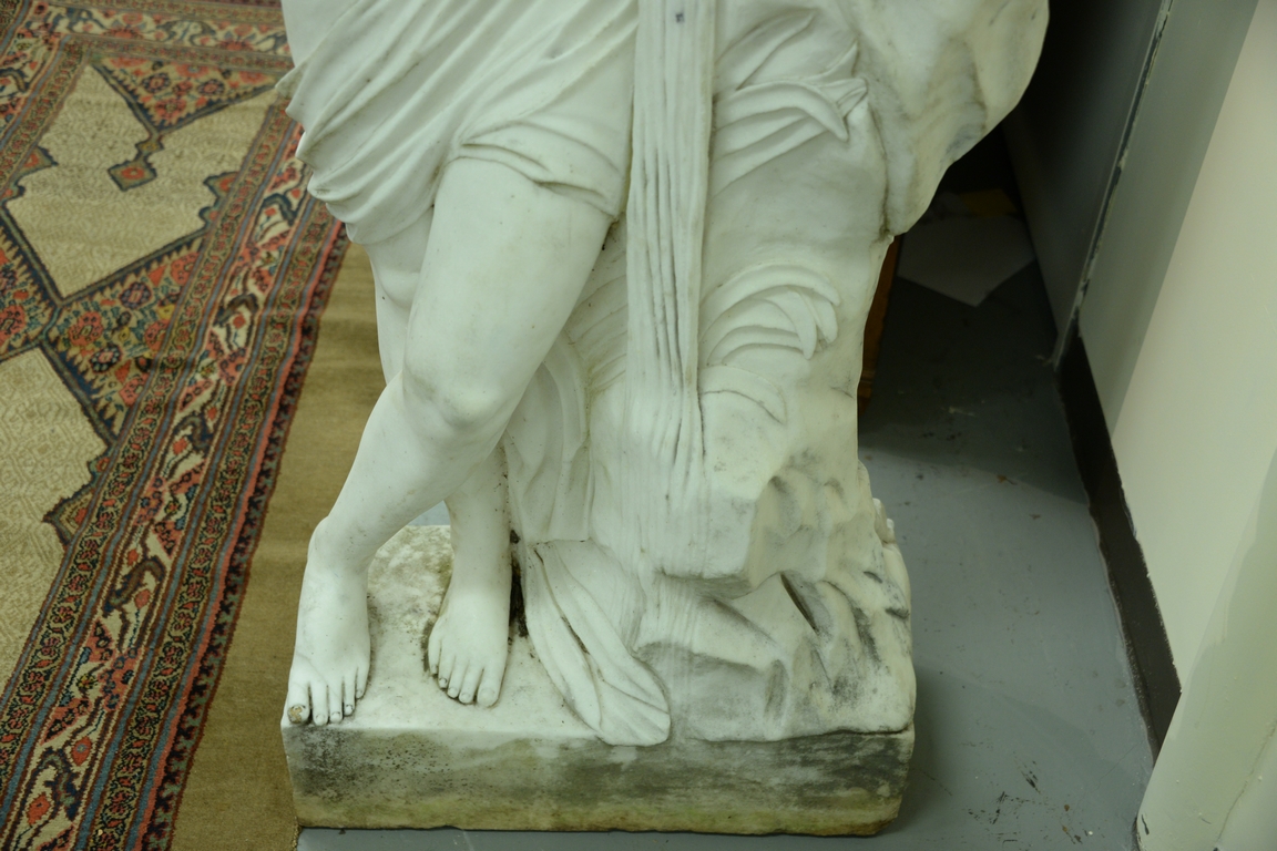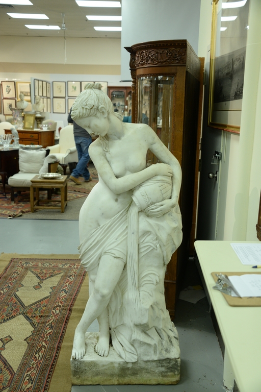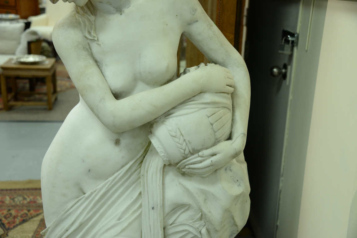 Life size white marble figure of a partial nude woman with hair in a bun standing legs crossed with partially draped robe pouring a jug of water set on rectangular base head was reattached, nose, flower, and ear repair. ht. 66in., wd. 24in., dp. 12in. Provenance: Collection of Anne Jones Willis and the late John Ralph Willis, New Jersey