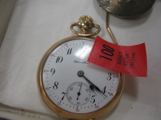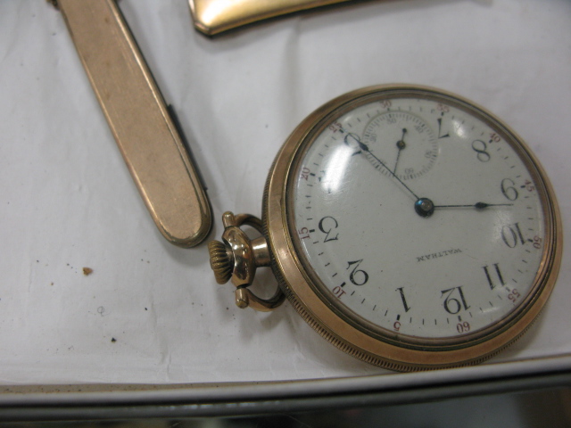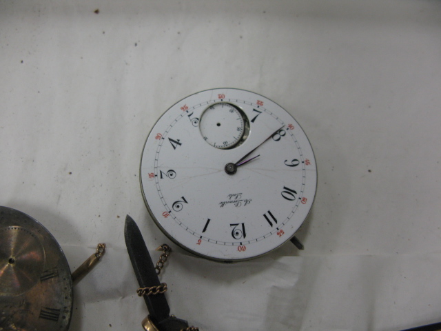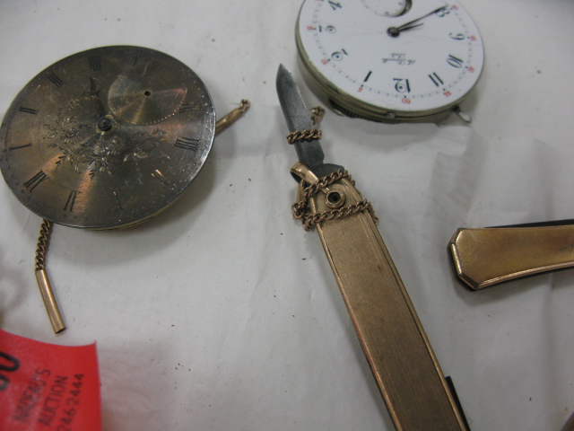 Lot to include two pocket watches, two works for pocket watches and jack knives with one chain