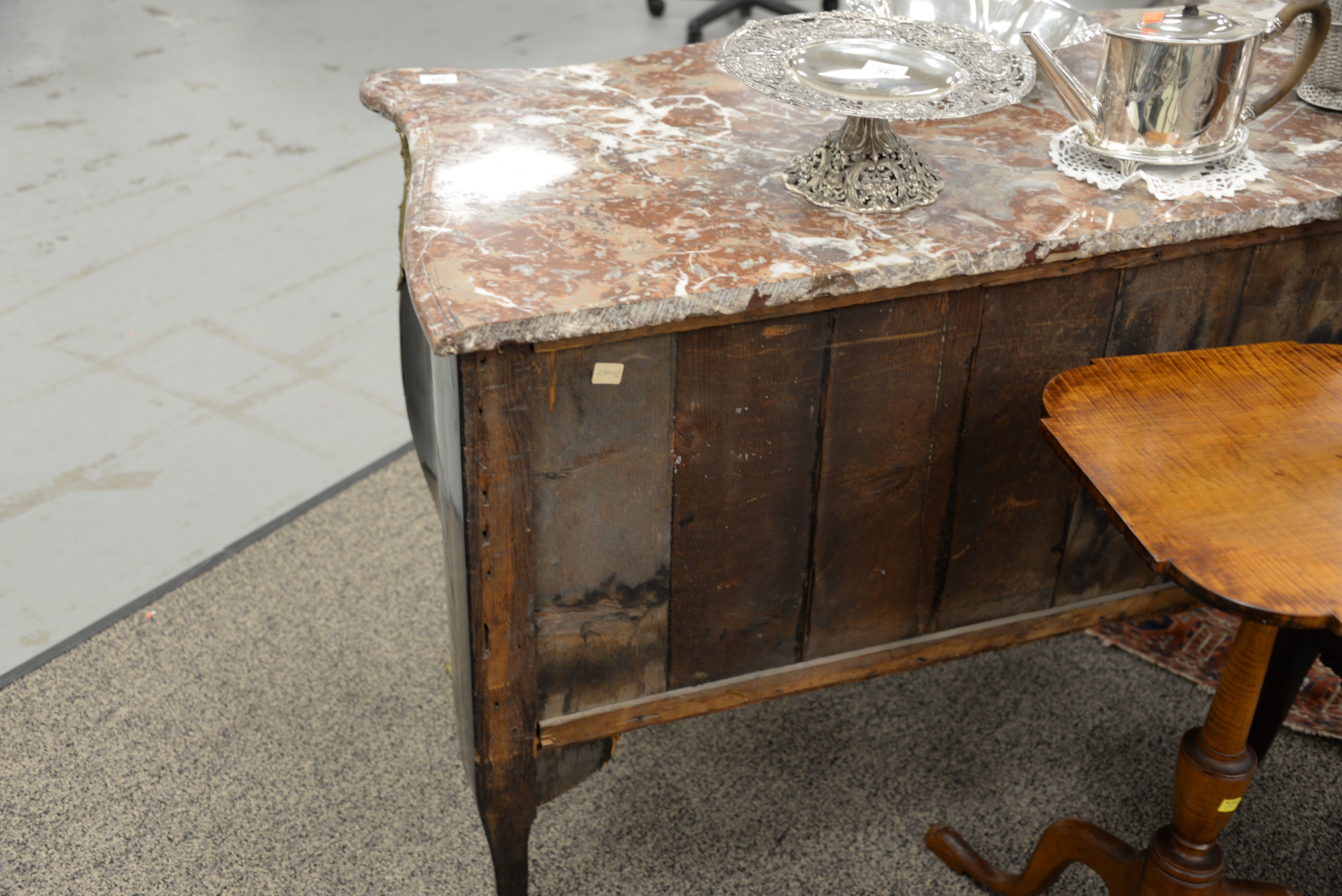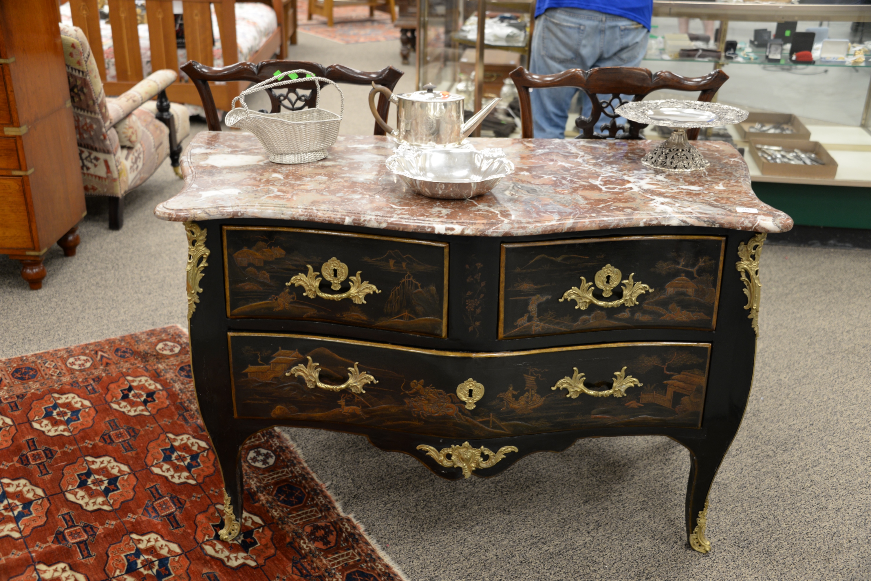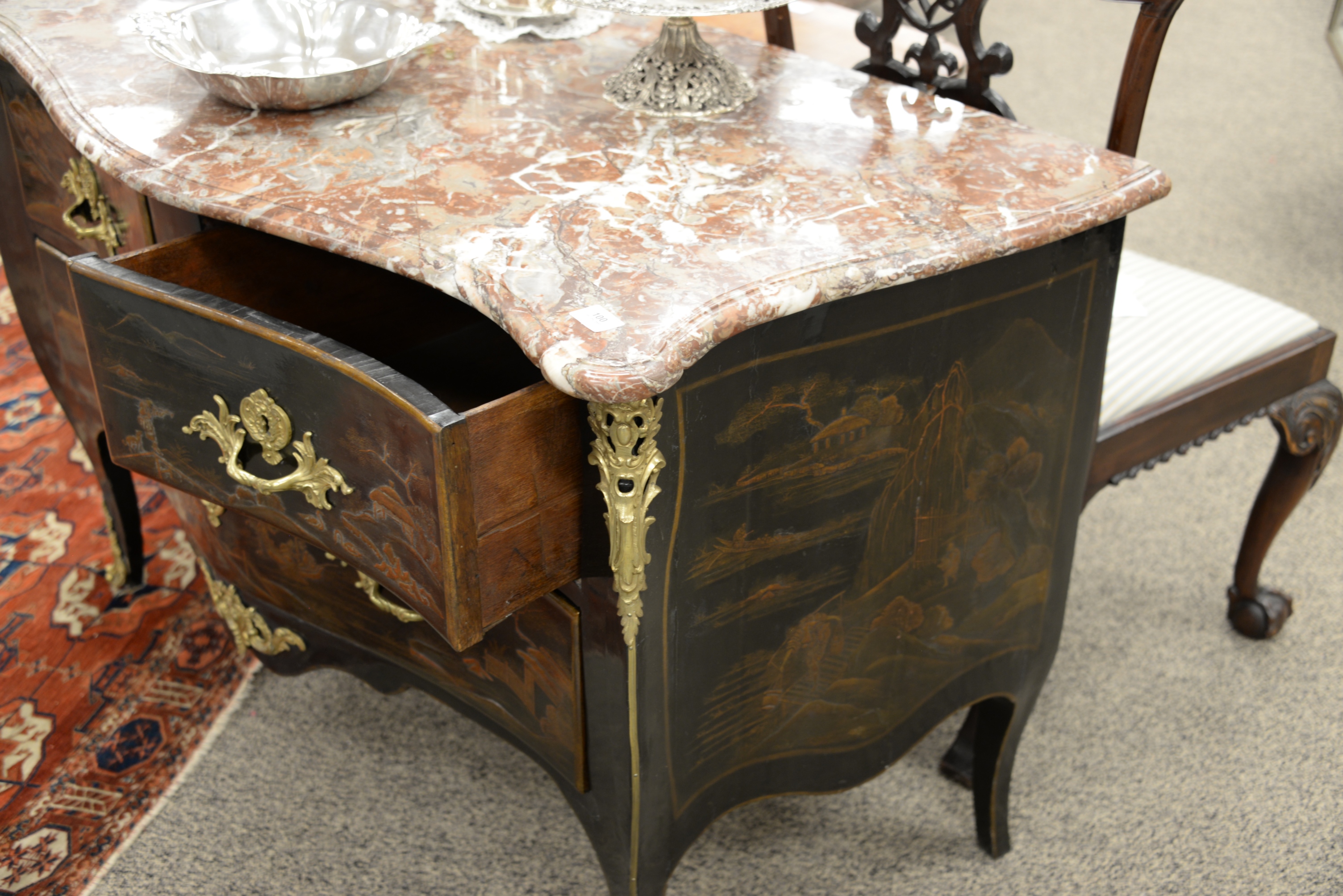 Louis XV Commode, having mottled marble top with serpentine front over conforming case, chinoiserie decorated with gilt bronze mounts and hardware, set on cabriole legs with gilt bronze mounts, (marble repaired), height 32 inches, width 51 inches, depth 25 1/2 inches.