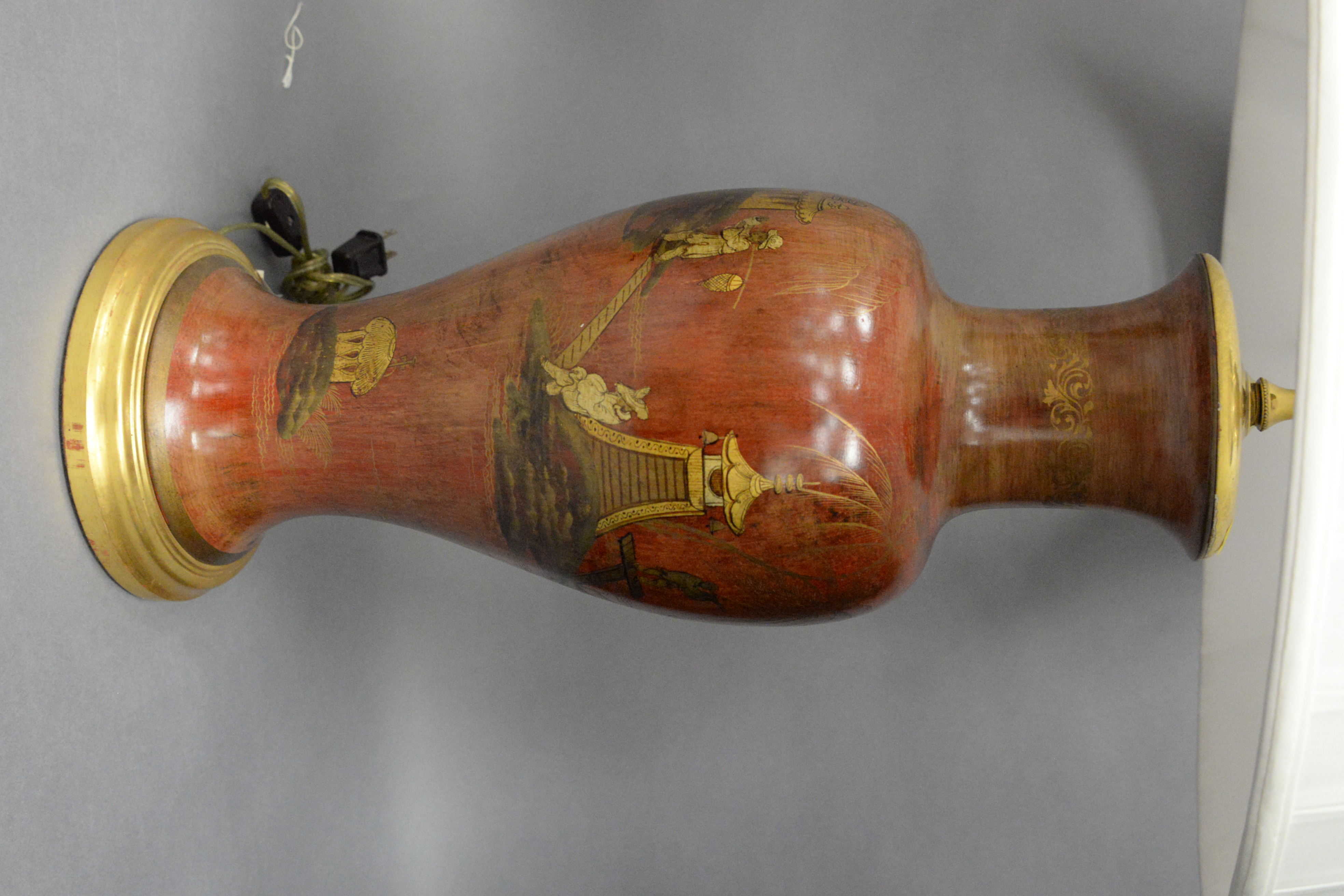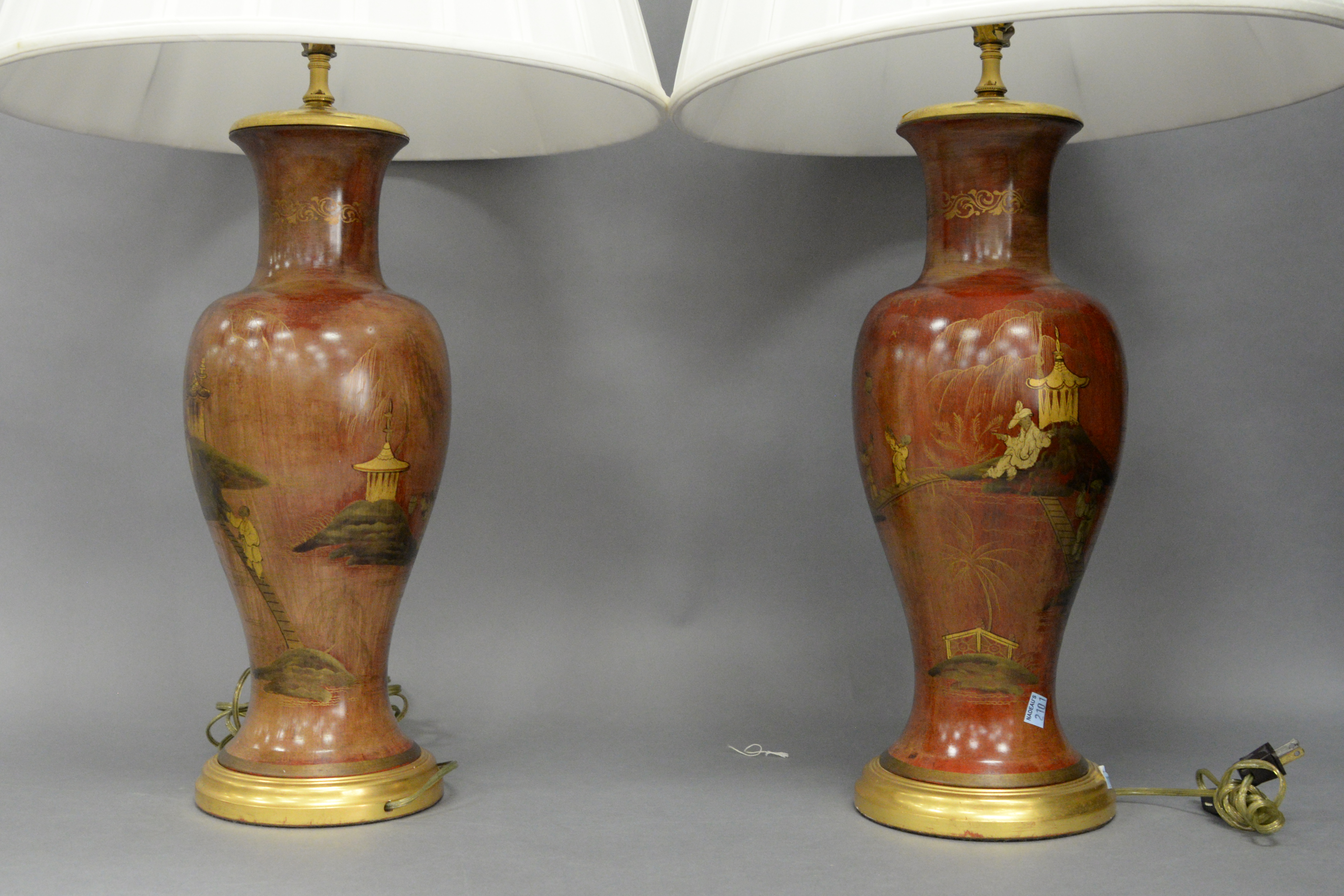 Pair of Japanese Vases, decorated with gold chinoiserie on distressed red ground, by William Mehornay London (vase height 18″) Provenance: Mallet, London 3/9/00 $5,200