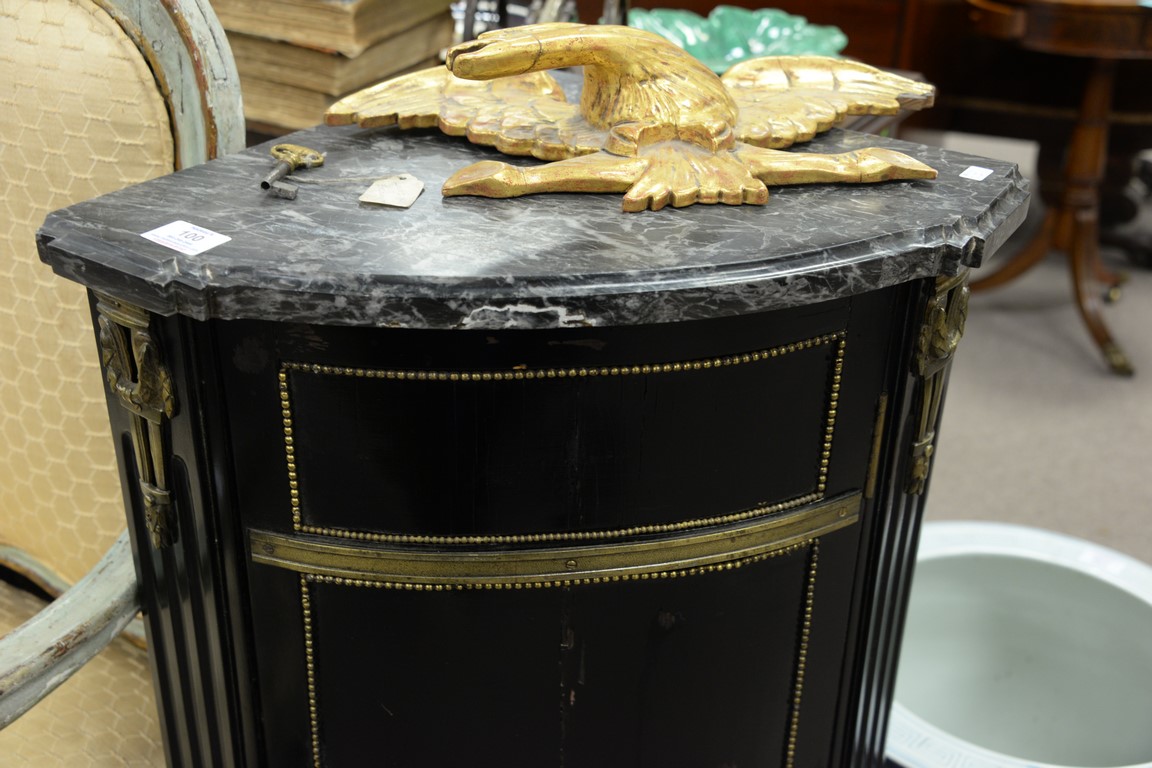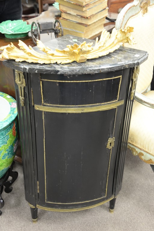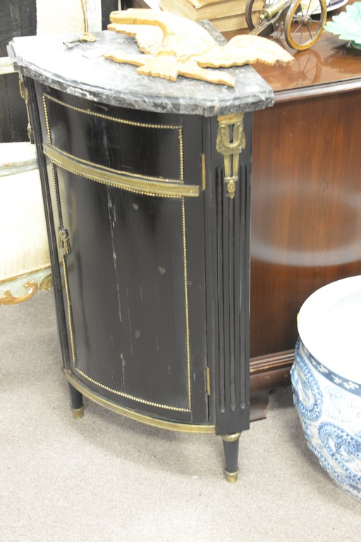 Lot 100: Pair of Louis XVI corner cabinets with grey marble top s over one door. ht. 35in., wd. 21in.