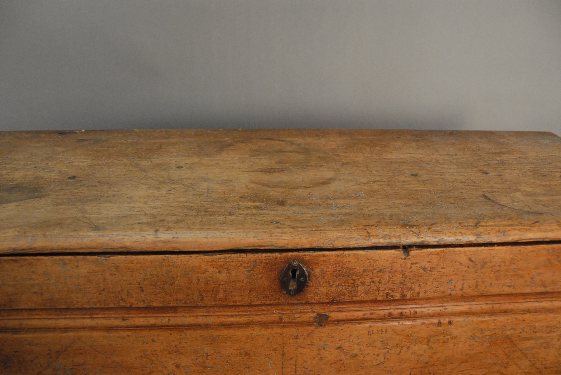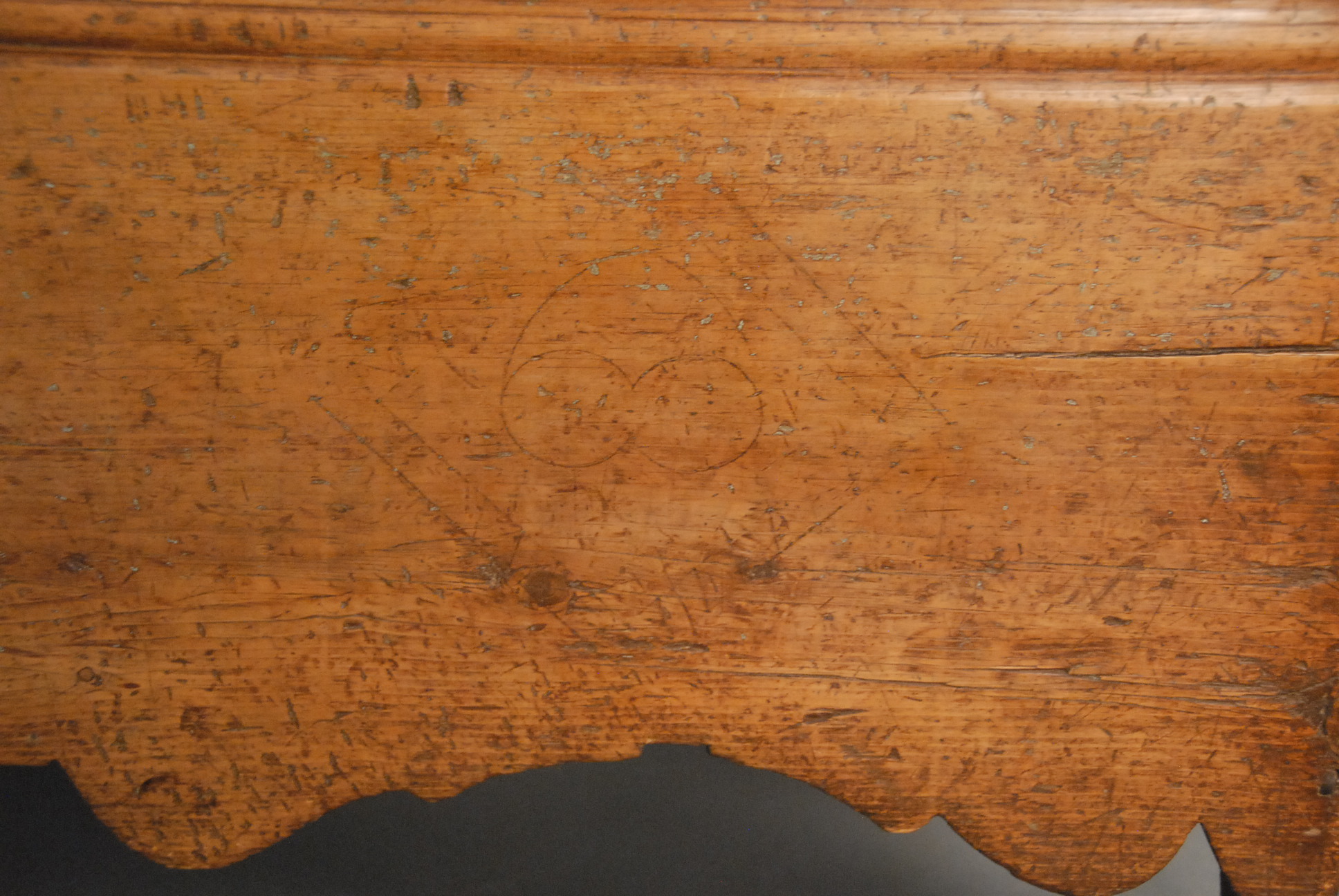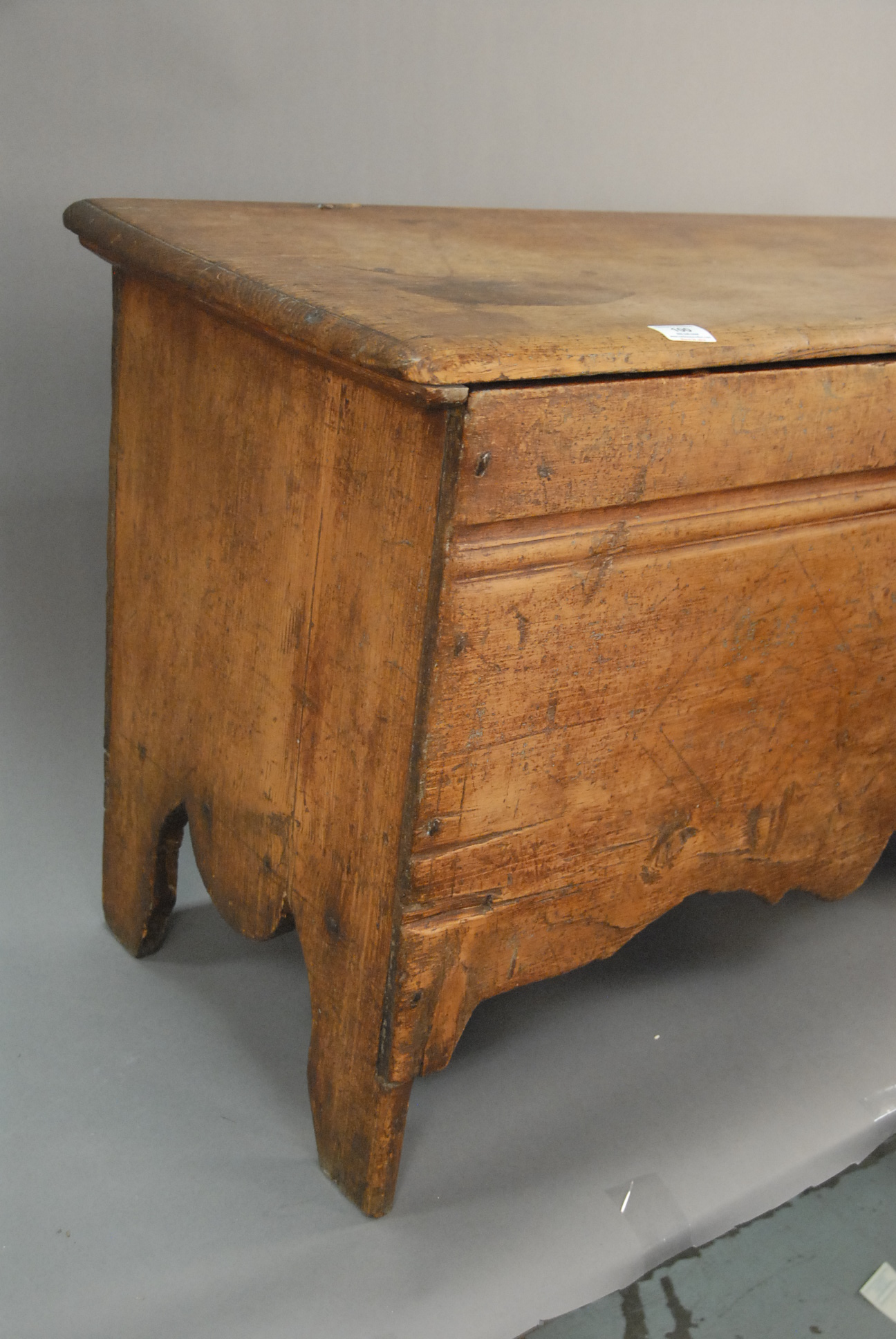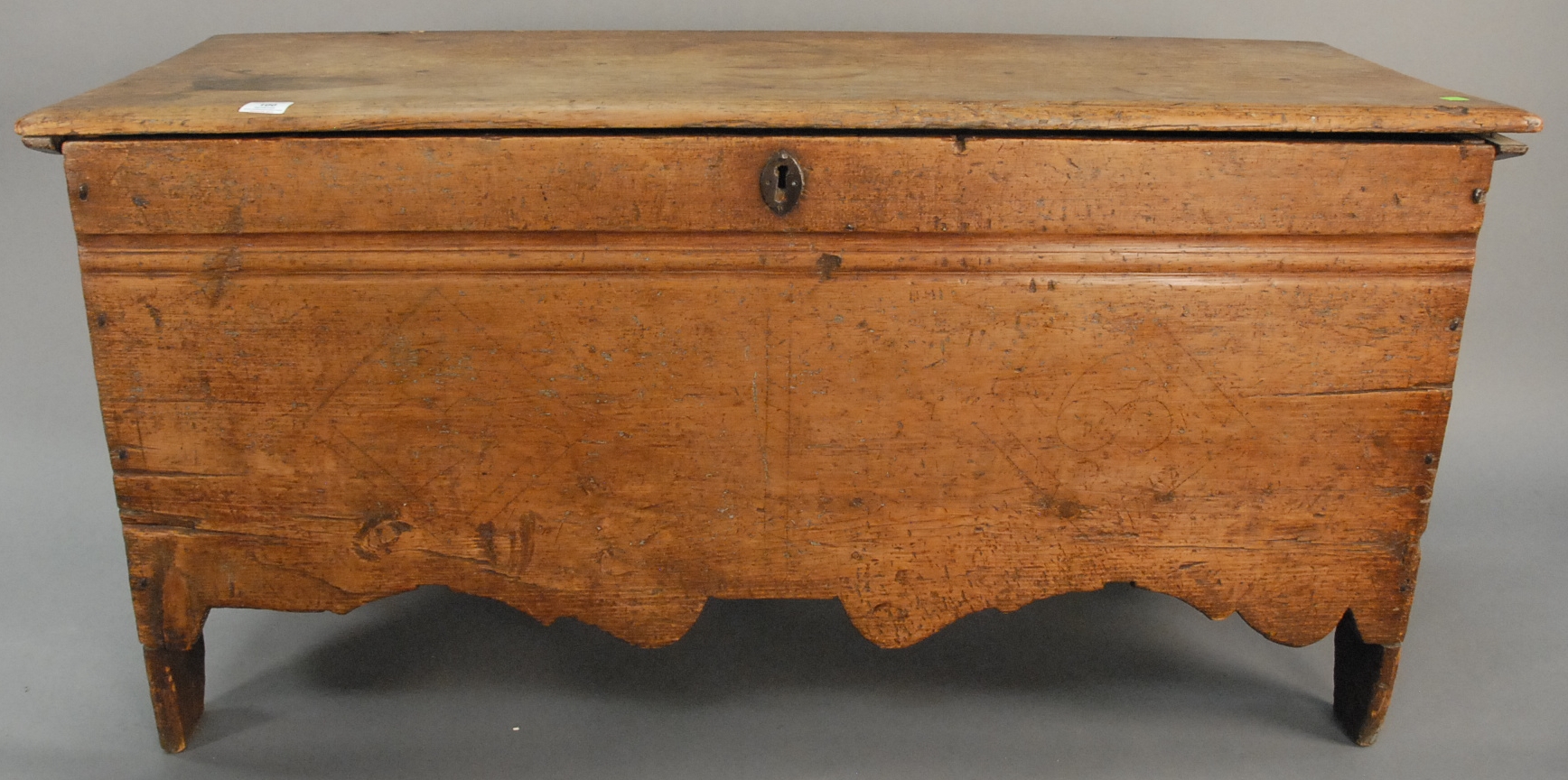 Lot 100: Pilgrim Century lift top chest with ribbon molding and unusual scalloped skirt, remnants of old finish. ht. 25 1/2in. wd. 46 1/2in.