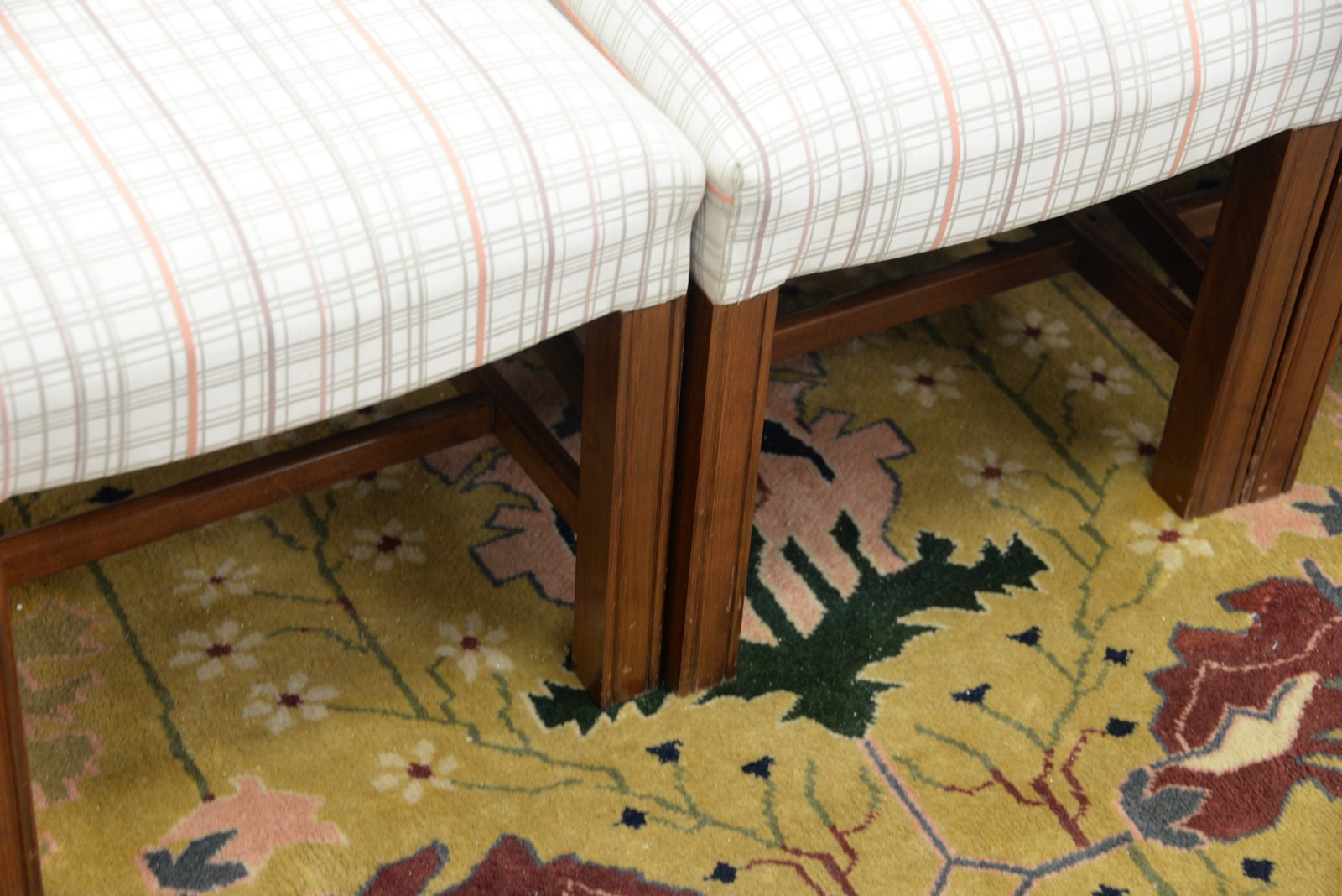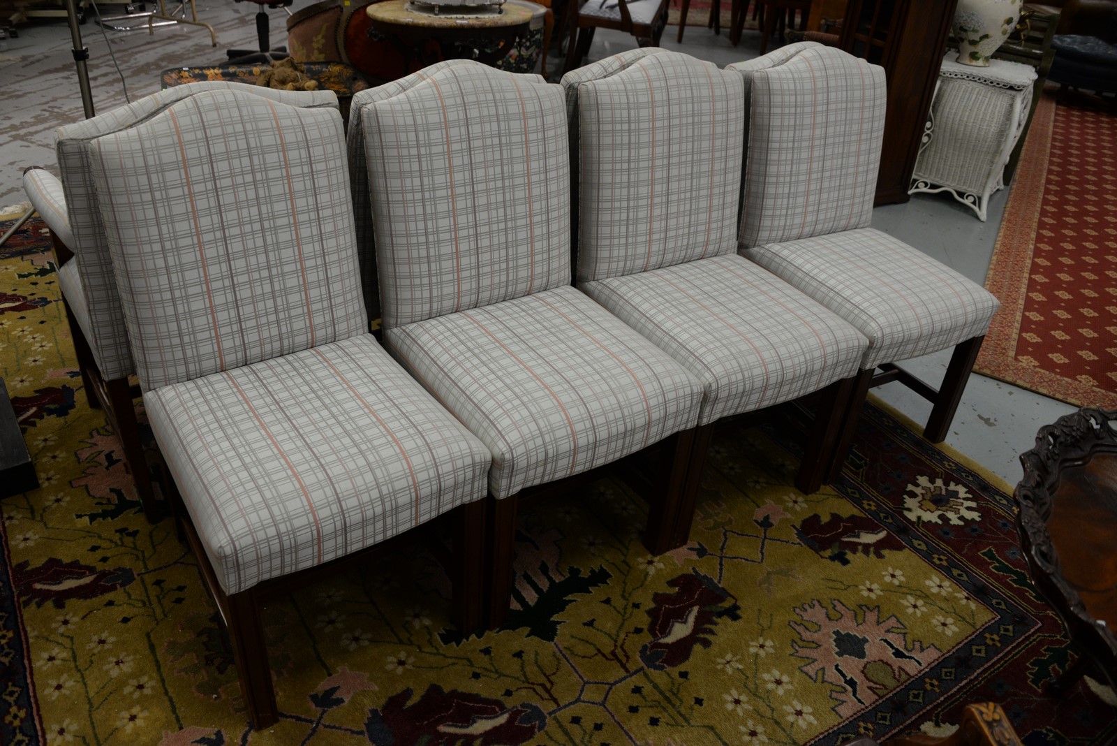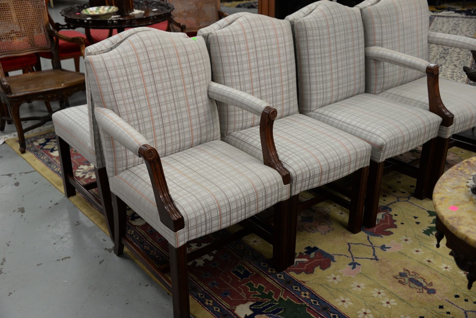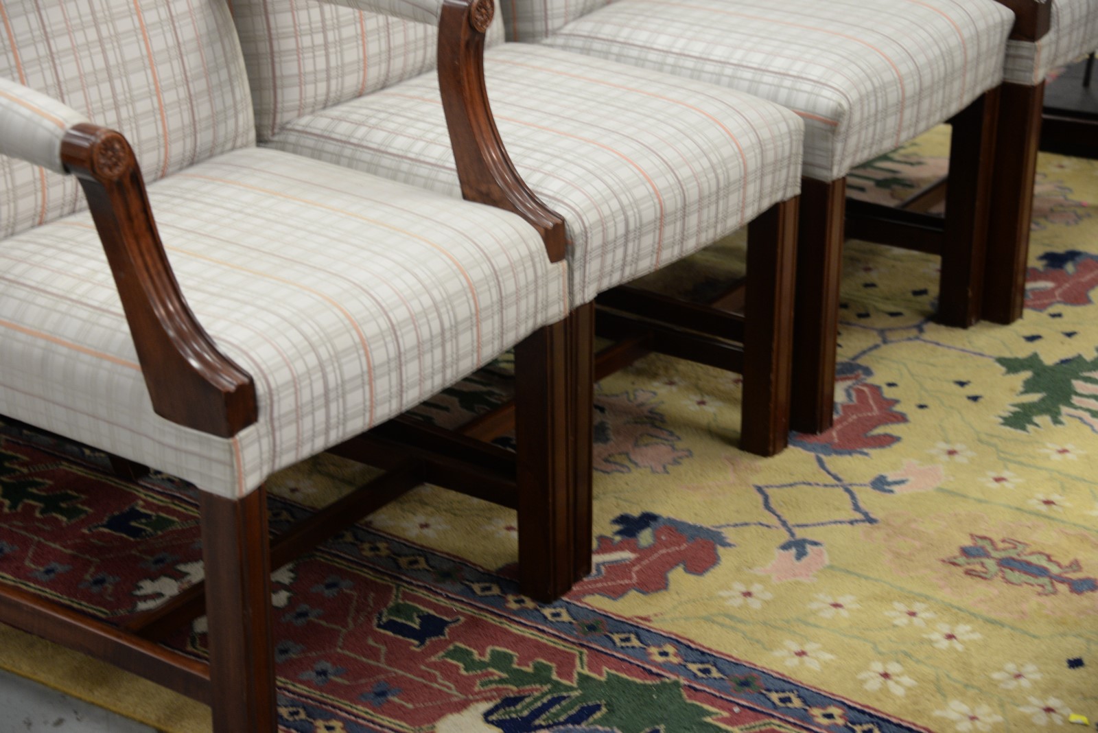 Set of eight contemporary Chippendale style chairs, two arms and six sides.