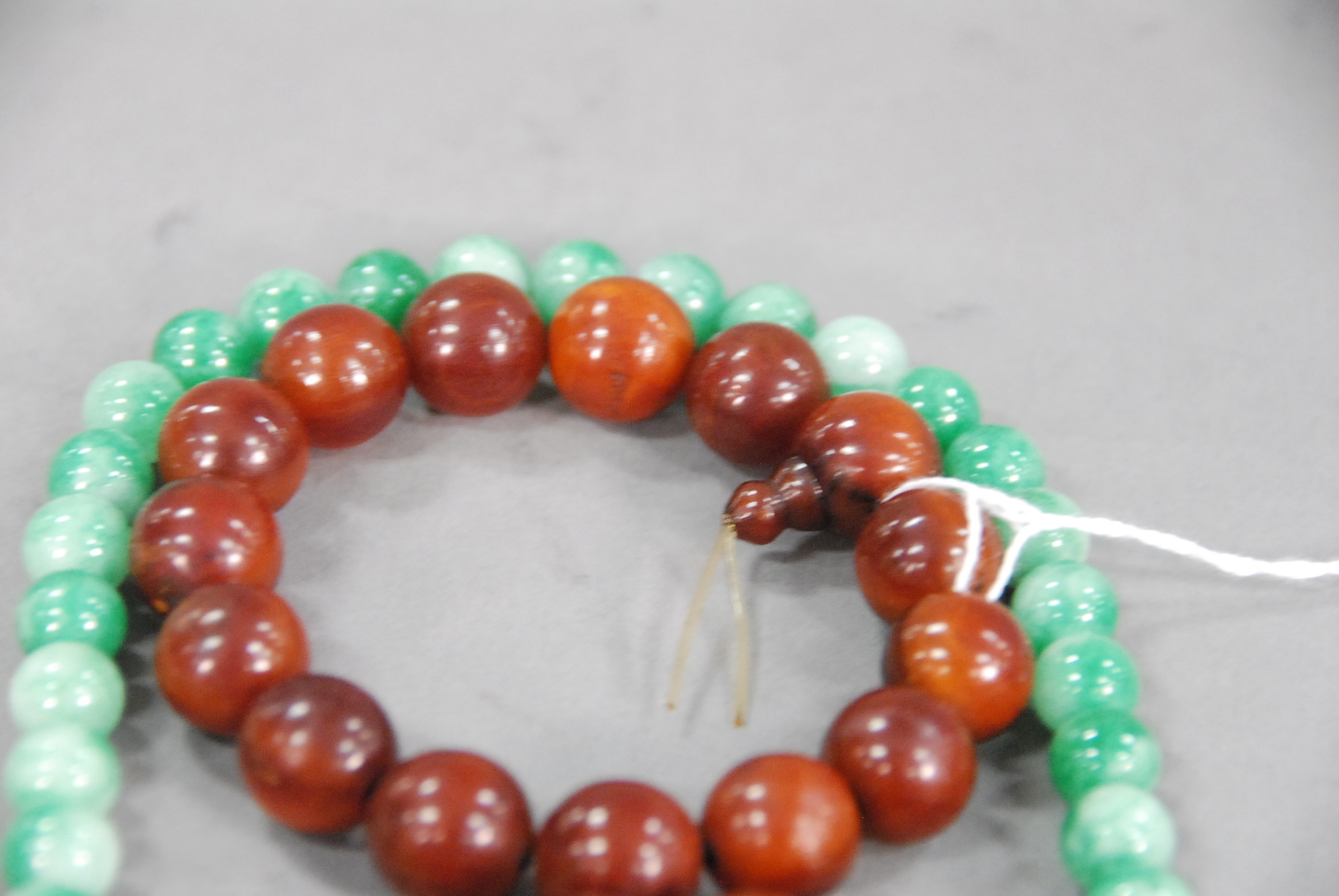 Three items to include jadeite necklace and a pair of rhino horn bead bracelets.