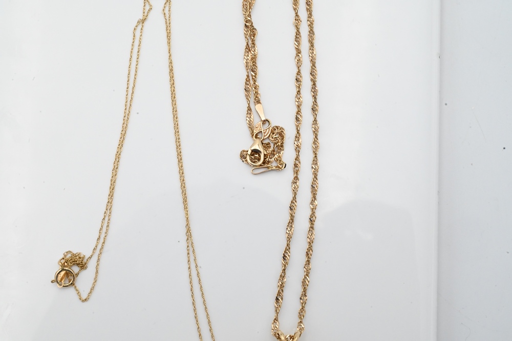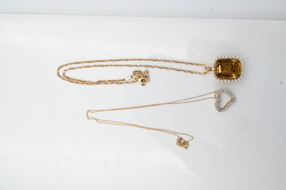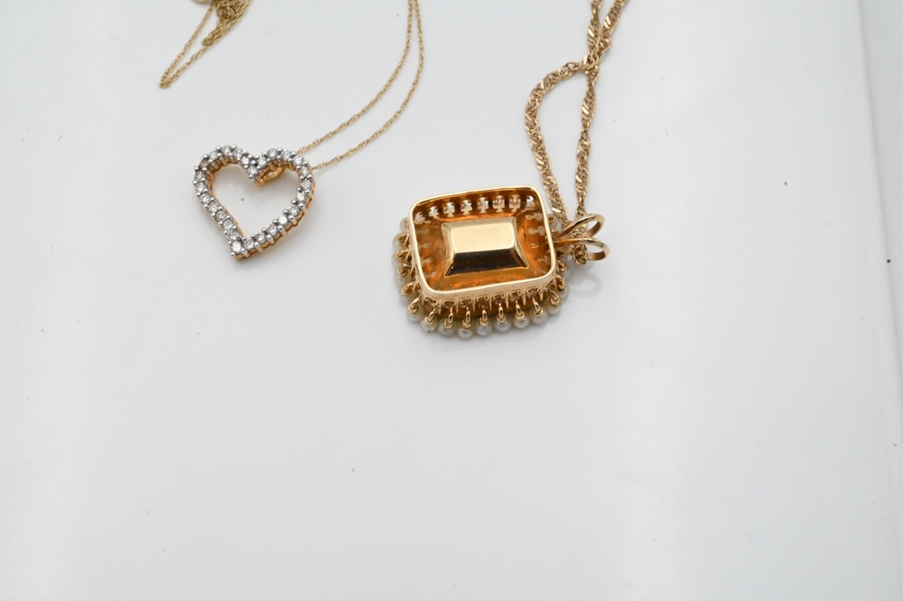 Two Piece 14 Karat Yellow Gold Pendants and Necklaces, one set with diamonds, one with citrine and pearl surround, 17.7 grams.