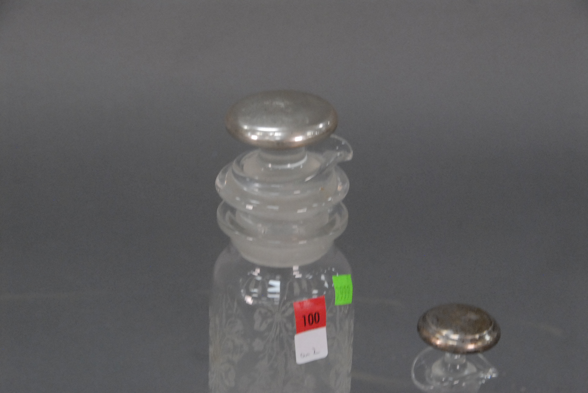 Lot 100: Two piece lot crystal mounted with sterling silver cocktail shaker and small crystal bottle with silver overlay top marked Hawks, h…