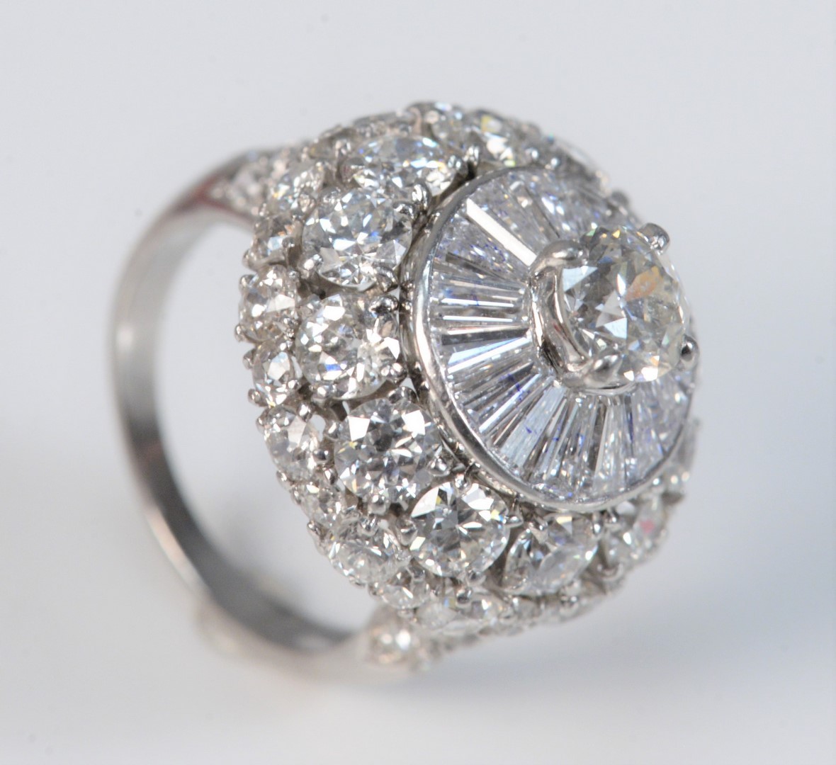 Lot 100B: Platinum Large Diamond Dome Ring center set with 1 round European cut diamond, set in 4 prongs, with an approximate carat weight of …