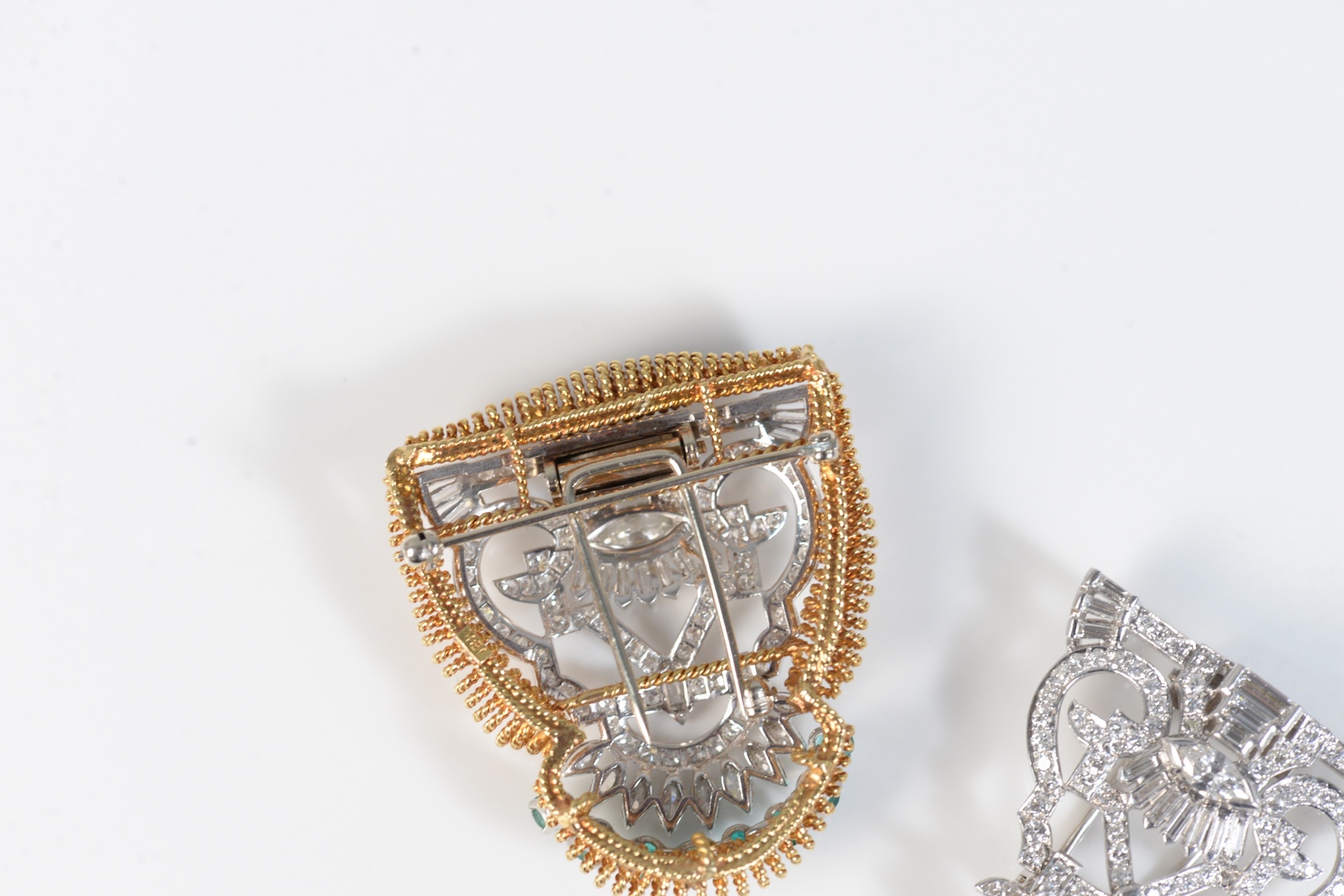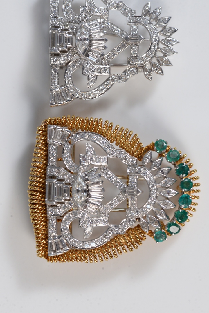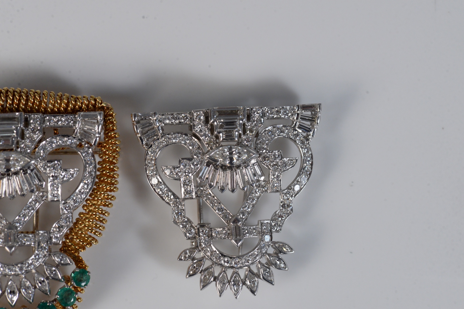 large clips are each set with 17 baguette cut diamonds, 10 marquise cut diamonds and 85 round diamonds