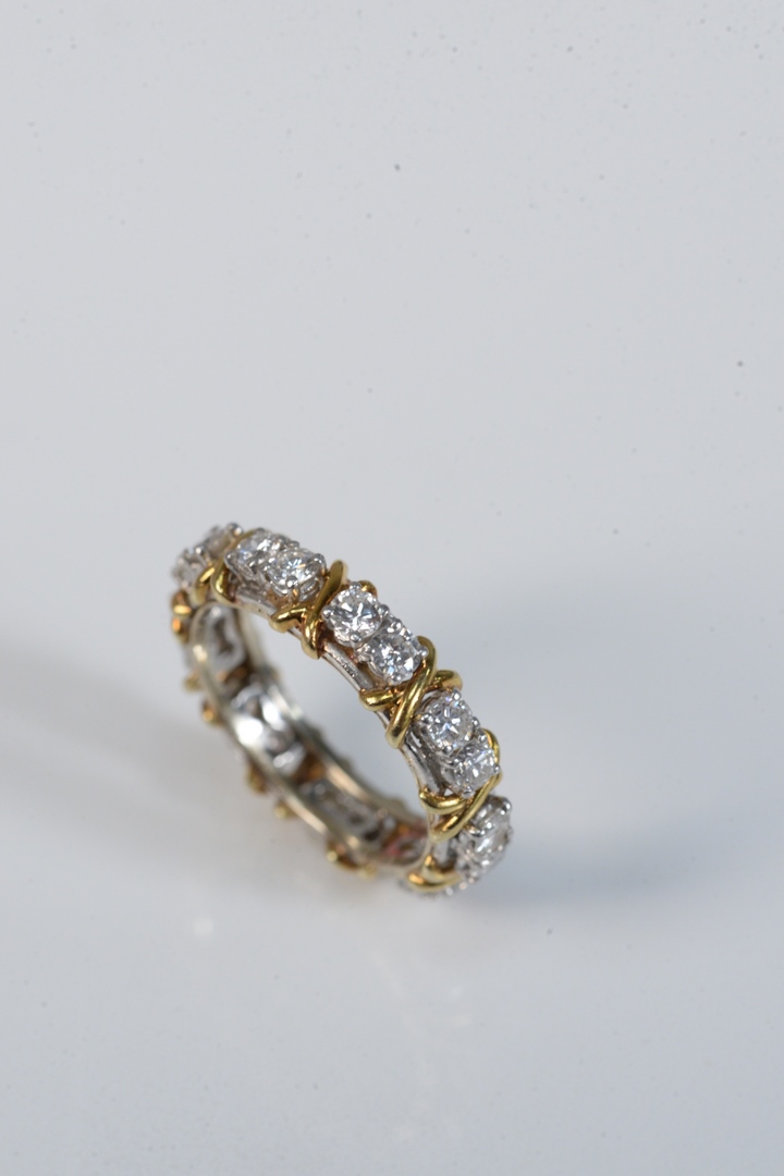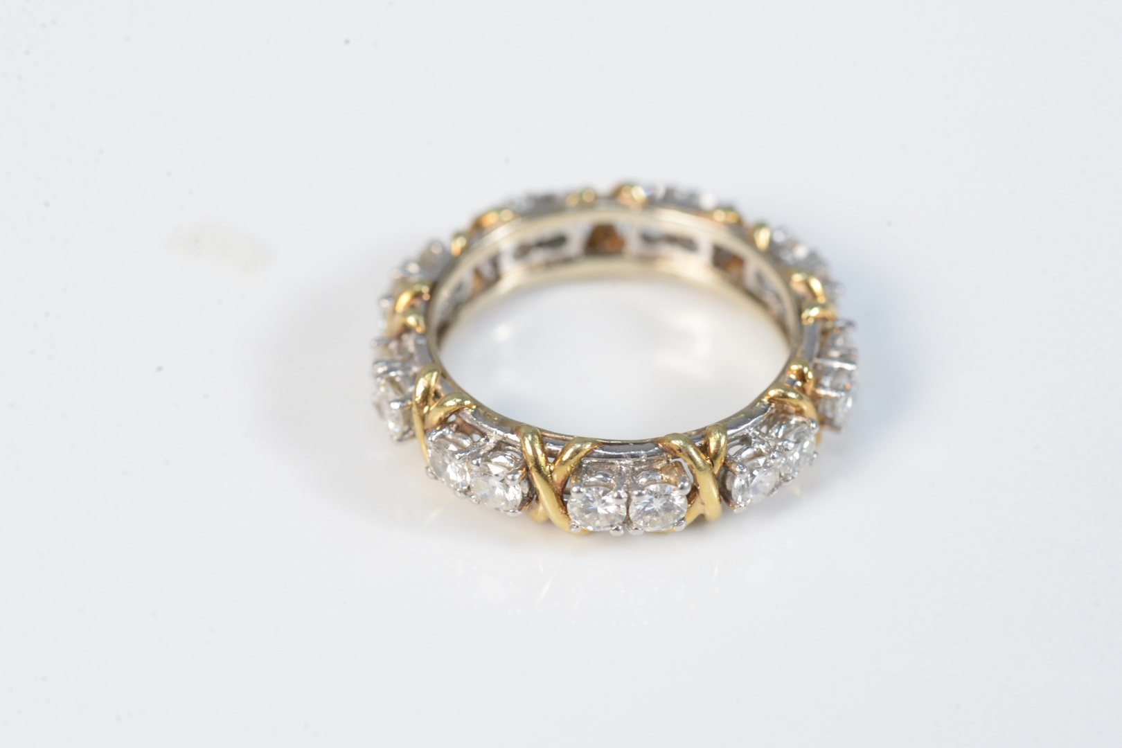 Lot 100G: 18 Karat and Platinum Hugs and Kisses Diamond Eternity Band with sets of two diamonds alternating with gold X’s in between set of di…
