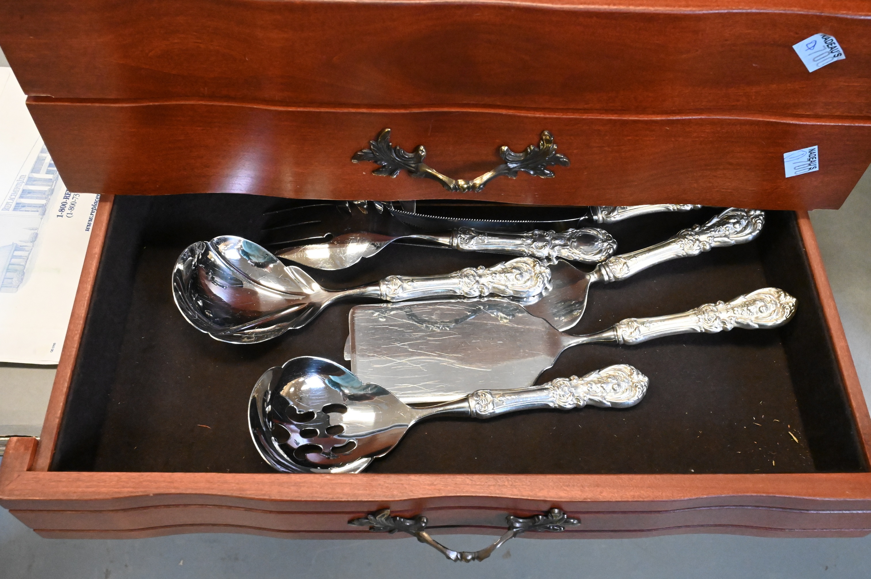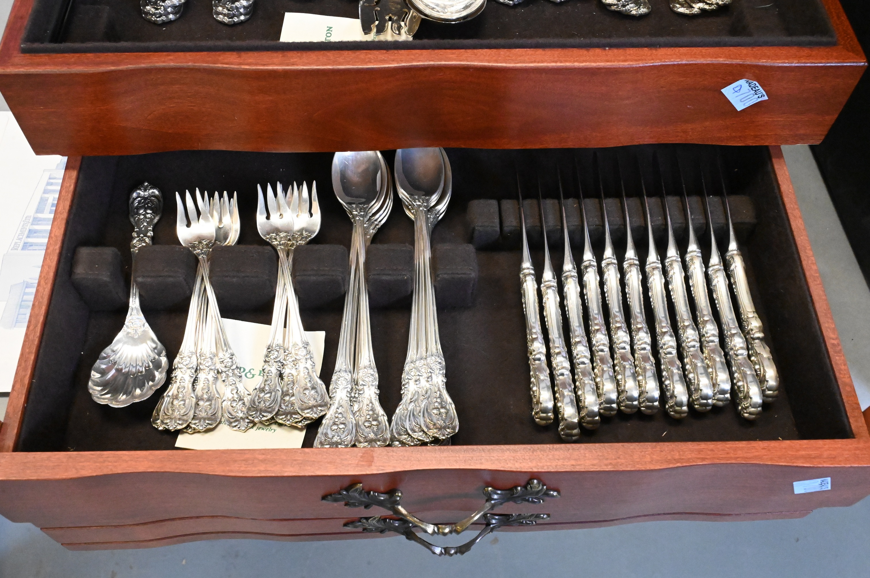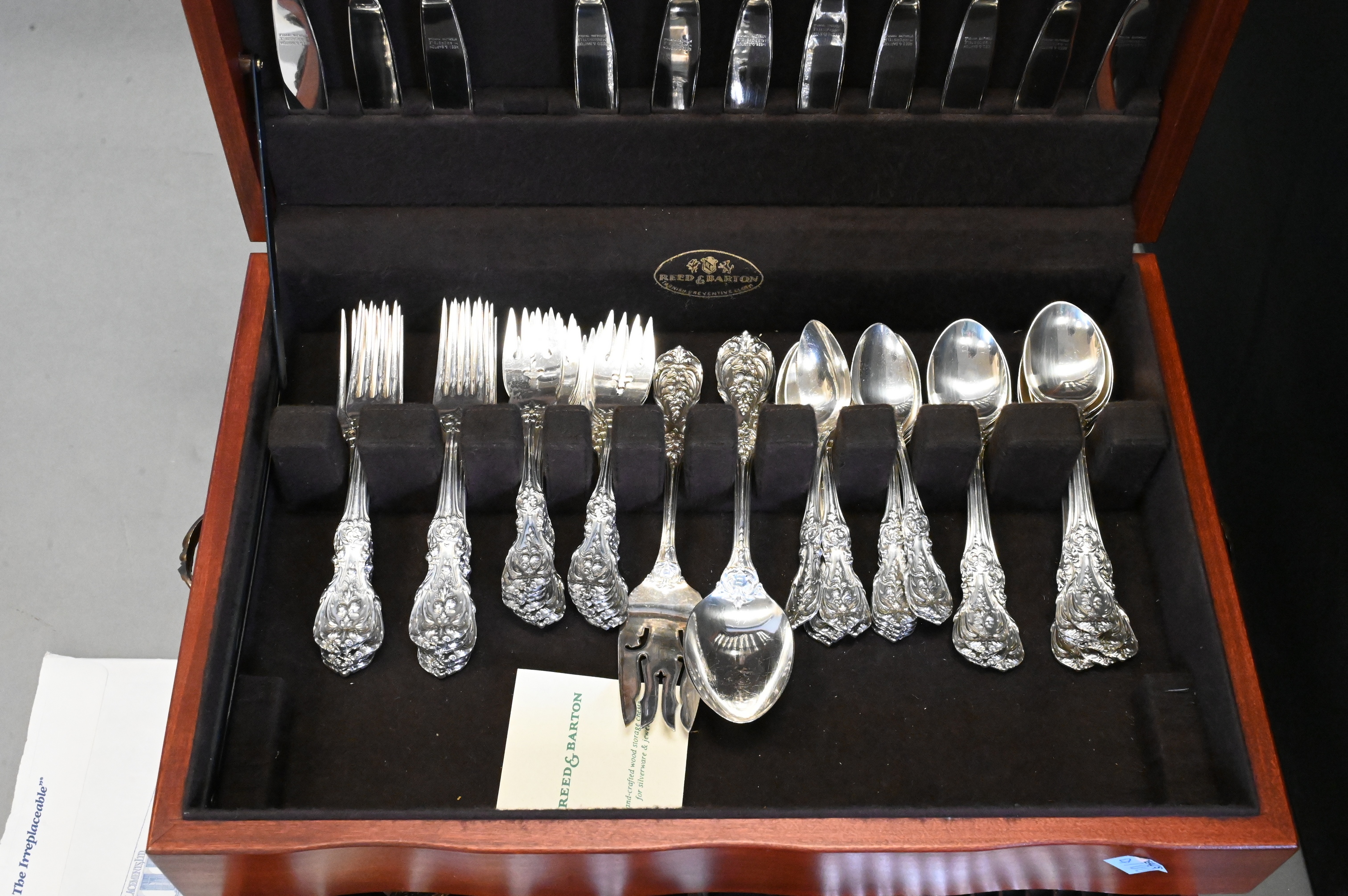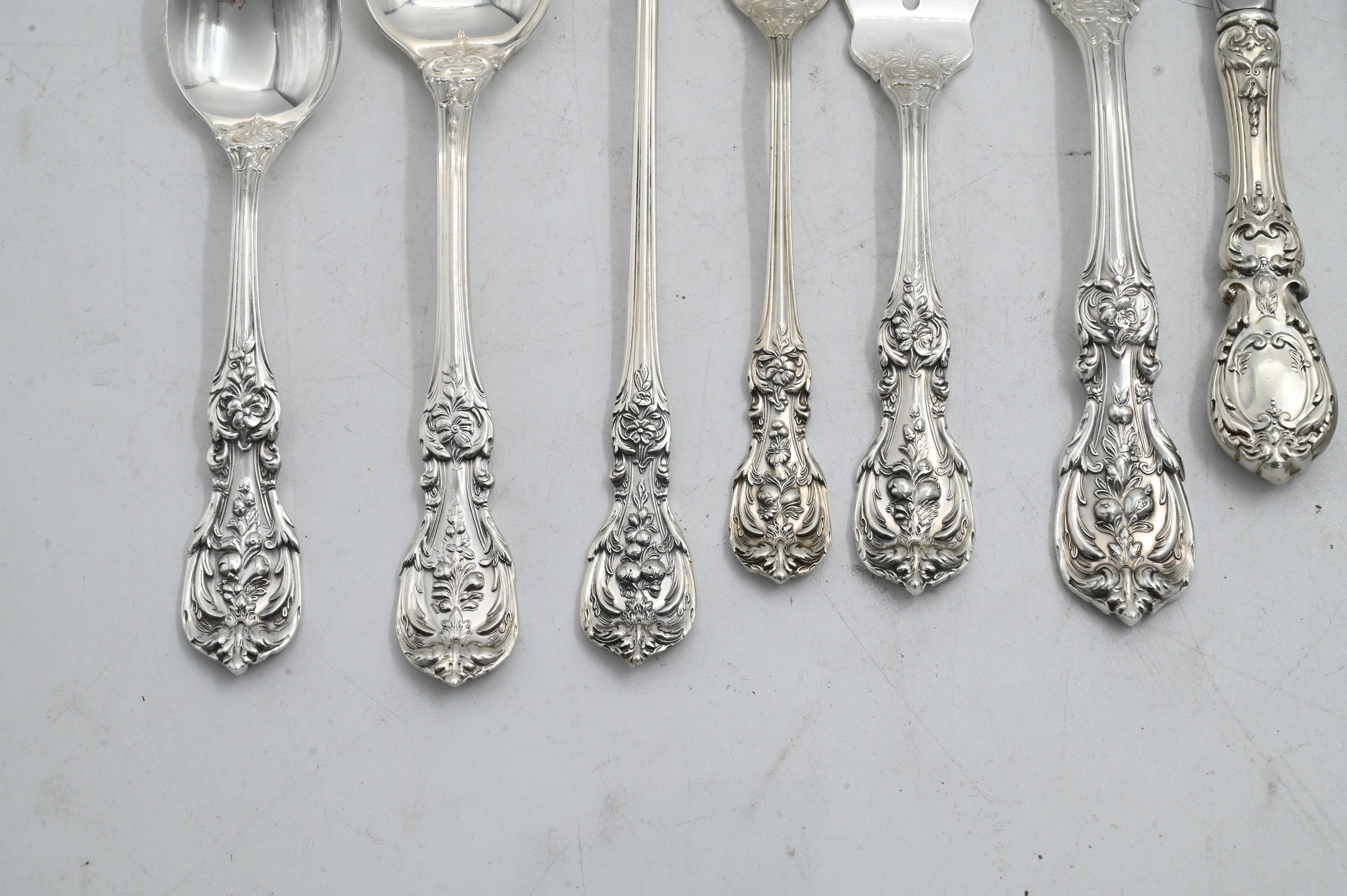 to include 12 luncheon forks, 12 salad forks, 12 cocktail forks, 12 tablespoons, 12 teaspoons, 12 iced tea spoons, 12 knives, 12 butter knives, 13 serving pieces