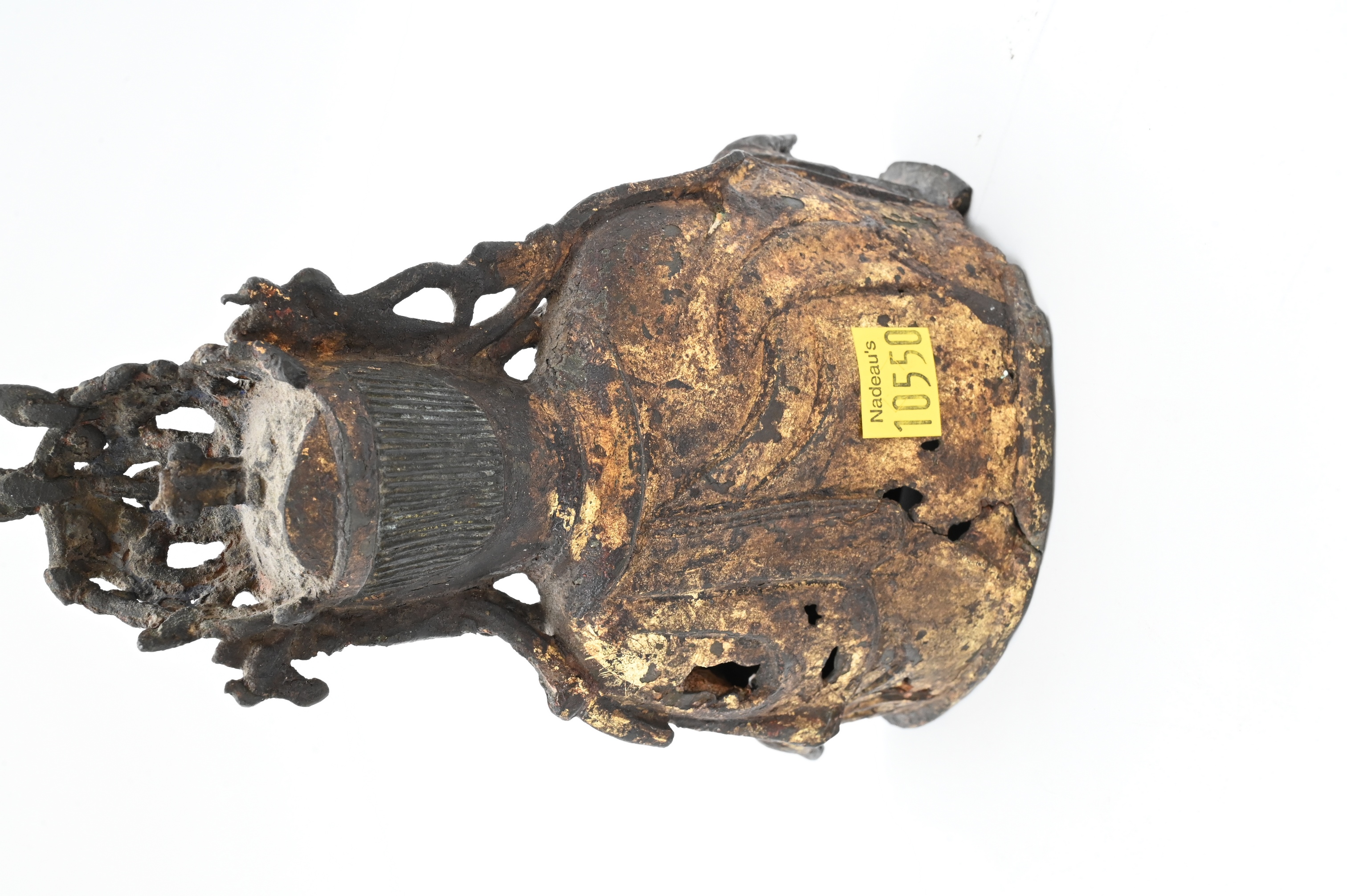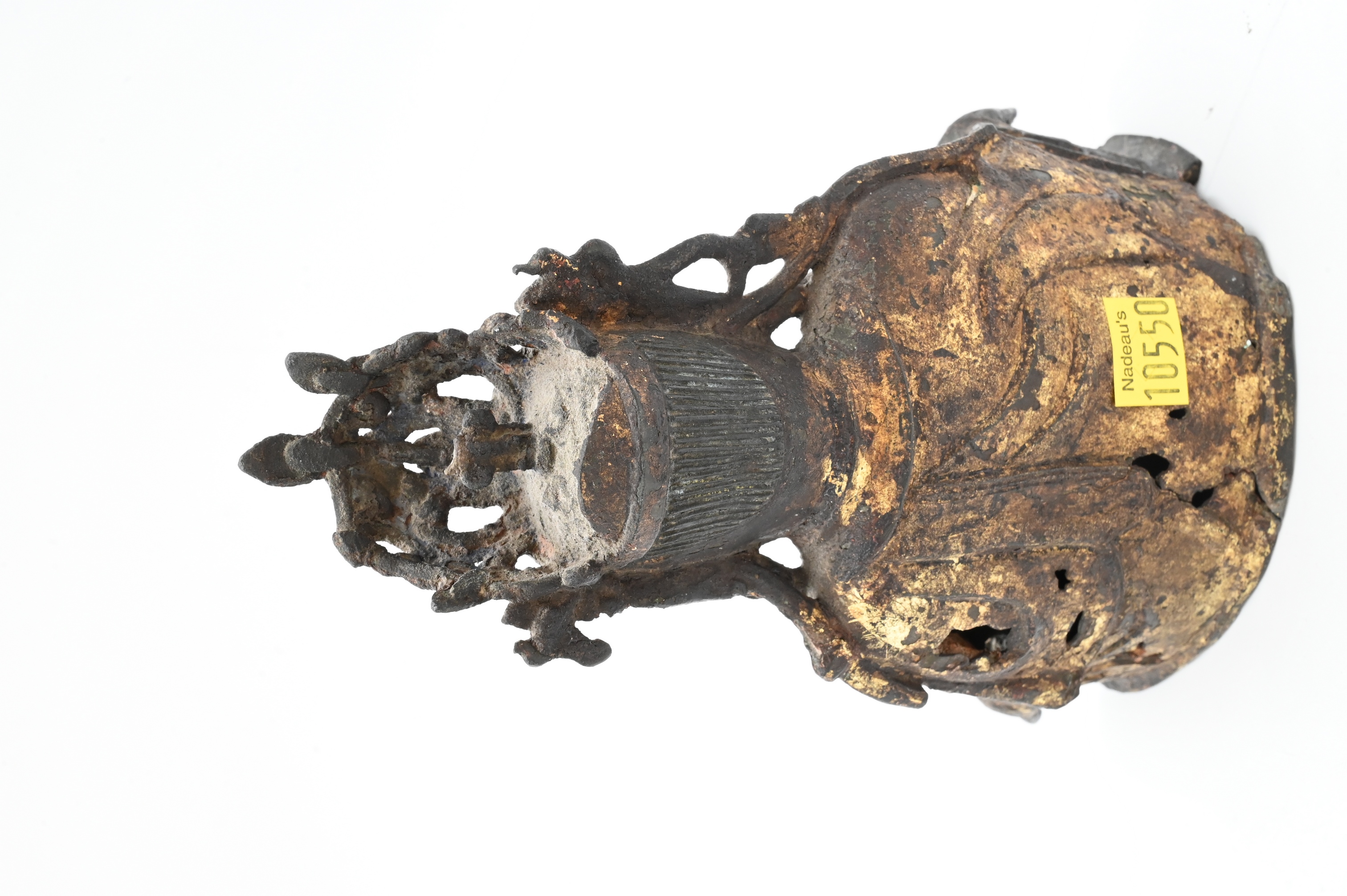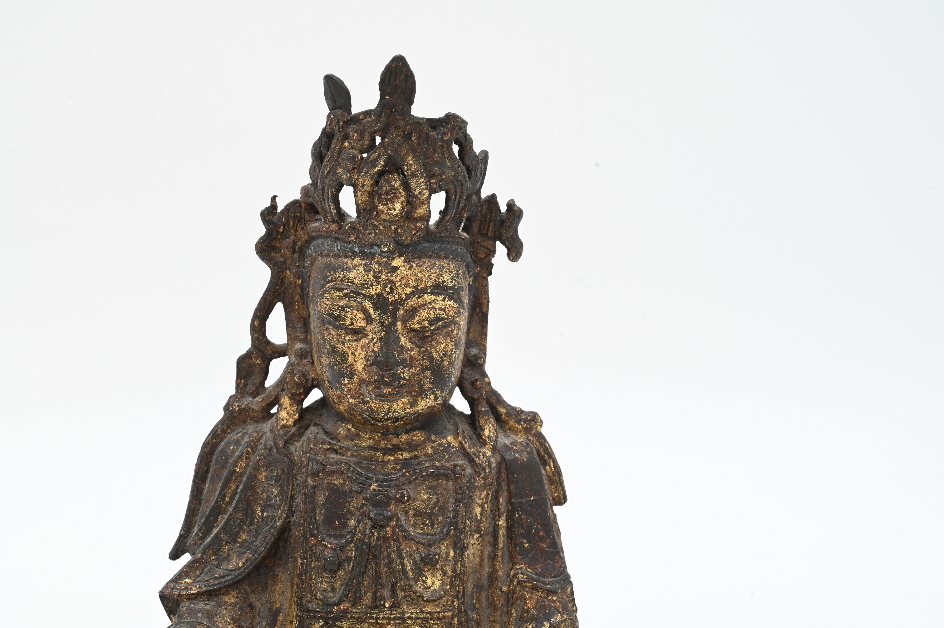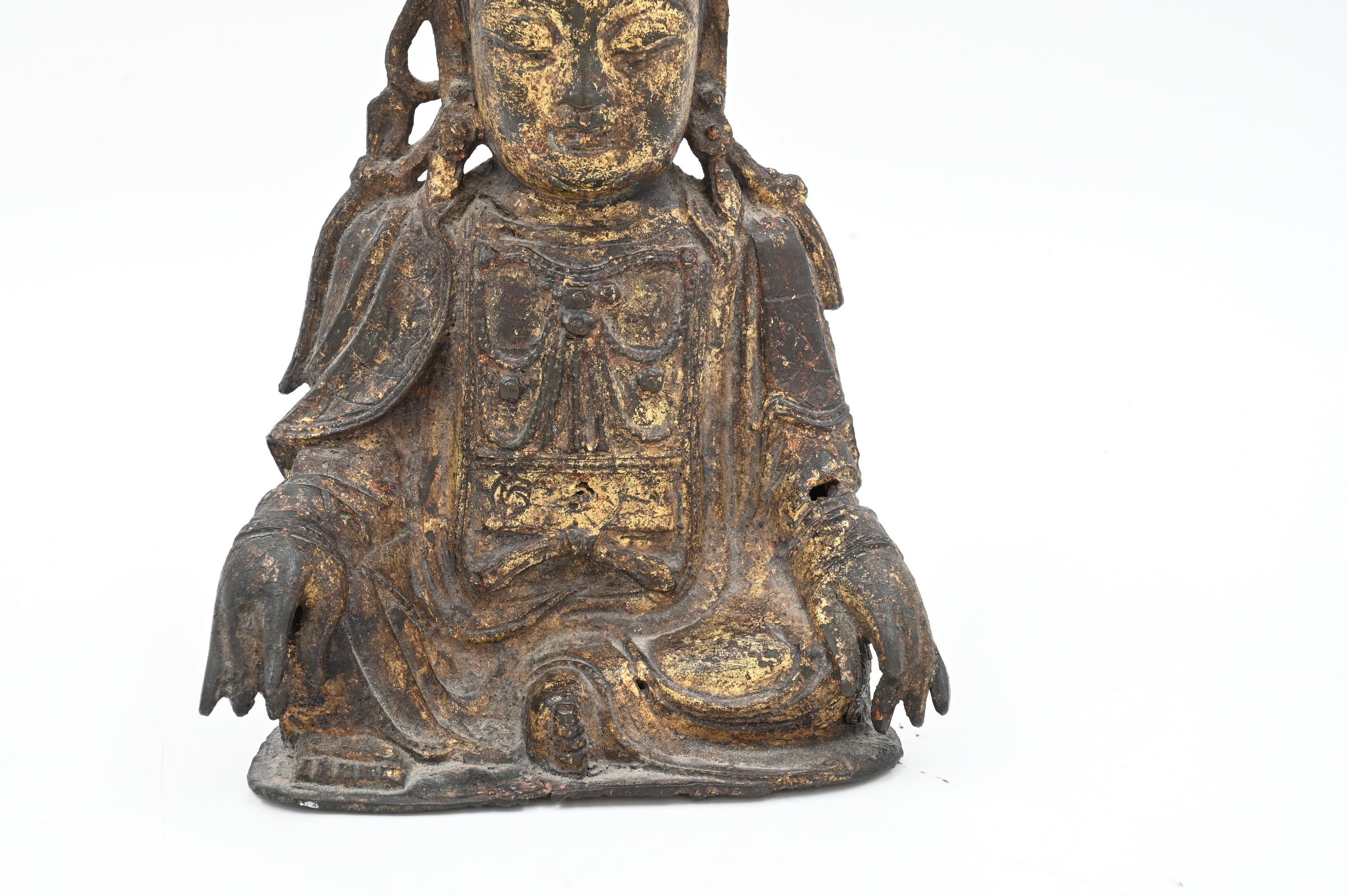 featuring the seated Buddha with tall crown, elongated earlobes, ornate dress, gilt remnants, Ming Dynasty or later