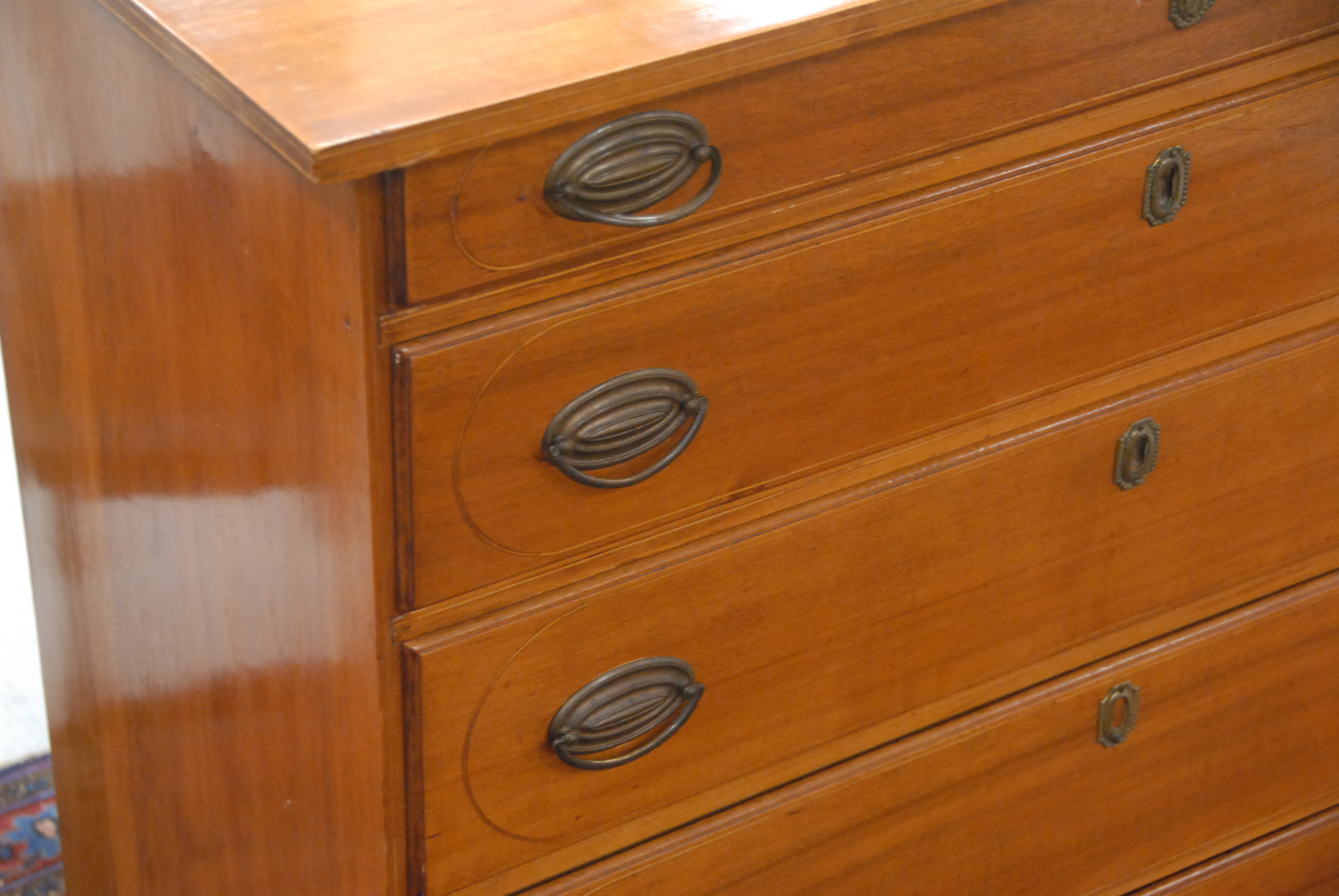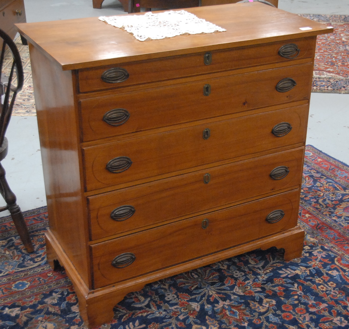 Lot 101: Chippendale chest with rectangular top over five graduated drawers all set on cut out bracket base, drawers having oval line inlays, 18th century. ht. 37 in. wd. 37 1/2 in. dp. 18 1/2 in.