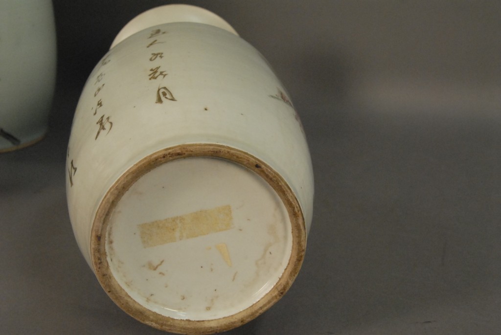 Lot 101: Famille Rose porcelain baluster vase with painted scene with four women in a courtyard, molded foo dog head handles and flared rim, …