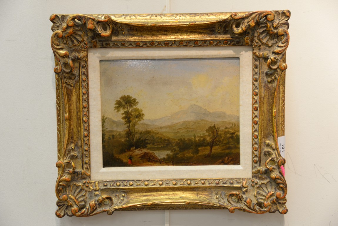 Lot 101: HENRY P. HUNT Mountainous Valley Landscape oil on board signed and dated on reverse H.P. Hunt March 10th 1852 8 x 10