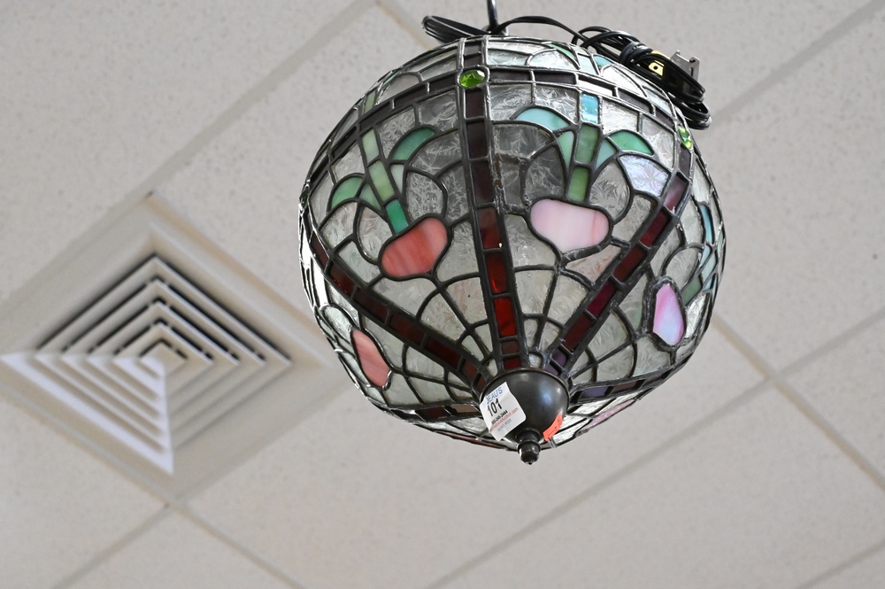 Leaded Glass Globe, having pink flowers, height 15 inches, diameter 10 1/2 inches.