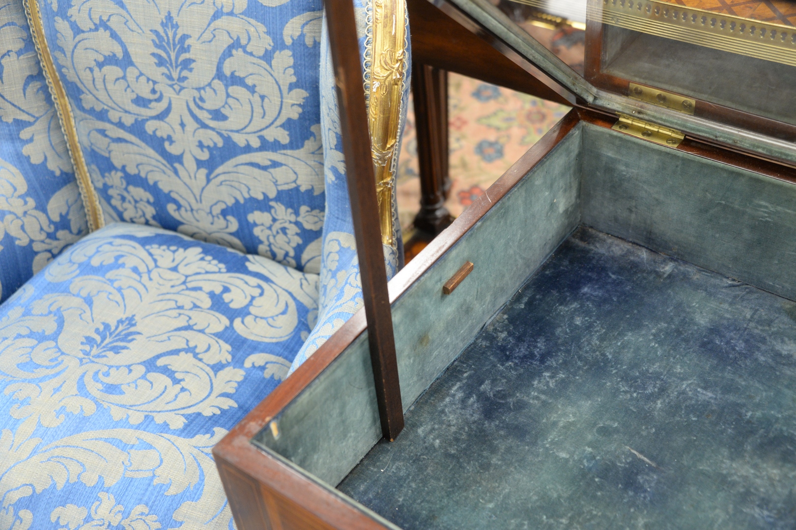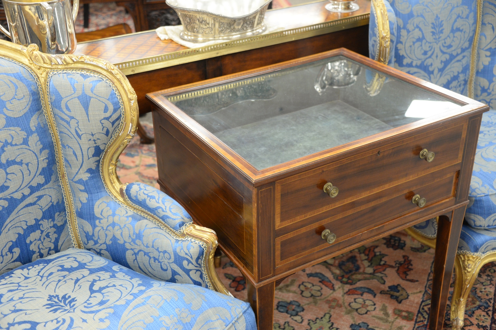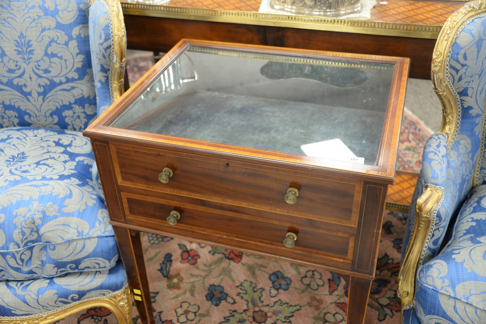 Lot 101: Mahogany Inlaid Vitrine, having two drawers over tapered legs on brass castors, height 31 inches, top 21 1/2 x 20.