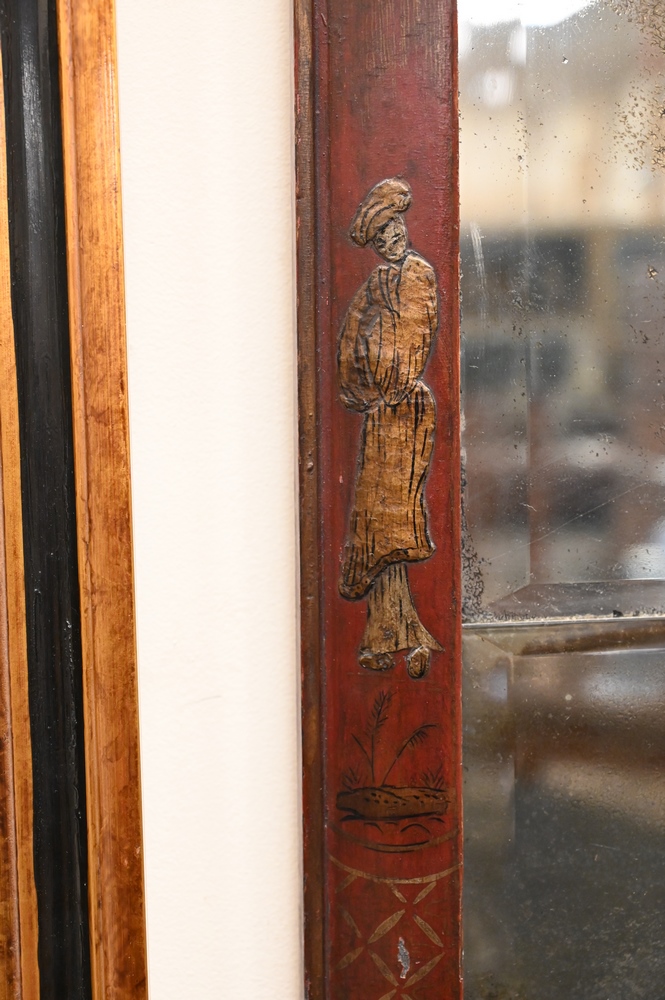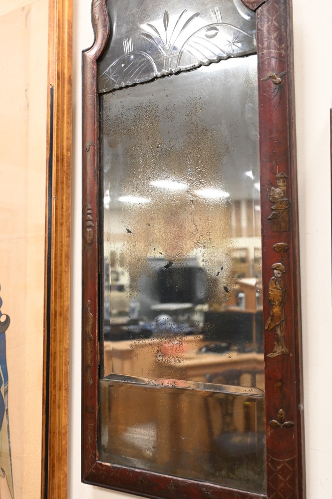Rare William III Carved Chinoiserie Decorated Pier Mirror, in three parts, divided upright arched mirror plate, paint and wood damage at top, engraved at center with star and basket of flowers over scalloped edge in conforming frame, red japanned border, having raised figures of people and birds, height 42 inches. Provenance: Lillian Blankley Cogan, 1988. Estate of Wallace Bradway, New Haven, CT.