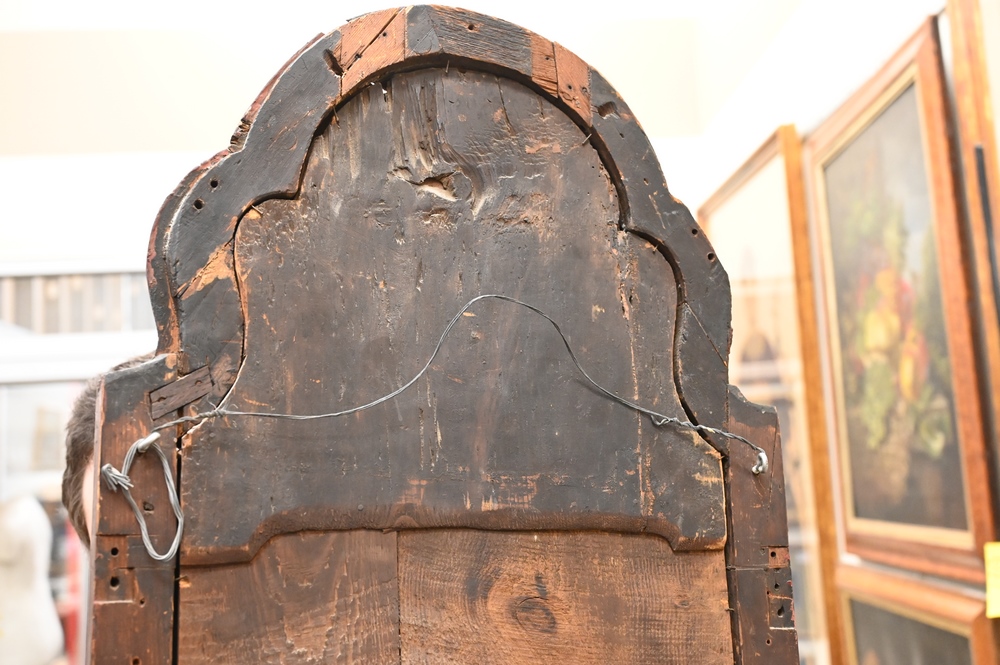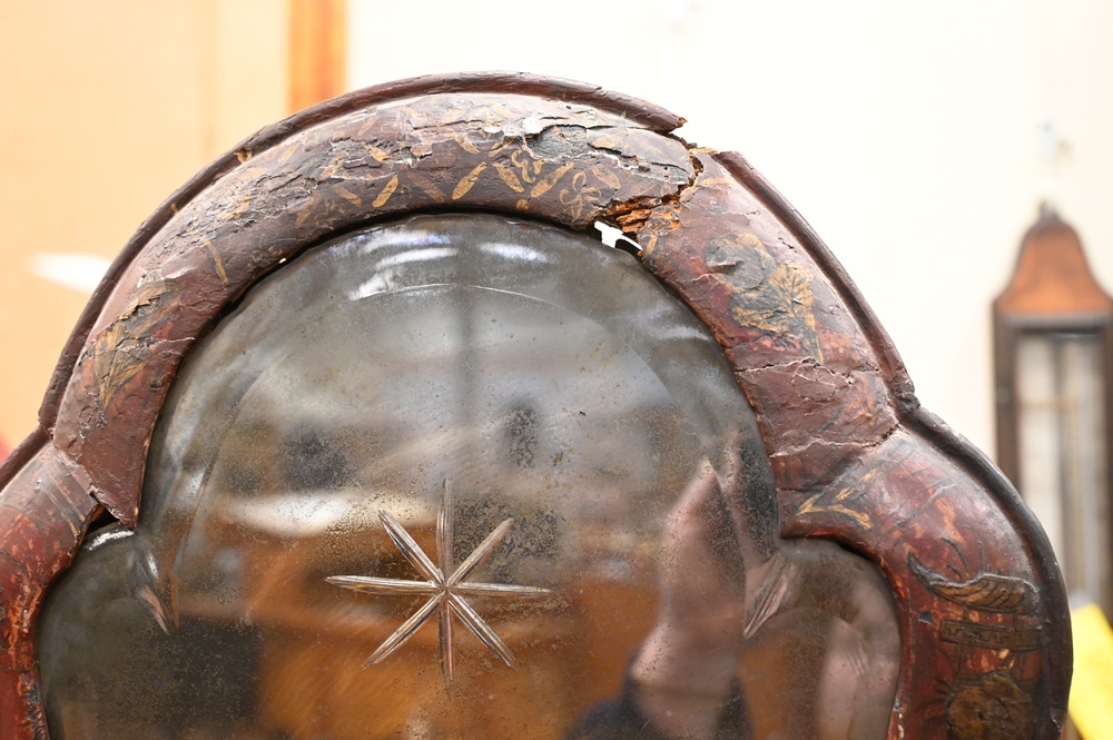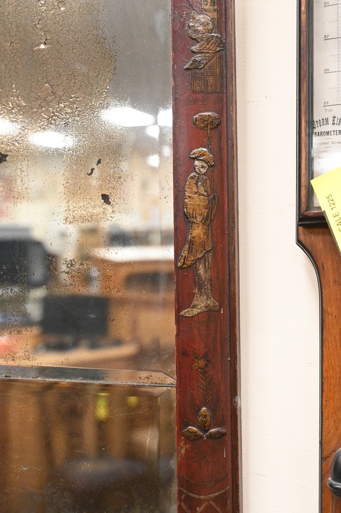Lot 101: Rare William III Carved Chinoiserie Decorated Pier Mirror, in three parts, divided upright arched mirror plate, paint and wood damage at top, engraved at center with star and basket of flowers over scalloped edge in conforming frame, red japanned border, having raised figures of people and birds, height 42 inches. Provenance: Lillian Blankley Cogan, 1988. Estate of Wallace Bradway, New Haven, CT.