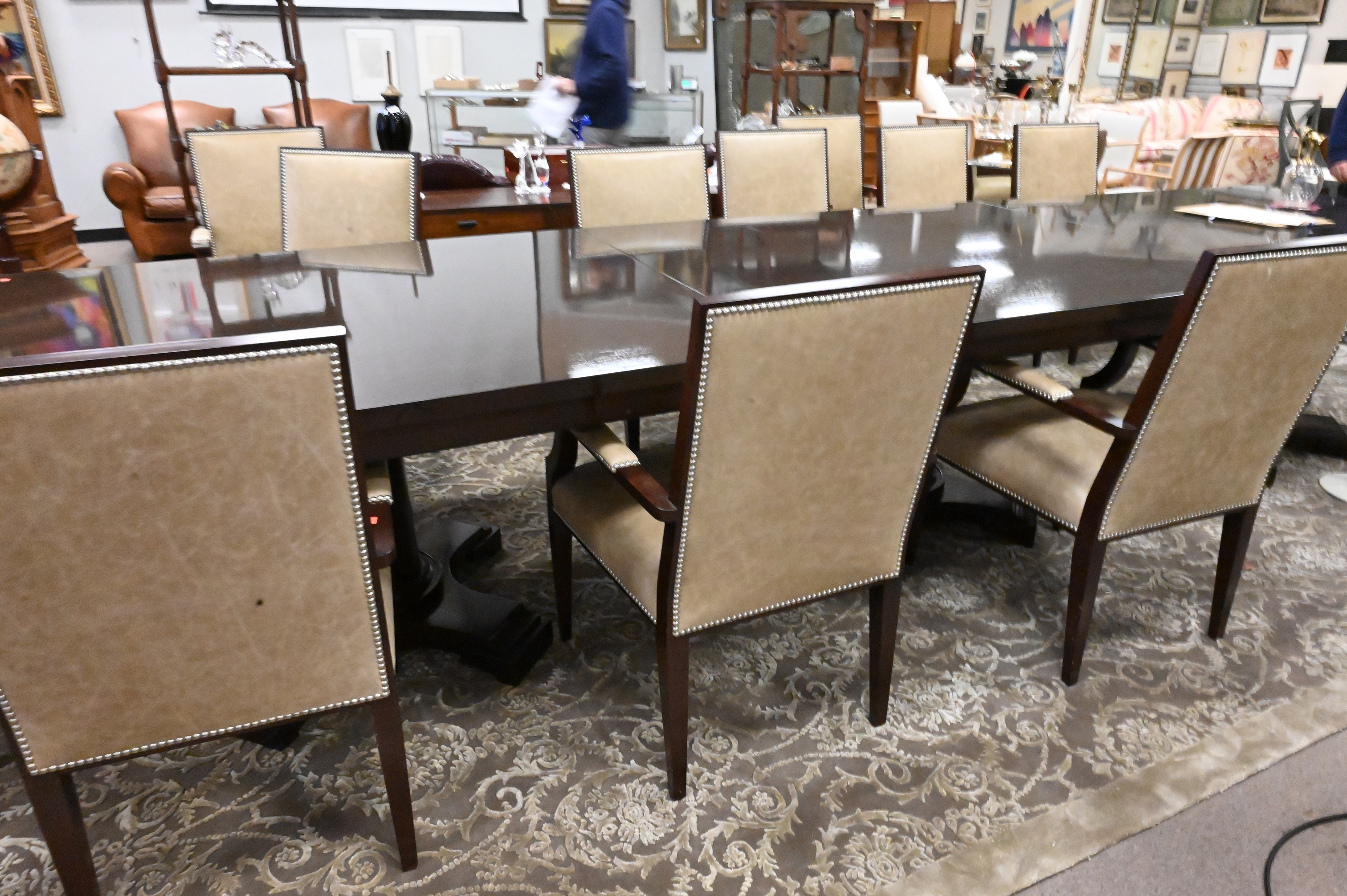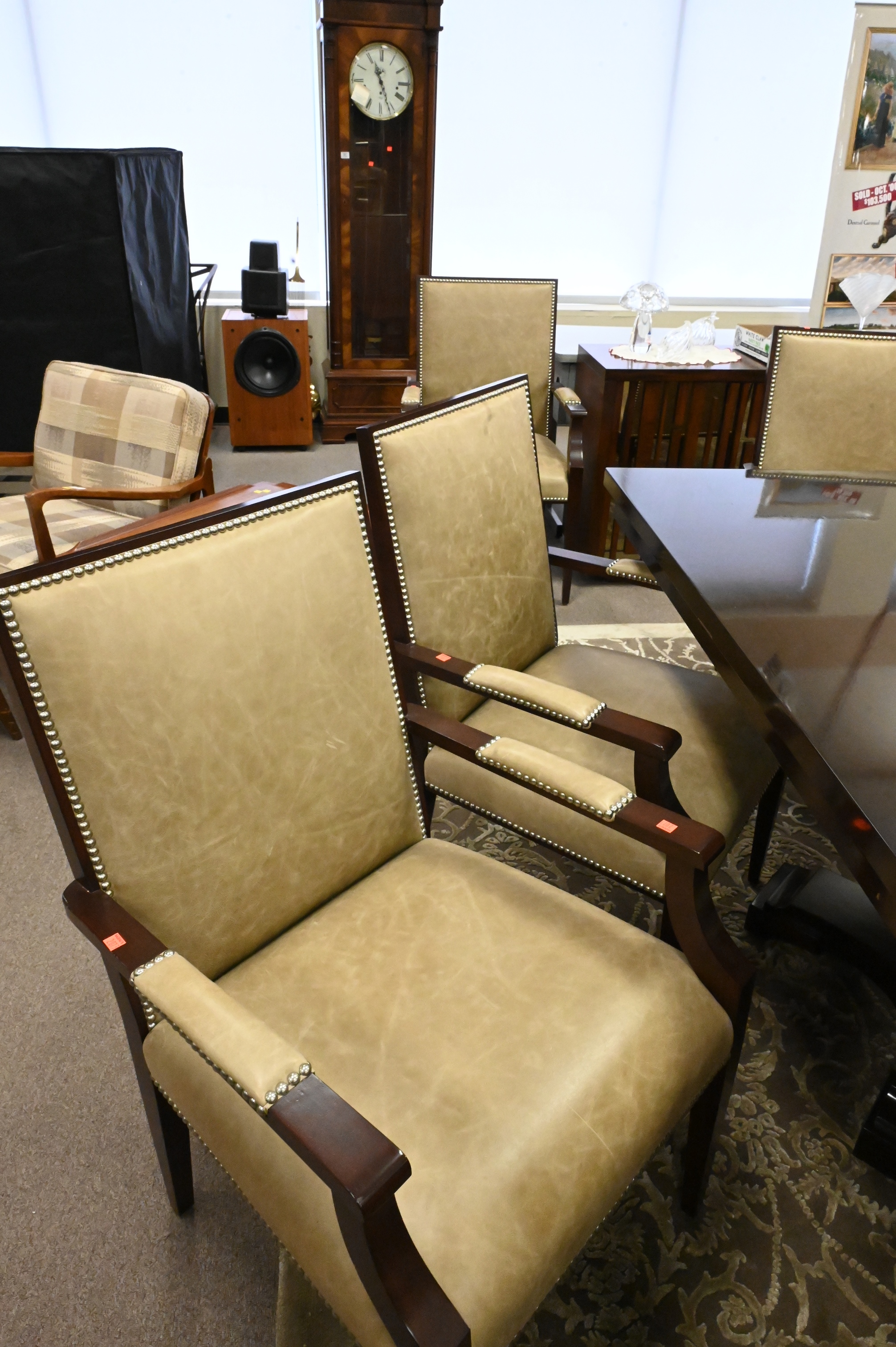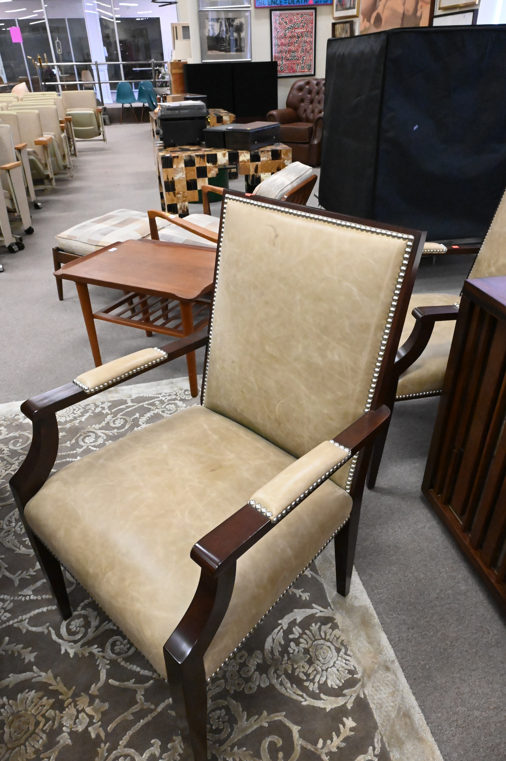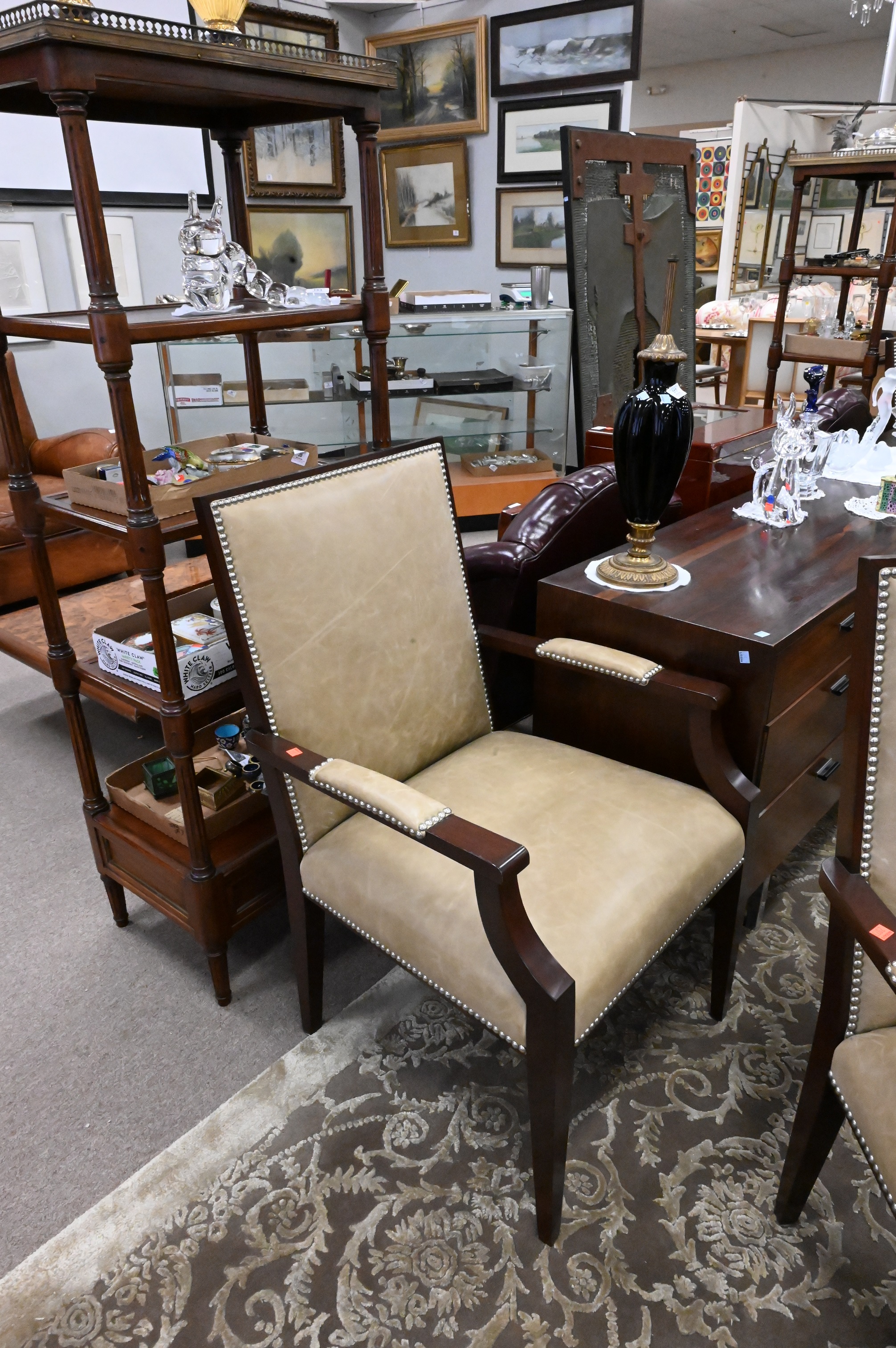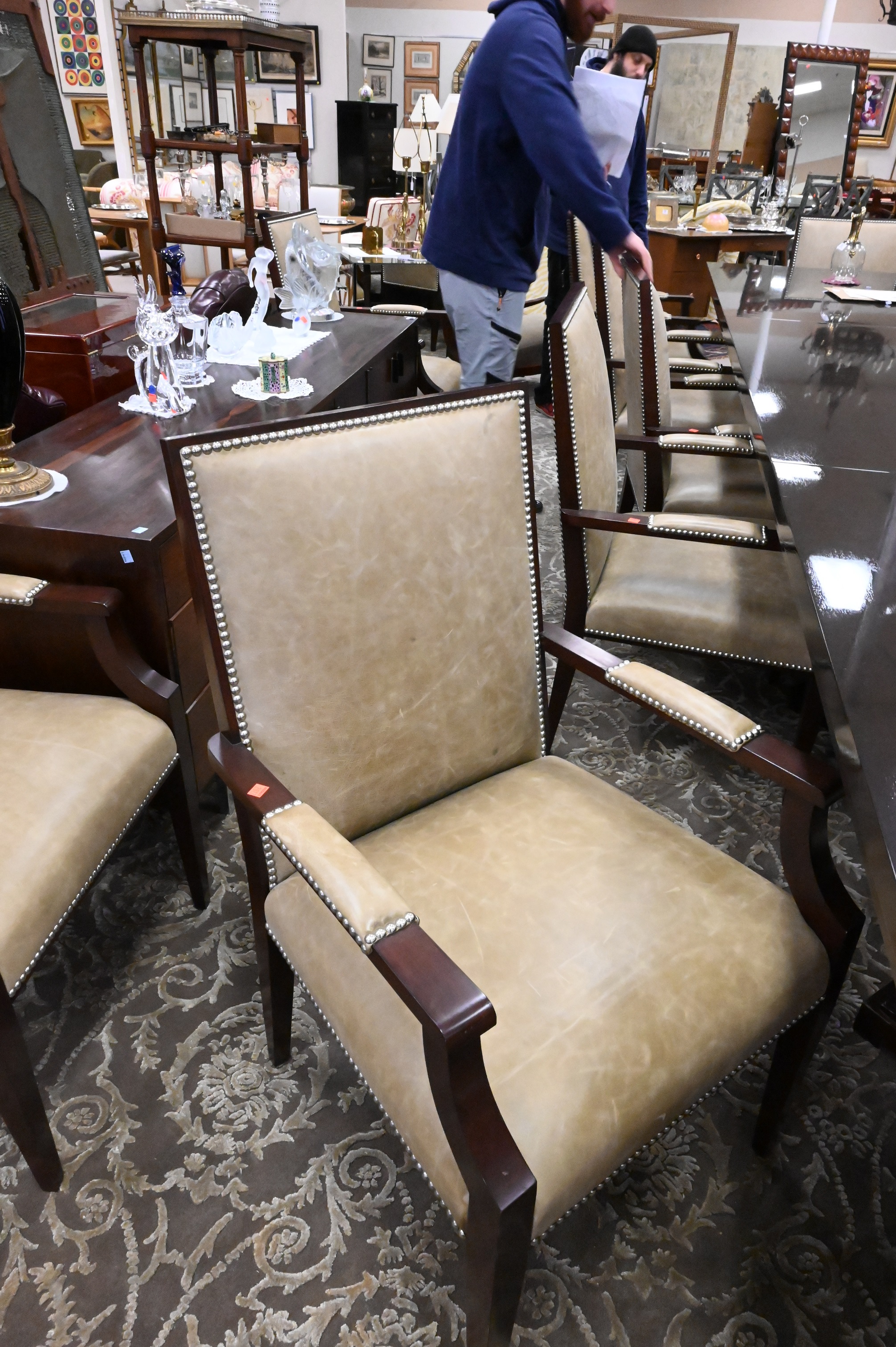 Set of 14 Modern Arm Chairs, Ralph Lauren style, having tan leather with pewter tacks on hardwood espresso frame, height 39 inches, seat height 18 inches, width 23 inches.