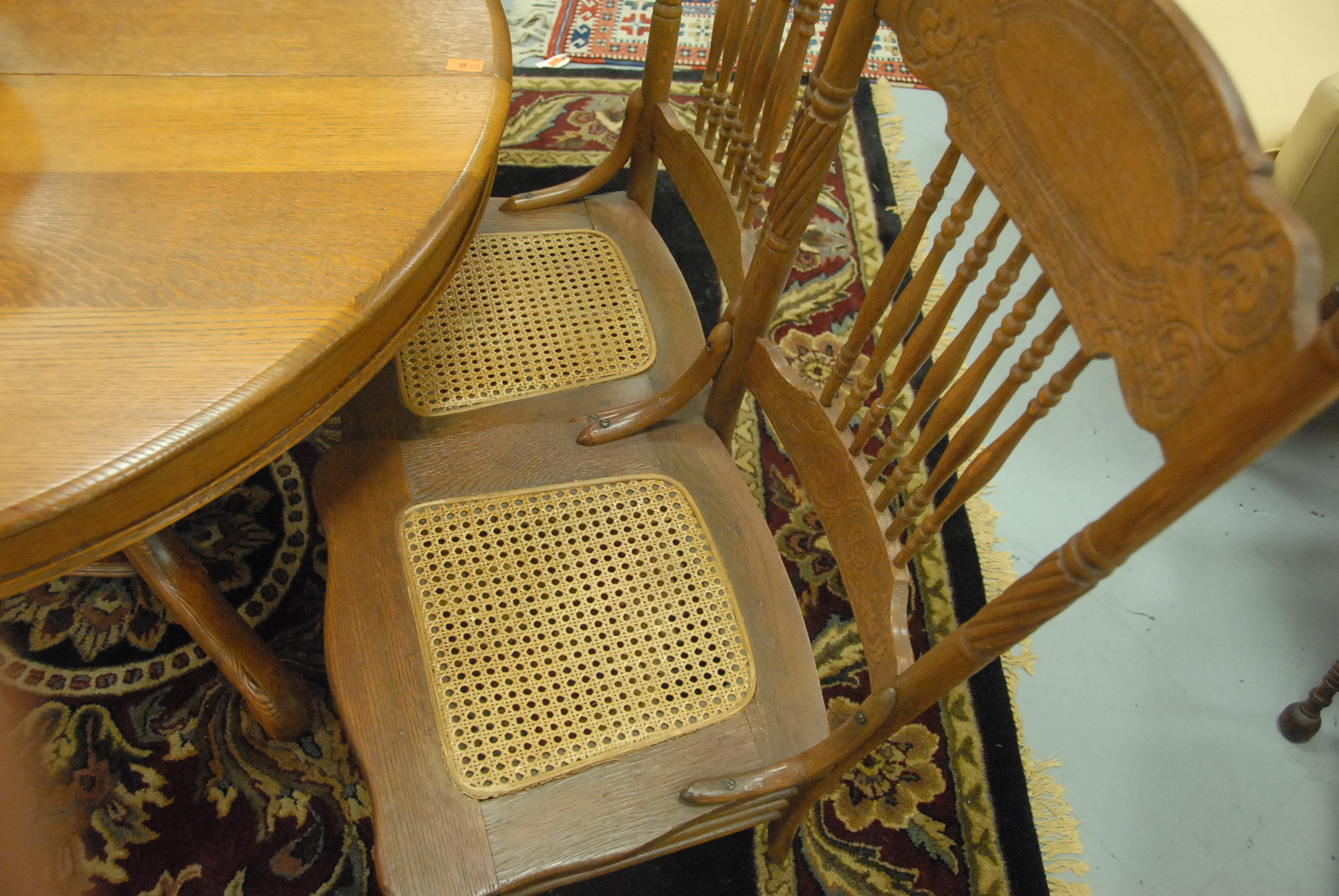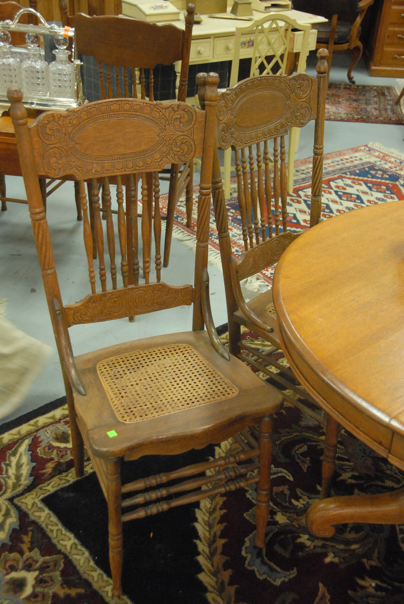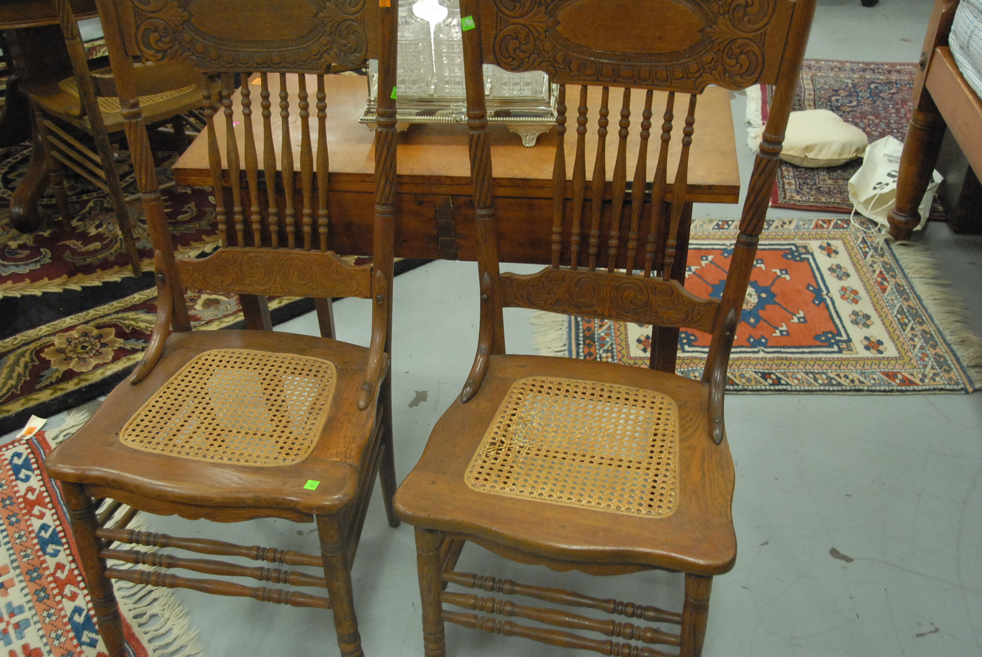 Lot 101: Set of six Victorian oak press back chairs with caned seats.