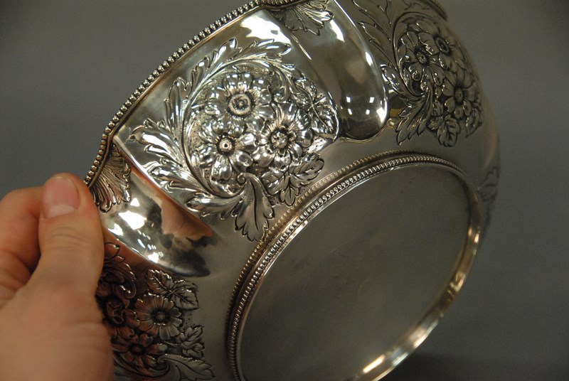 Sterling silver repousse bowl. dia. 8in. 10.1 t oz.