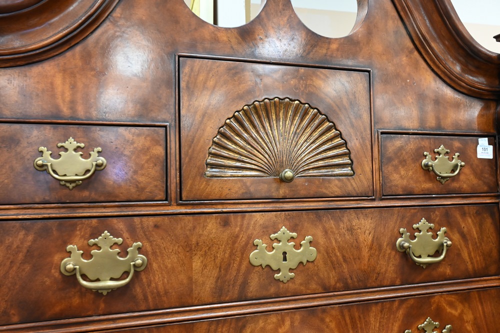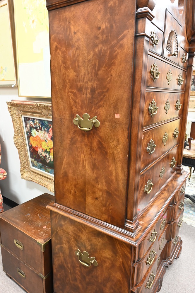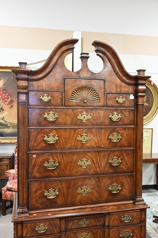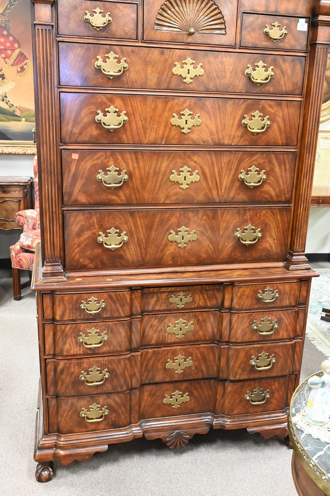 Lot 101: Theodore Alexander Mahogany Two Part Chest on Chest, on ball and claw feet, height 87 inches, upper case width 41 1/2 inches.