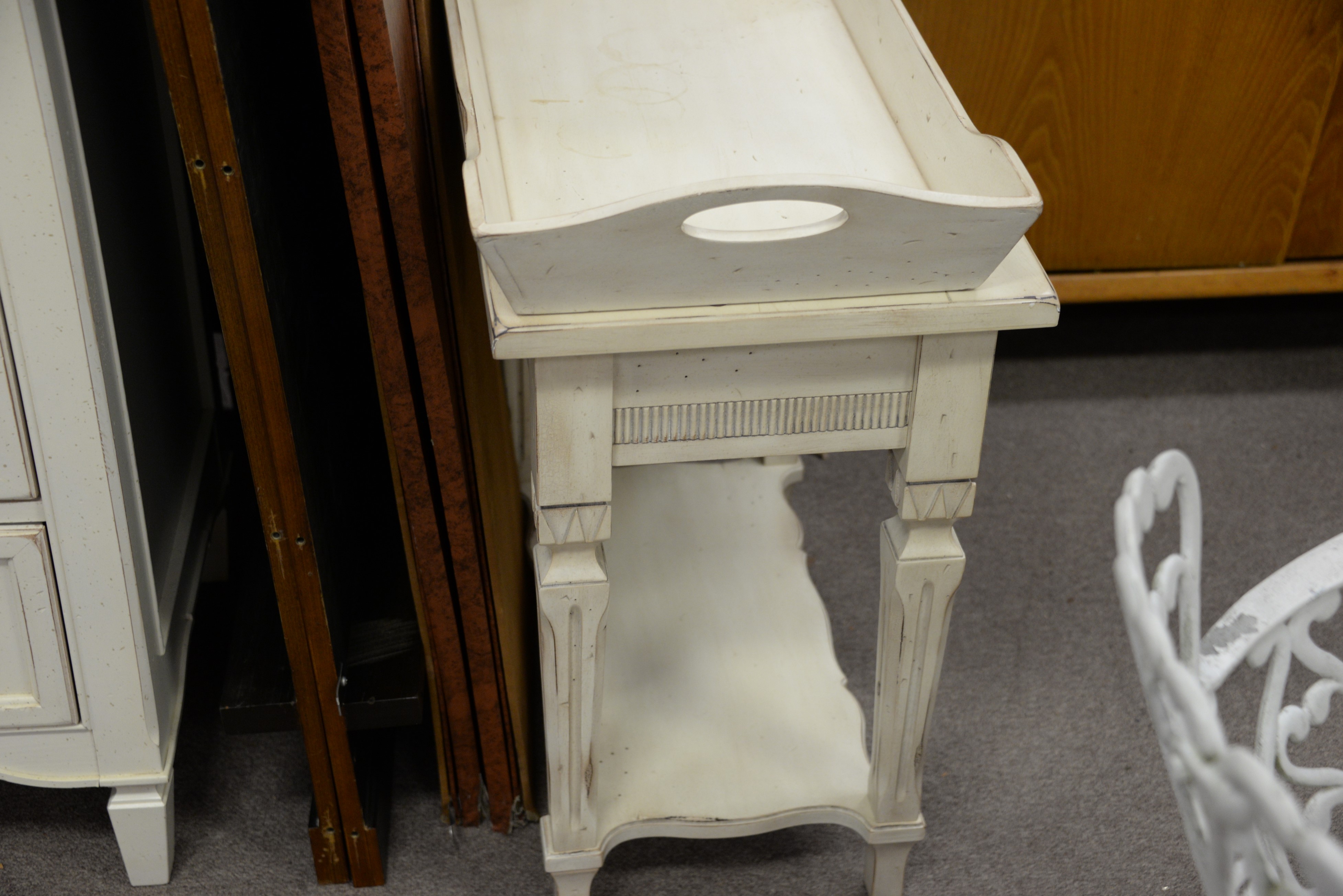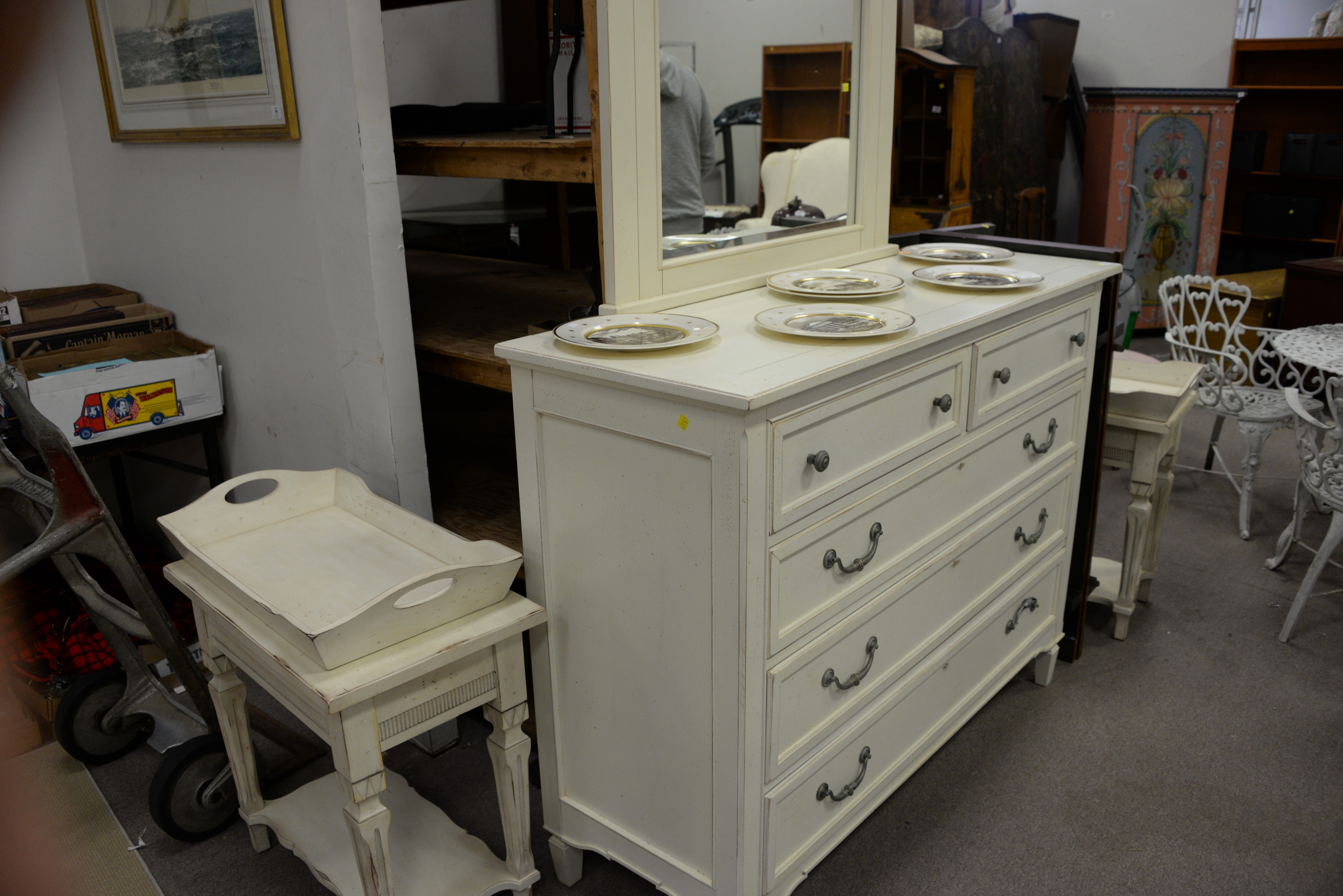 Three piece lot including Contemporary chest and mirror and a pair of Contemporary tables with removable tray tops. dresser: ht. 43 in. wd. 56 in. dp. 20 in., end tables: ht. 31 in. wd. 26 in. dp. 16 in.