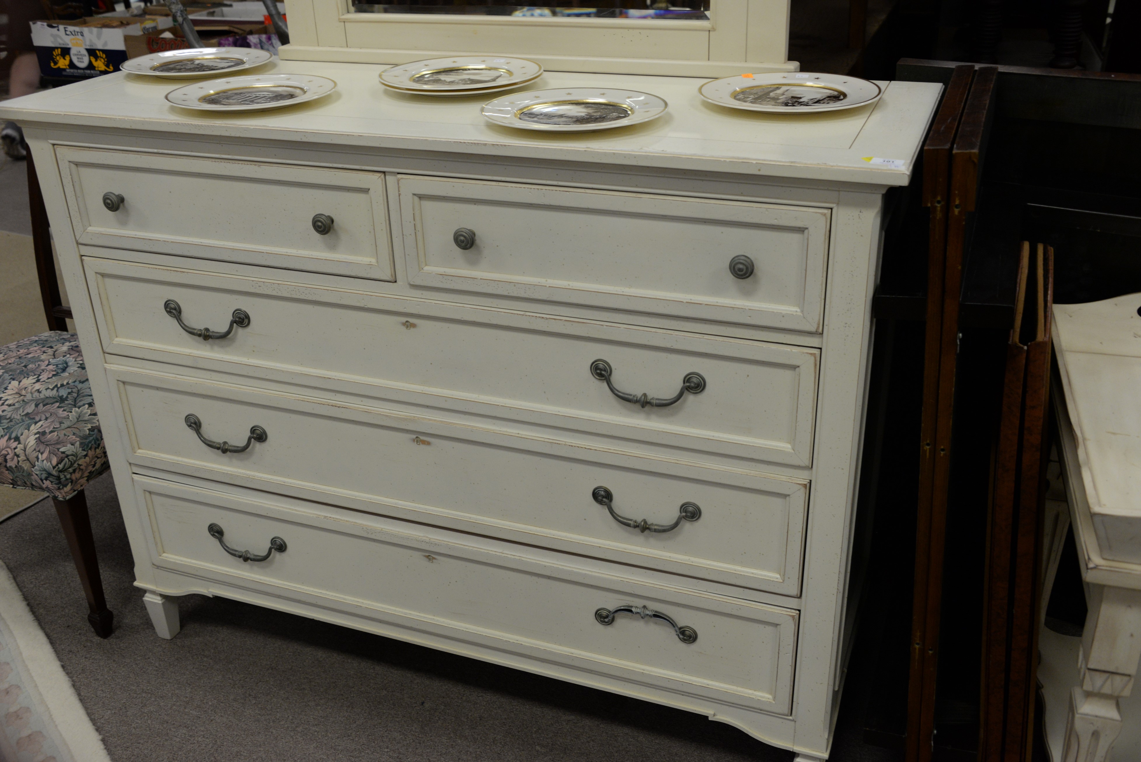 Lot 101: Three piece lot including Contemporary chest and mirror and a pair of Contemporary tables with removable tray tops. dresser: ht. 43 …